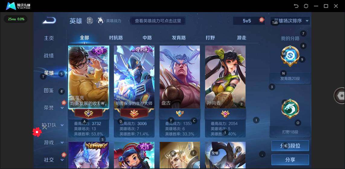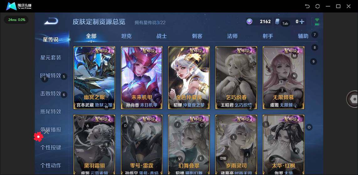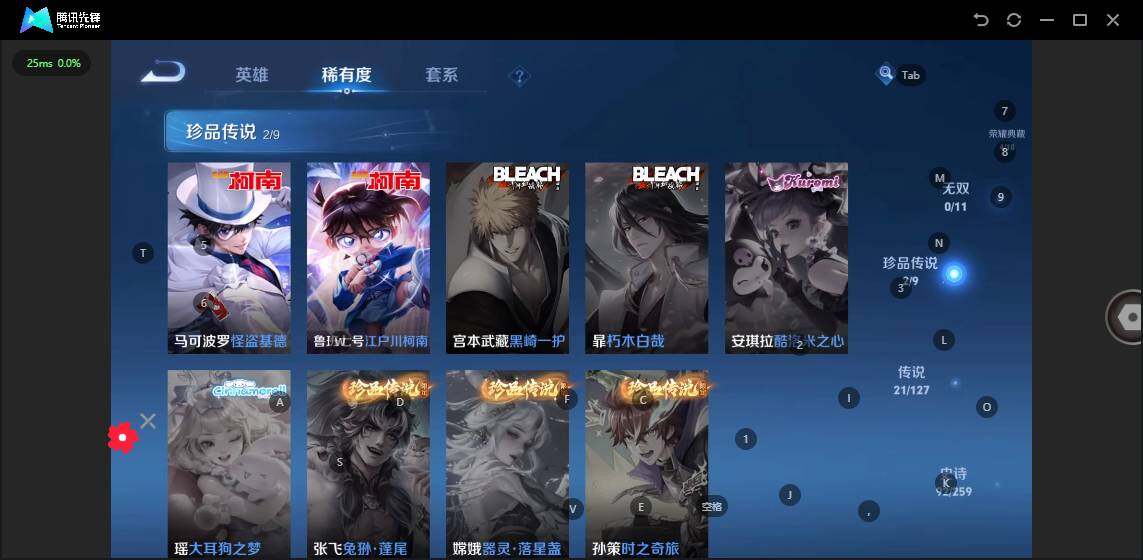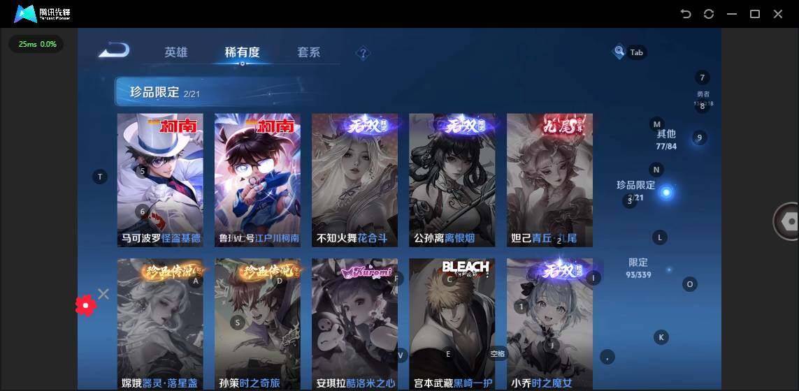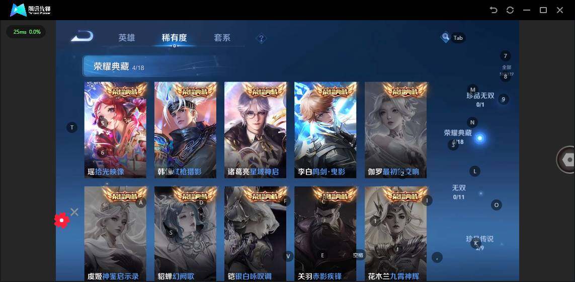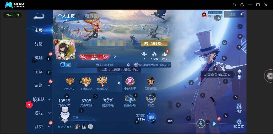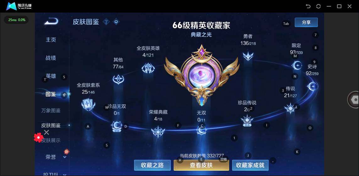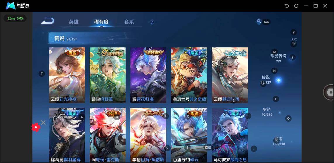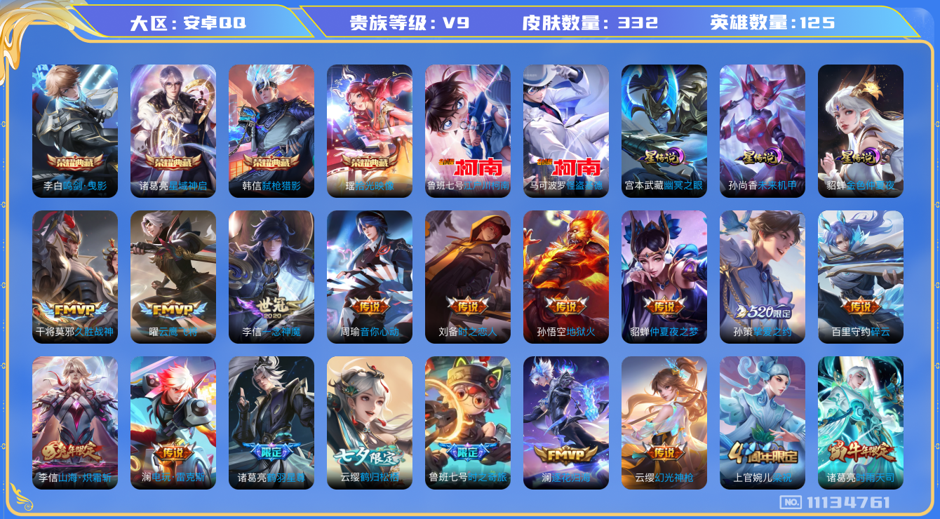 [11134761]贵族等级: V9 英雄数: 125 皮肤数: 332 荣耀水晶: 鸣剑·曳影,星域神启,弑枪猎影,拾光映像 珍品传说: 江户川柯南,怪盗基德 星传说: 未来机甲,幽冥之眼,金色仲夏夜 传说皮: 云鹰飞将,久胜战神,一念神魔,地狱火,仲夏夜之梦,音你心动-周瑜,时之恋人-刘备,挚爱之约,碎云,山海·炽霜斩,电玩·雷克斯,鹤羽星尊,鹤归松栖...