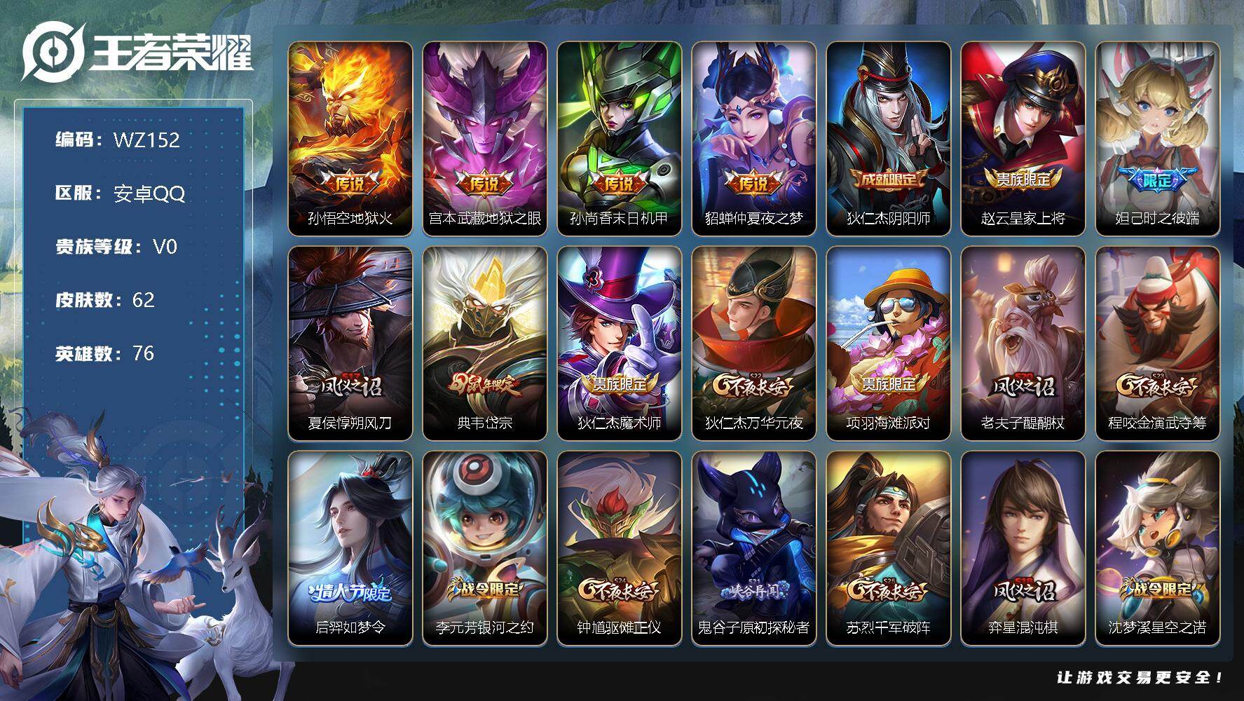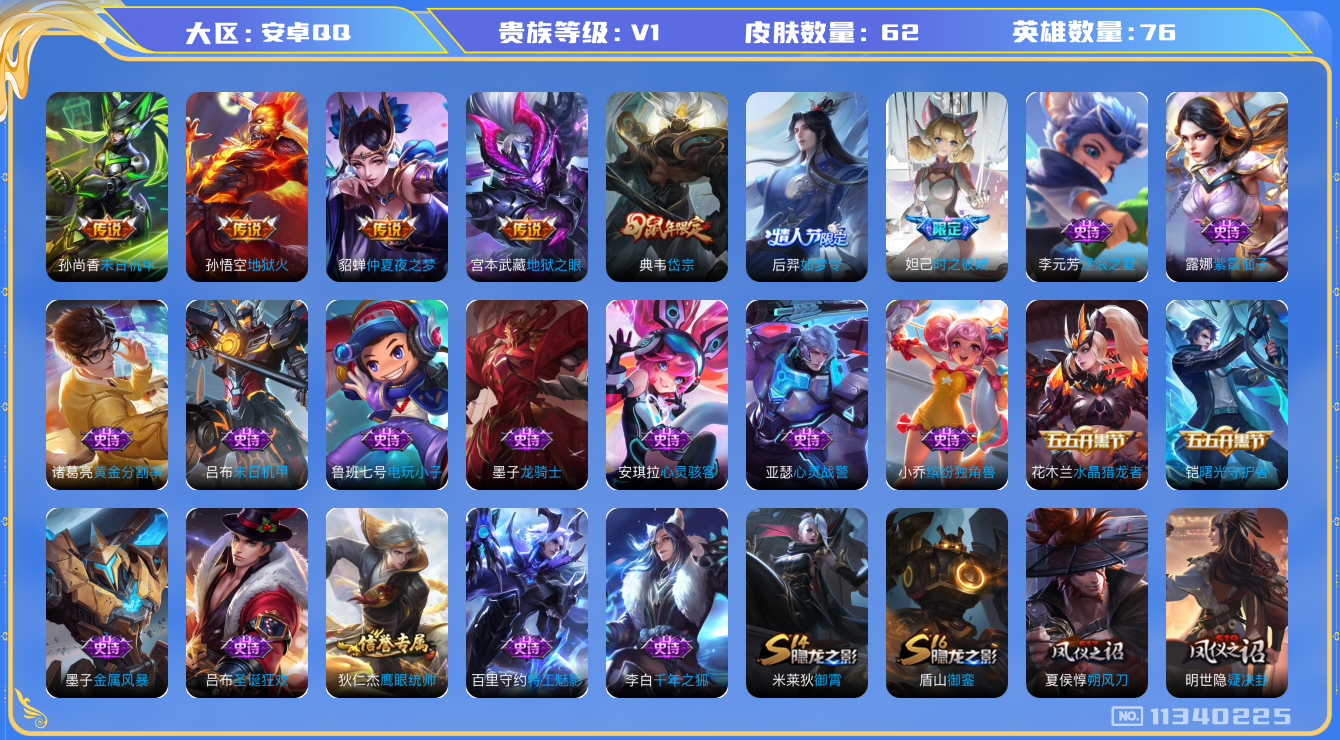 [11340225]【商品标题】:安卓Q-V0-秩序白银III段位-76英雄-62皮肤-0典藏-0珍品无双-0无双-0珍品传说-4传说-22史诗 【传说皮肤】:孙悟空地狱火,宫本武藏地狱之眼,孙尚香末日机甲,貂蝉仲夏夜之梦 【限定皮肤】:狄仁杰阴阳师,赵云皇家上将,妲己时之彼端,夏侯惇朔风刀,典韦岱宗,狄仁杰魔术师,狄仁杰万华元夜,...