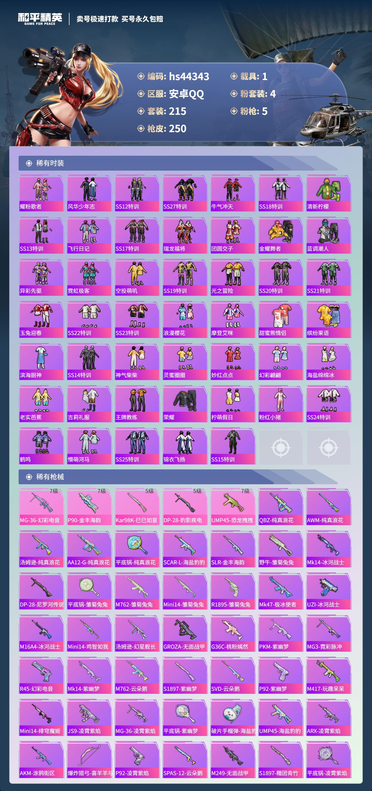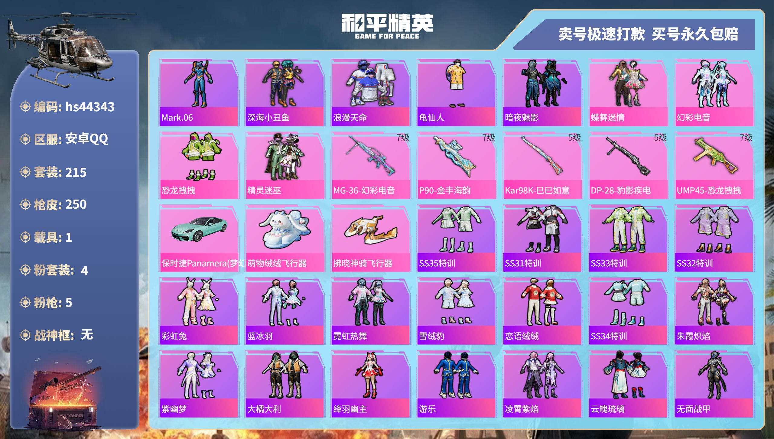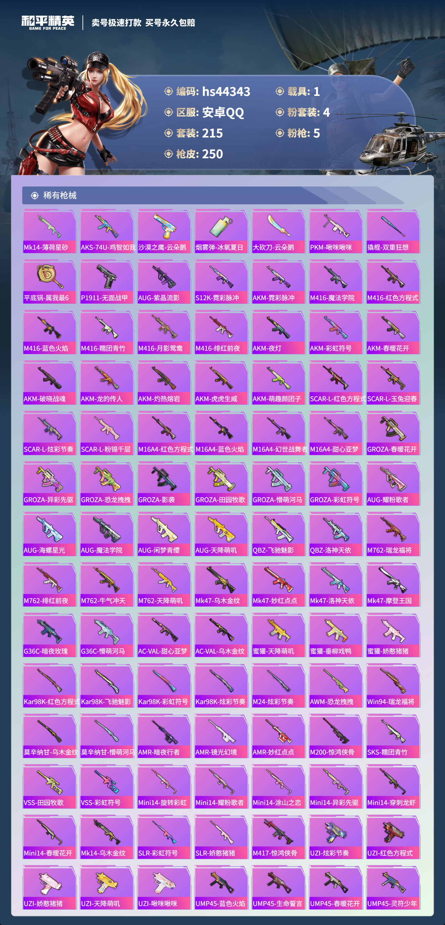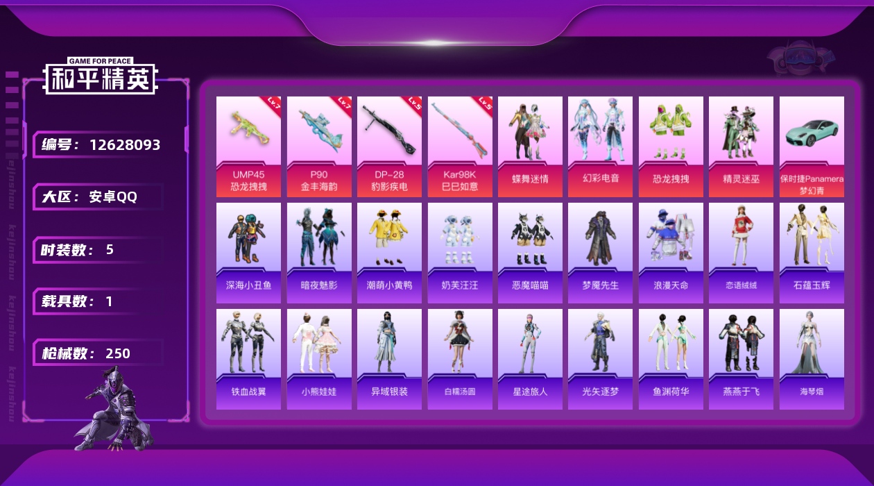 【10950376】【不可二次】【安卓QQ】龟仙人 恐龙拽拽 P90-金丰海韵 拂晓神骑飞行器 精灵迷巫 M762-瑞龙福将 潮萌小黄鸭 黑色刀锋 极速红龙 萌物绒绒飞行器 UMP45-恐龙拽拽 豚鼠丹丹 AUG-魔法学院 粉红小猪 深海小丑鱼 瑞龙福将 激萌小黄鸭 蝶舞迷情 风华少年志 浪漫天命 M416-魔法学院 纯白誓言 团圆交子