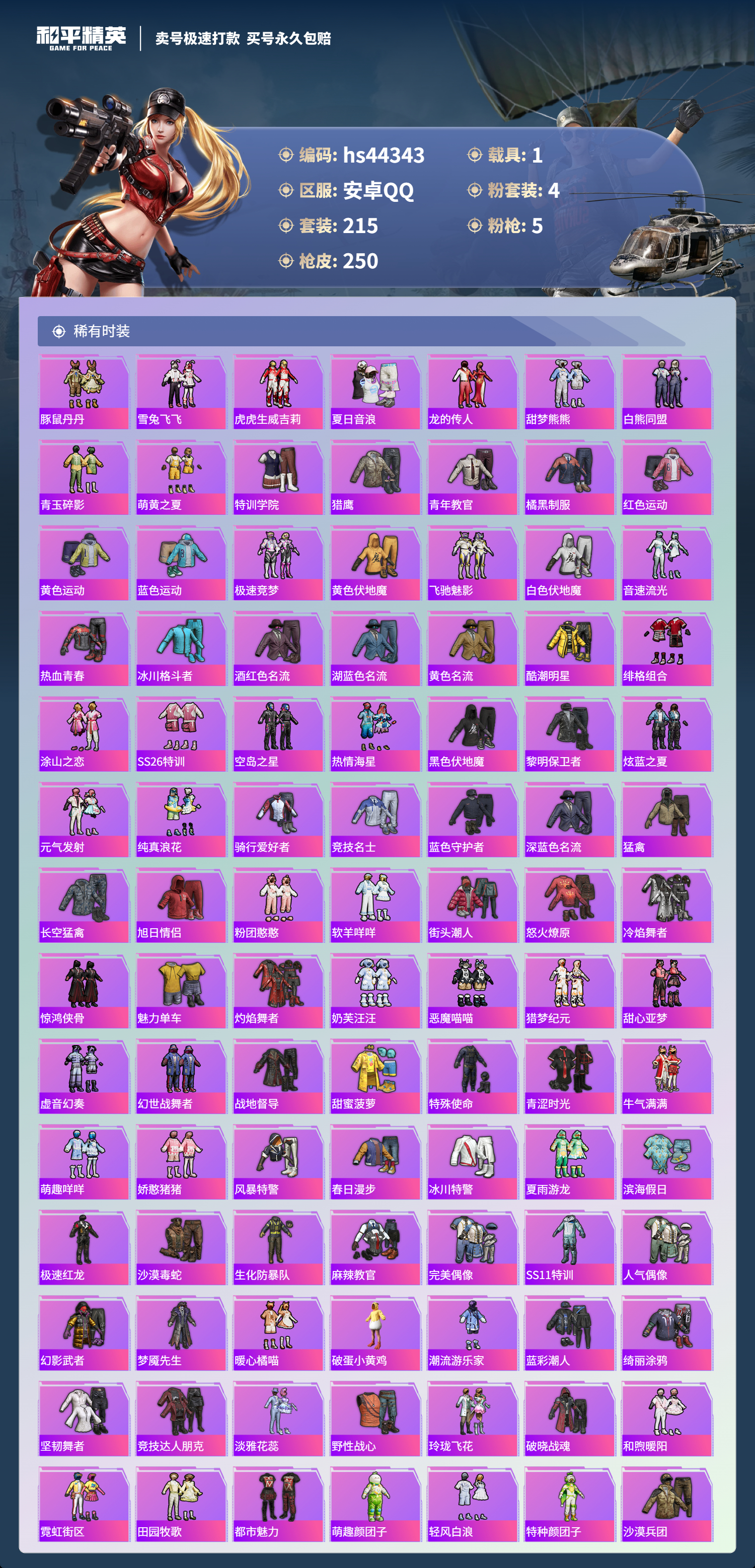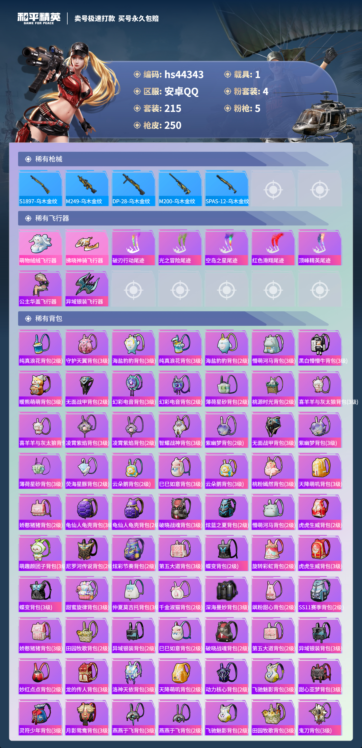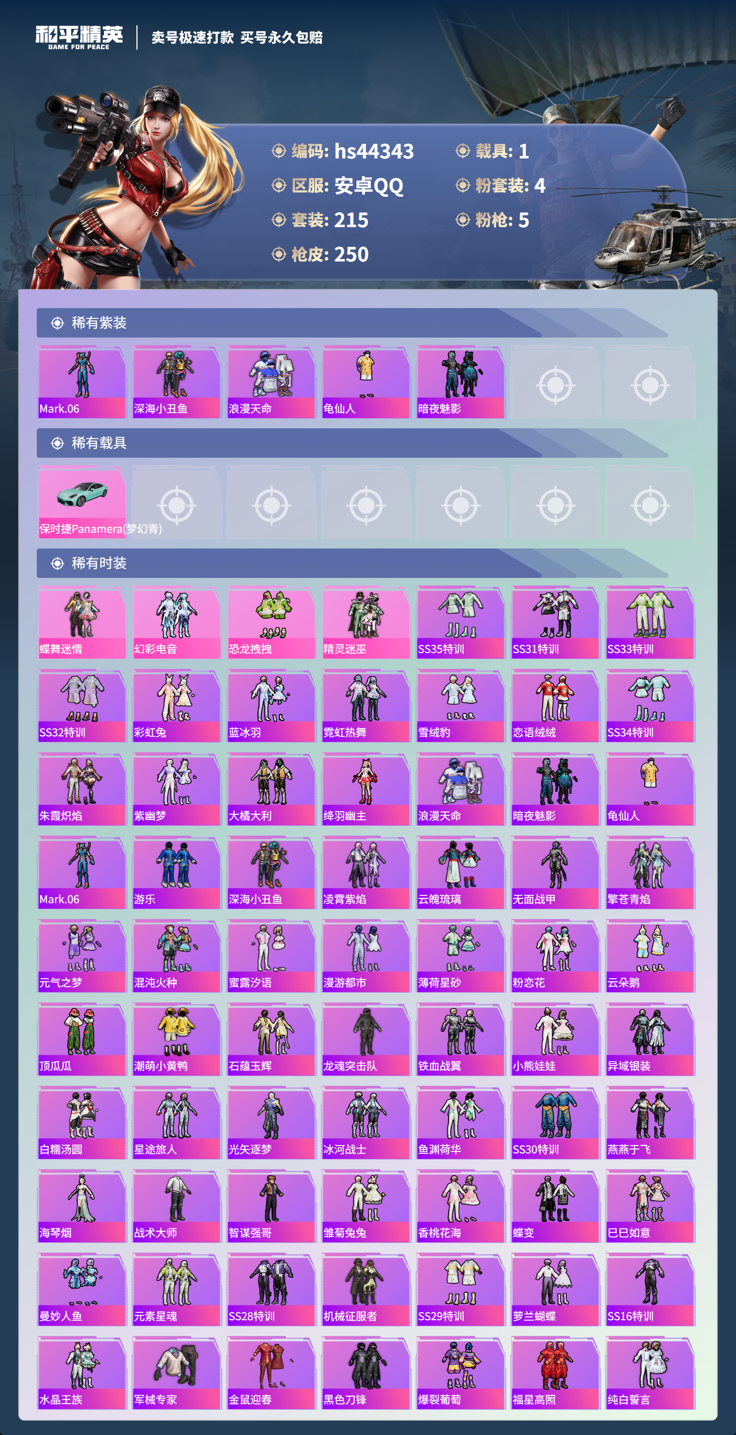 【10950376】【不可二次】【安卓QQ】龟仙人 恐龙拽拽 P90-金丰海韵 拂晓神骑飞行器 精灵迷巫 M762-瑞龙福将 潮萌小黄鸭 黑色刀锋 极速红龙 萌物绒绒飞行器 UMP45-恐龙拽拽 豚鼠丹丹 AUG-魔法学院 粉红小猪 深海小丑鱼 瑞龙福将 激萌小黄鸭 蝶舞迷情 风华少年志 浪漫天命 M416-魔法学院 纯白誓言 团圆交子