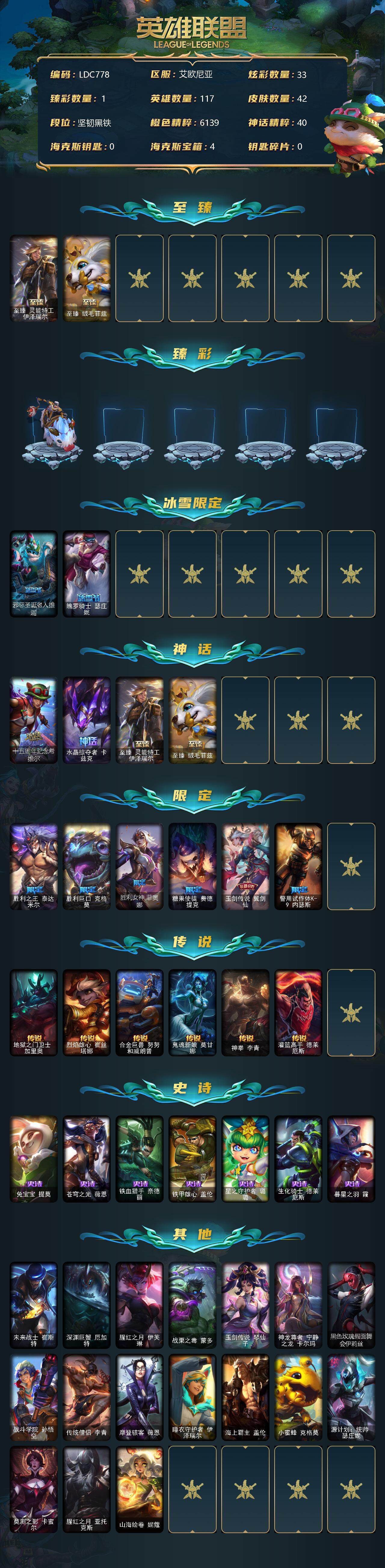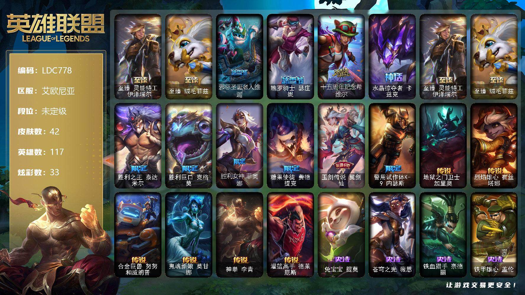 【10954540】【LDC778】117英雄/42皮肤/4神话/8限定/1臻彩/33炫彩/6传说/7史诗/未定级/至臻灵能特工伊泽瑞尔/至臻绒毛菲兹/无畏骑士瑟庄妮赤子初心/邪恶圣诞老人维迦/魄罗骑士瑟庄妮/十五周年纪念希维尔/水晶掠夺者卡兹克/胜利之王泰达米尔/胜利巨口克格莫/胜利女神菲奥娜/糖果使徒费德提克/玉剑传说翼剑仙/警用试作体K-9内瑟斯/地狱之门卫士加里奥/烈焰雄心崔丝塔娜/合金