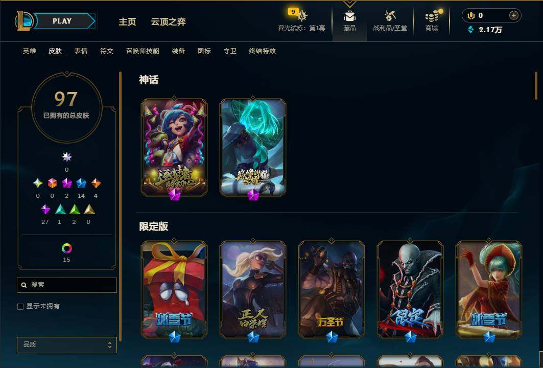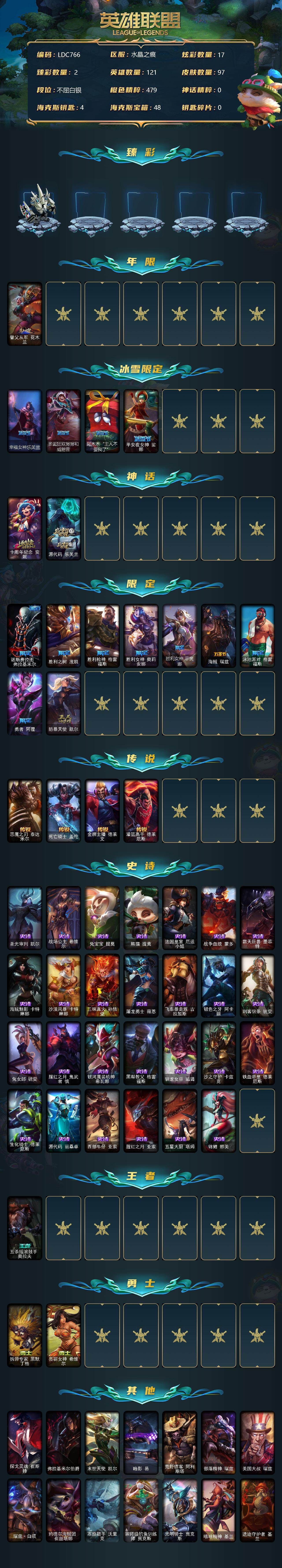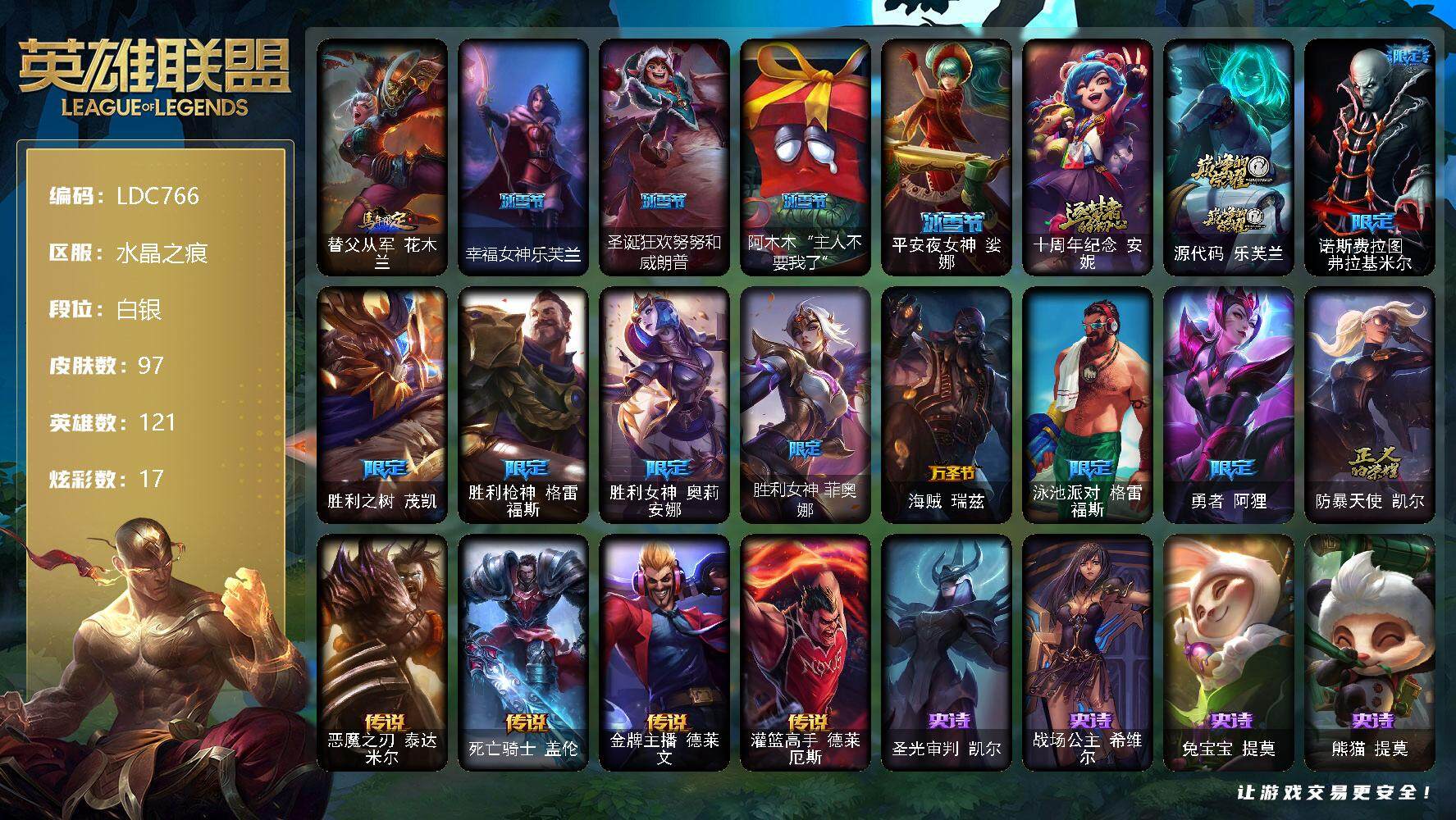【10954609】【LDC766】121英雄/97皮肤/2神话/14限定/2臻彩/17炫彩/4传说/27史诗/白银账号等级:105/霸天巨兽雪崩墨菲特/红莲之刃锐雯/替父从军花木兰/幸福女神乐芙兰/圣诞狂欢努努和威朗普/阿木木:“主人不要我了”/平安夜女神娑娜/十周年纪念安妮/源代码乐芙兰/诺斯费拉图费拉基米尔/胜利之树茂凯/胜利枪神格雷福斯/胜利女神奥莉安娜/胜利女神菲奥娜/海贼瑞兹/泳池派