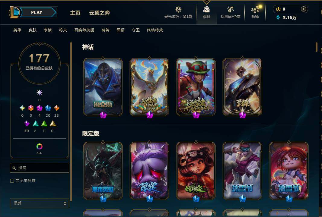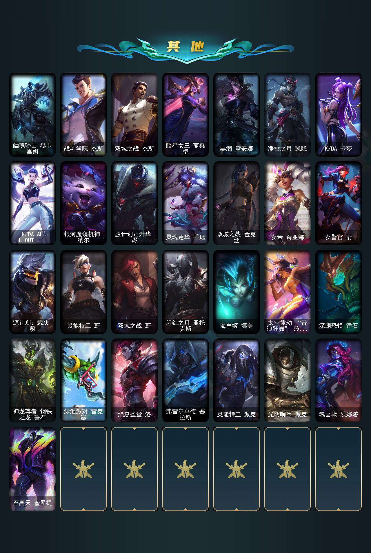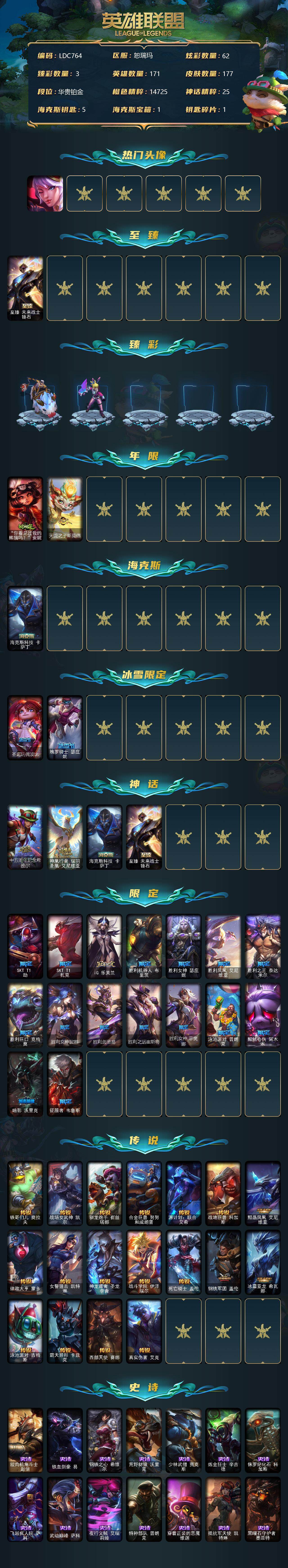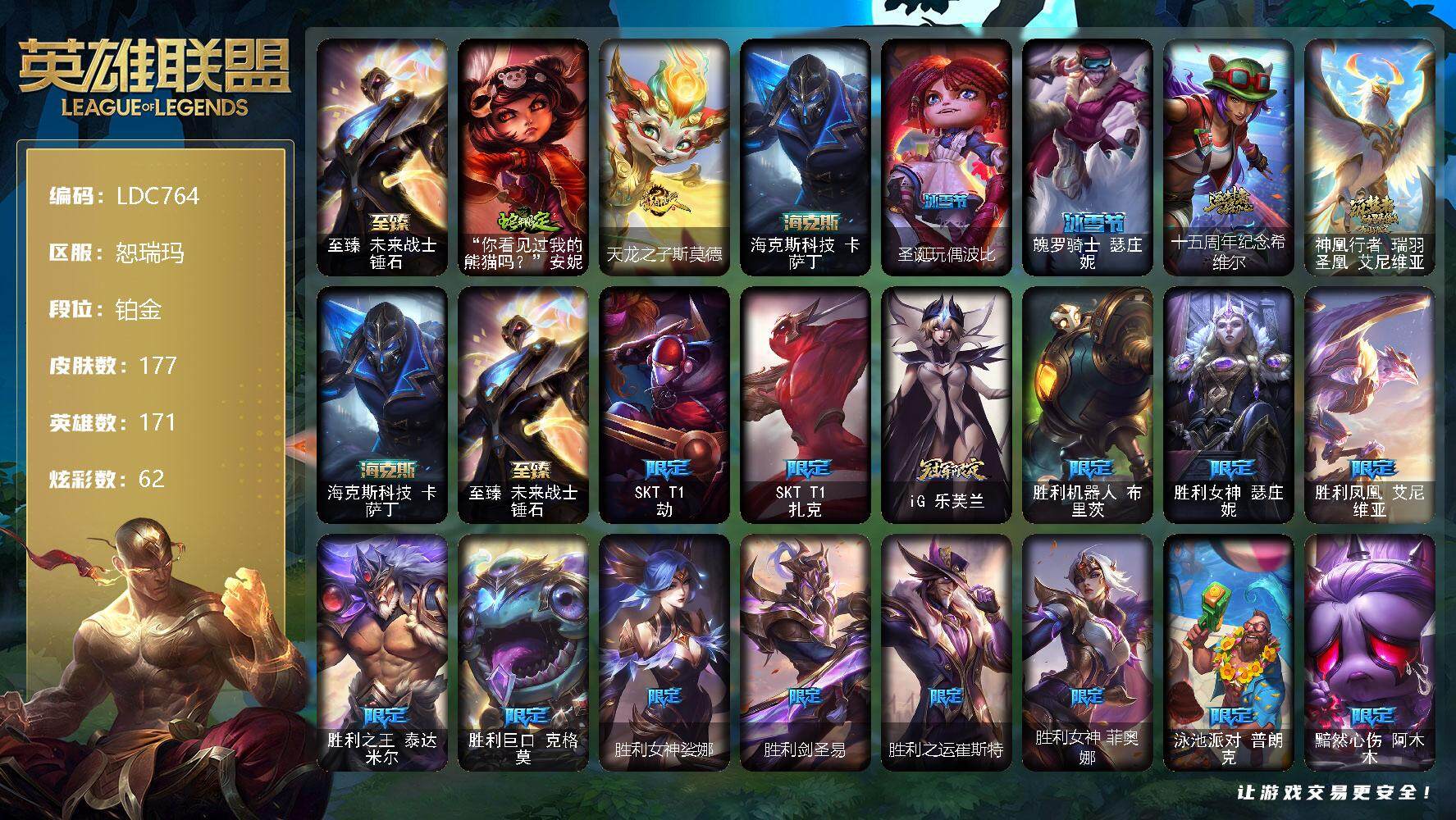 【10954613】【LDC764】171英雄/177皮肤/4神话/20限定/3臻彩/62炫彩/18传说/40史诗/铂金账号等级:520/觅心之翼奎因/至臻未来战士锤石/无畏骑士瑟庄妮赤子初心/幻灵战斗兔锐雯梦幻强袭/魔女阿卡丽虚荣/“你看见过我的熊猫吗?”安妮/天龙之子斯莫德/海克斯科技卡萨丁/圣诞玩偶波比/魄罗骑士瑟庄妮/十五周年纪念希维尔/神凰行者瑞羽凤凰艾尼维亚/SKTT1劫/SKTT1