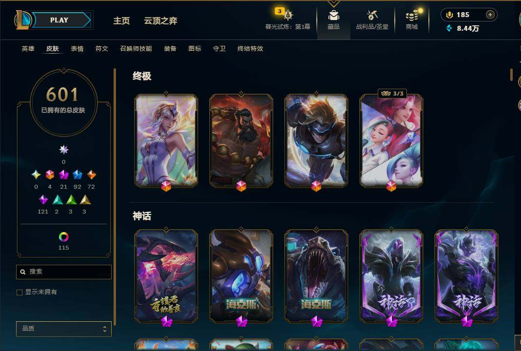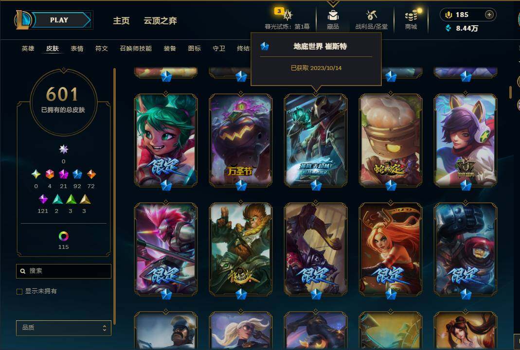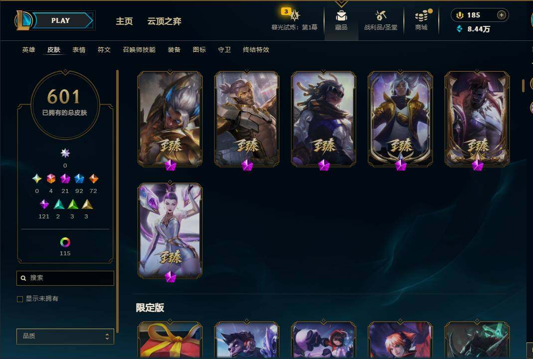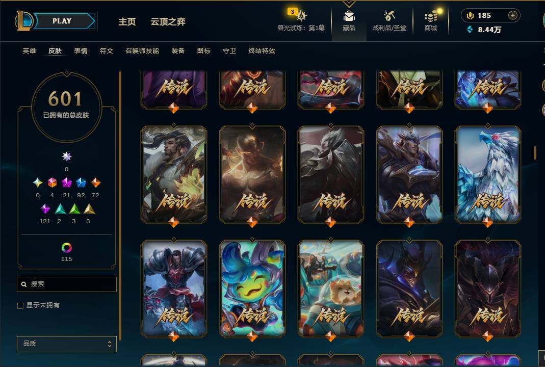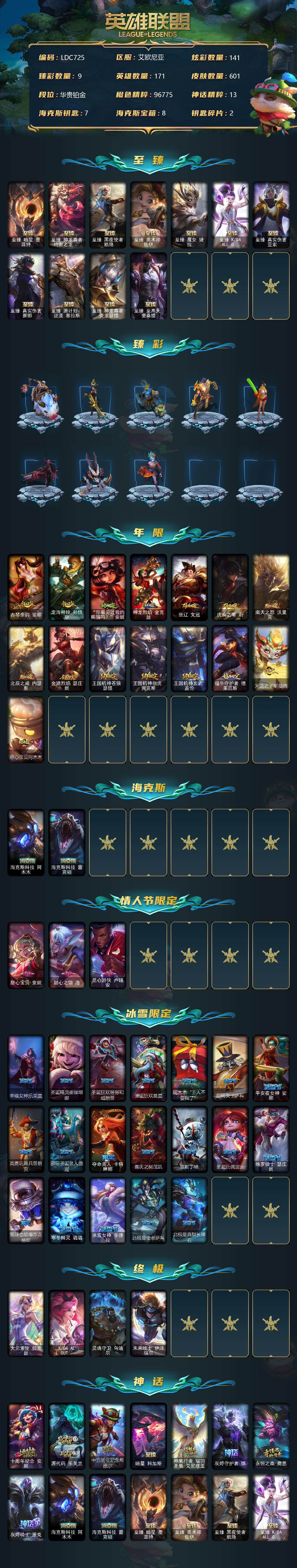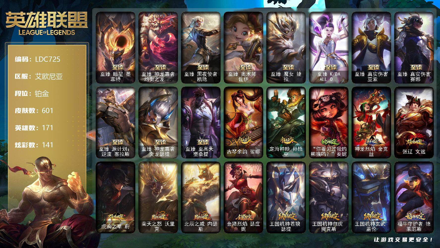 【10954661】【LDC725】171英雄/601皮肤/6终极/21神话/92限定/9臻彩/141炫彩/72传说/121史诗/铂金账号等级:752/至臻暗星墨菲特/至臻神龙尊者均衡之龙沃利贝尔/至臻黑夜使者凯隐/至臻奥术师佐伊/至臻魔女婕拉/至臻K/DAALLOUT卡莎/至臻真实伤害亚索/至臻真实伤害赛娜/至臻源计划:逆流塞拉斯/至臻神龙尊者炎龙瑟提/至臻至高天奎桑提/无畏骑士瑟庄妮赤子初心