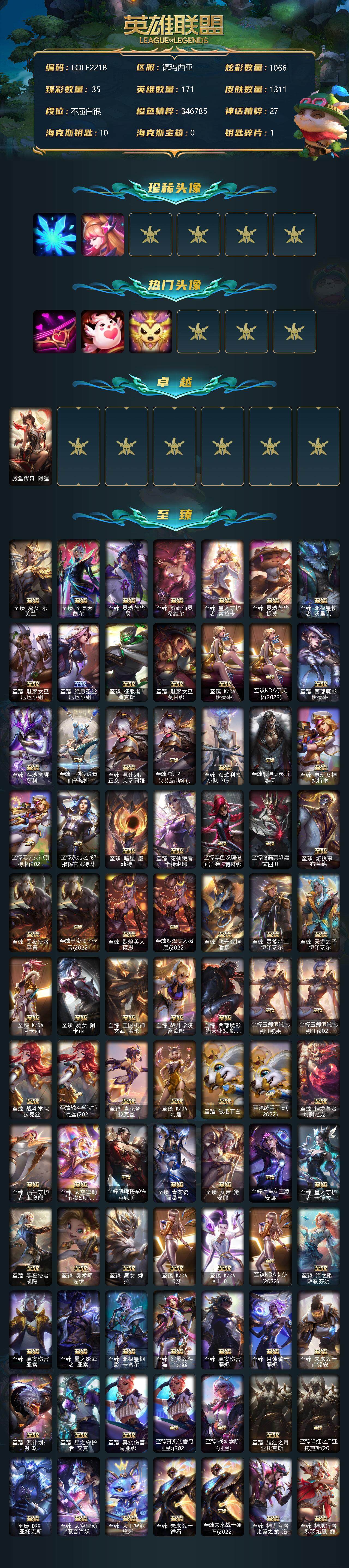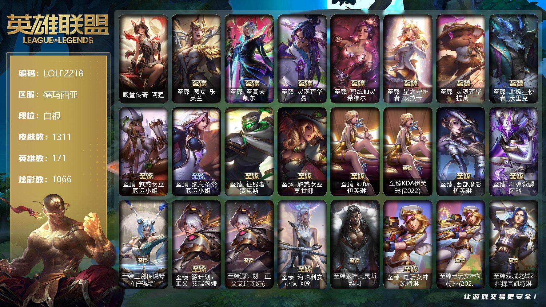 【10967909】【LOLF2218】171英雄/1311皮肤/9终极/121神话/232限定/35臻彩/1066炫彩/117传说/214史诗/白银/雪花/星守阿狸/爱情之歌/爱情鸽/星守索拉卡/殿堂传奇阿狸/至臻魔女乐芙兰/至臻至高天凯尔/至臻灵魂莲华易/至臻剪纸仙灵希维尔/至臻星之守护者索拉卡/至臻灵魂莲华提莫/至臻北极星使者沃里克/至臻魅惑女巫厄运小姐/至臻绝息圣堂厄运小姐/至臻征服者贾