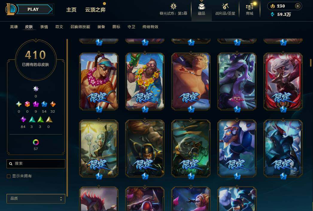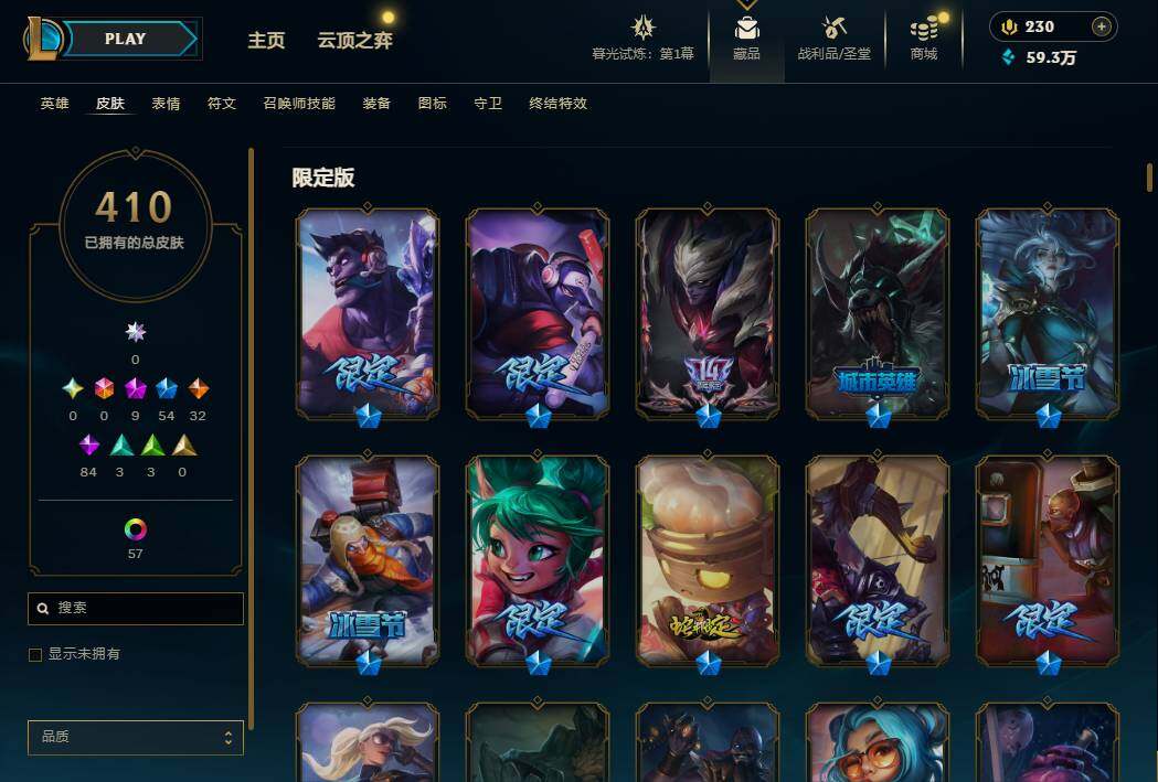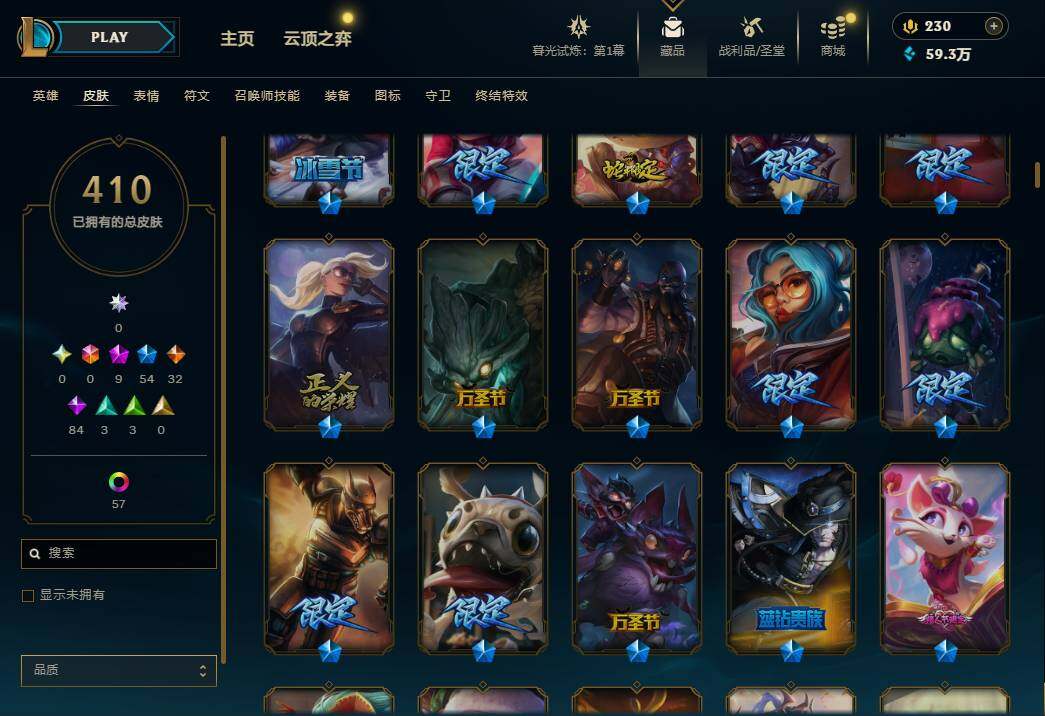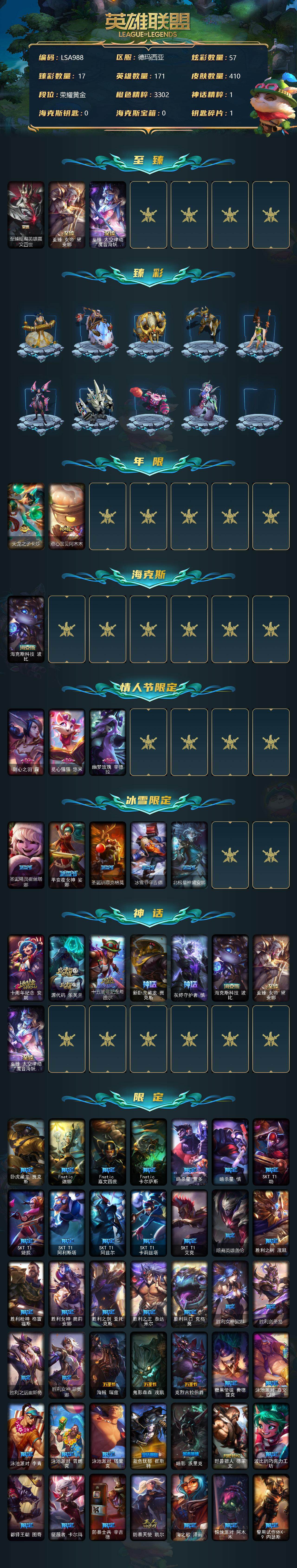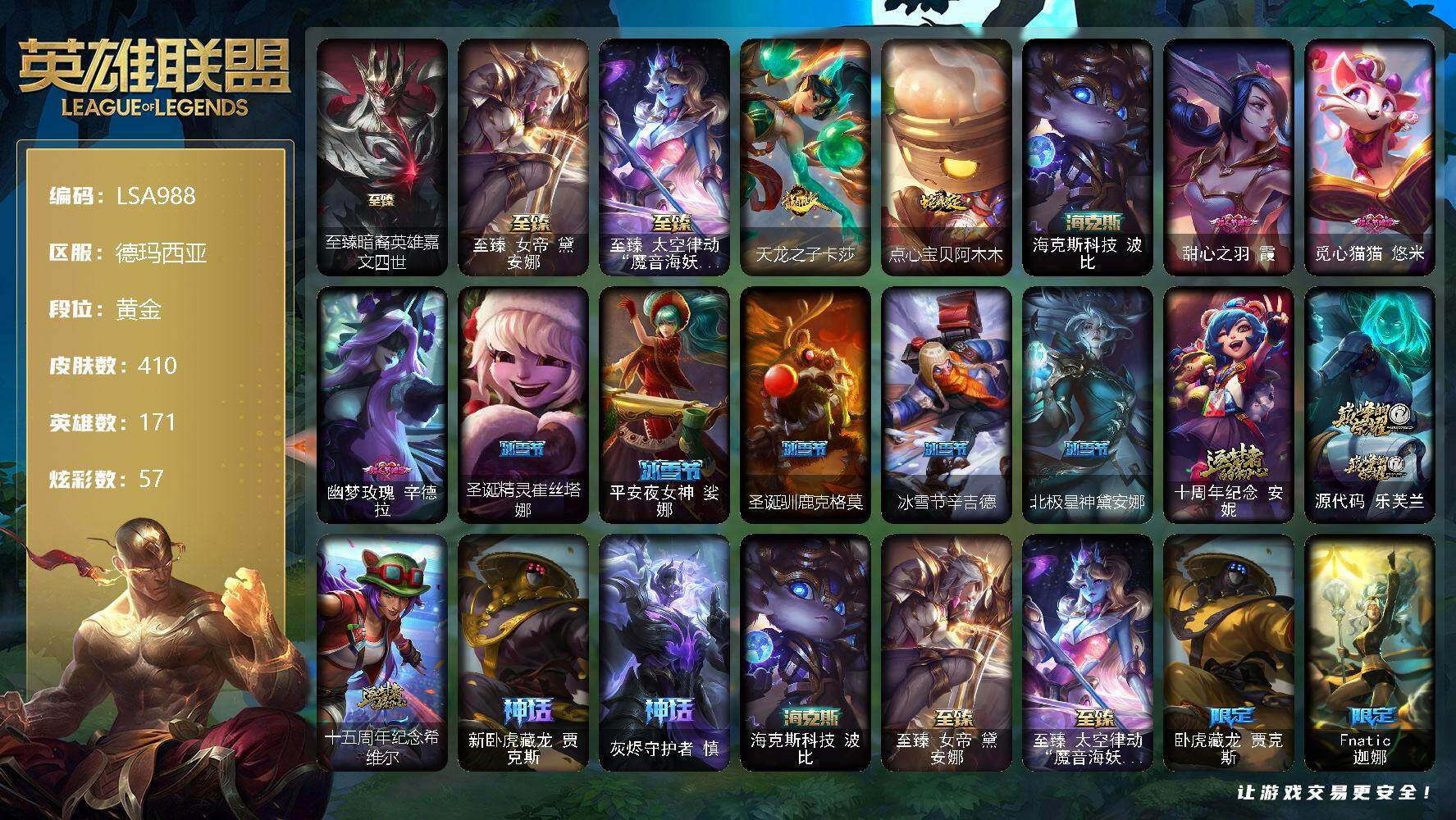 【10968375】【LSA988】171英雄/410皮肤/9神话/54限定/17臻彩/57炫彩/32传说/84史诗/黄金账号等级:959/至臻暗裔英雄嘉文四世/至臻女帝黛安娜/至臻娜美/古琴余韵娑娜炫金天籁/天龙之子卡莎飞龙乘云/无畏骑士瑟庄妮赤子初心/墨之影武者亚索金墨耀影/征服者阿利斯塔炫金/冠军之血希瓦娜凯旋圣装/玉剑传说风仙子毕方/弹幕天使卡莎炽天使勇敢/霸天巨兽雪崩墨菲特/灵魂莲华亚