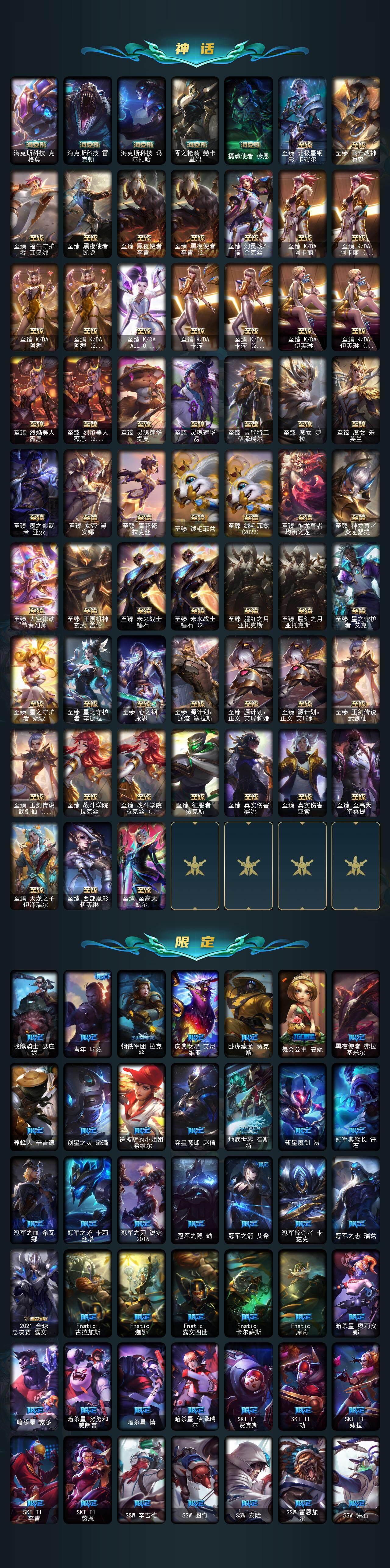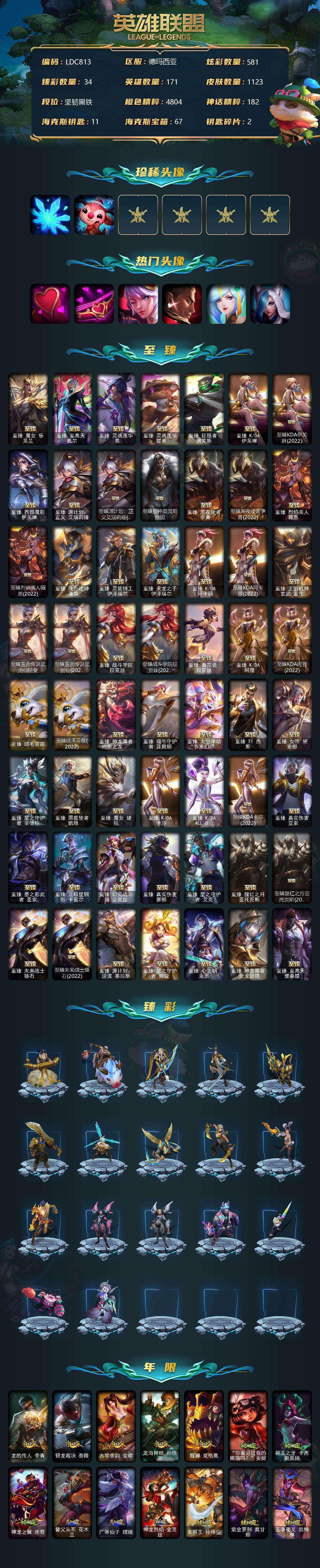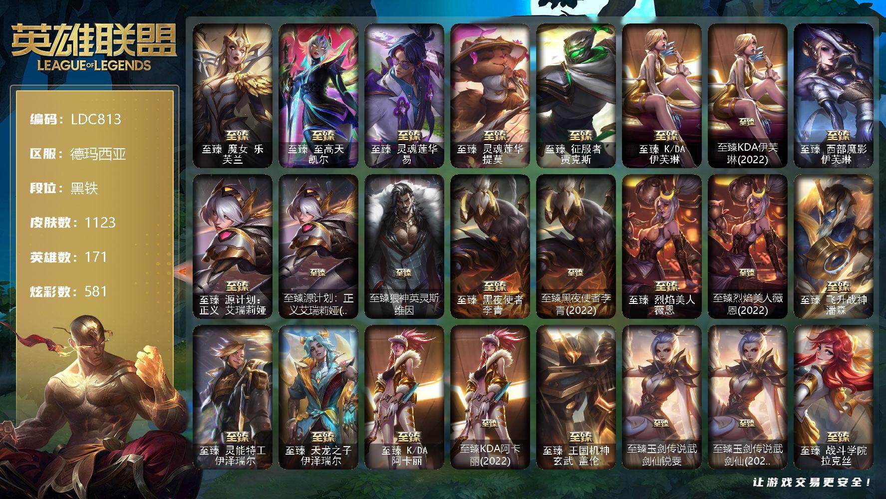 【10970173】【LDC813】171英雄/1123皮肤/5终极/75神话/221限定/34臻彩/581炫彩/98传说/214史诗/黑铁/雪花/至爱的鹿/爱意绵绵/爱情之歌/觅心之翼奎因/觅心游侠卢锡安/春晖神女/SSG霞/至臻魔女乐芙兰/至臻至高天凯尔/至臻灵魂莲华易/至臻灵魂莲华提莫/至臻征服者贾克斯/至臻K/DA伊芙琳/至臻KDA伊芙琳(2022)/至臻西部魔影伊芙琳/至臻源计划:正义