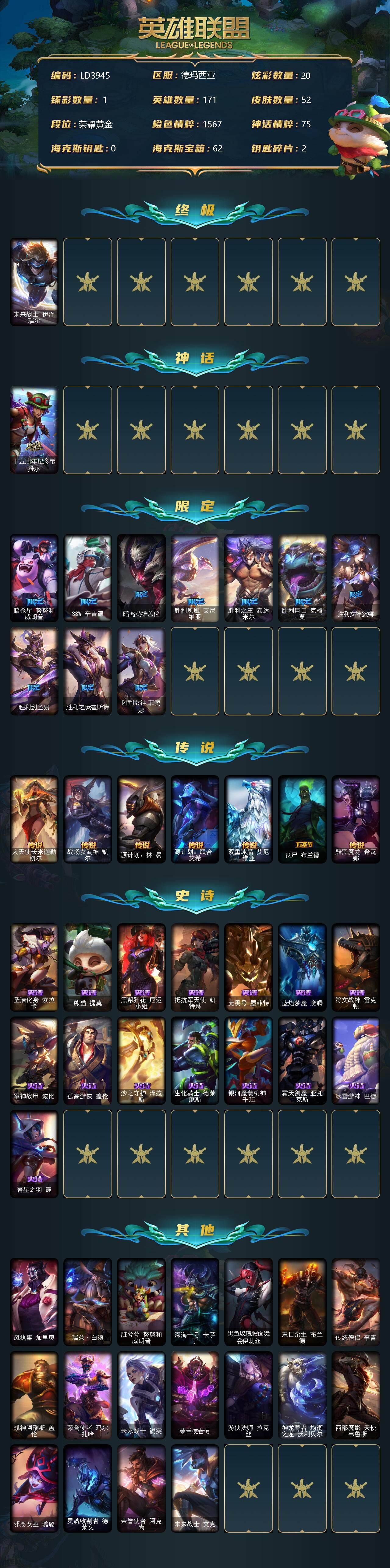 【10972322】【LD3945】171英雄/52皮肤/1终极/1神话/10限定/1臻彩/20炫彩/7传说/15史诗/黄金账号等级:566/冠军之刃锐雯2016凯旋圣装/未来战士伊泽瑞尔/十五周年纪念希维尔/暗杀星努努和威朗普/SSW辛吉德/暗裔英雄盖伦/胜利凤凰艾尼维亚/胜利之王泰达米尔/胜利巨口克格莫/胜利女神娑娜/胜利剑圣易/胜利之运崔斯特/胜利女神菲奥娜/大天使长米迦勒凯尔/战场女武神
