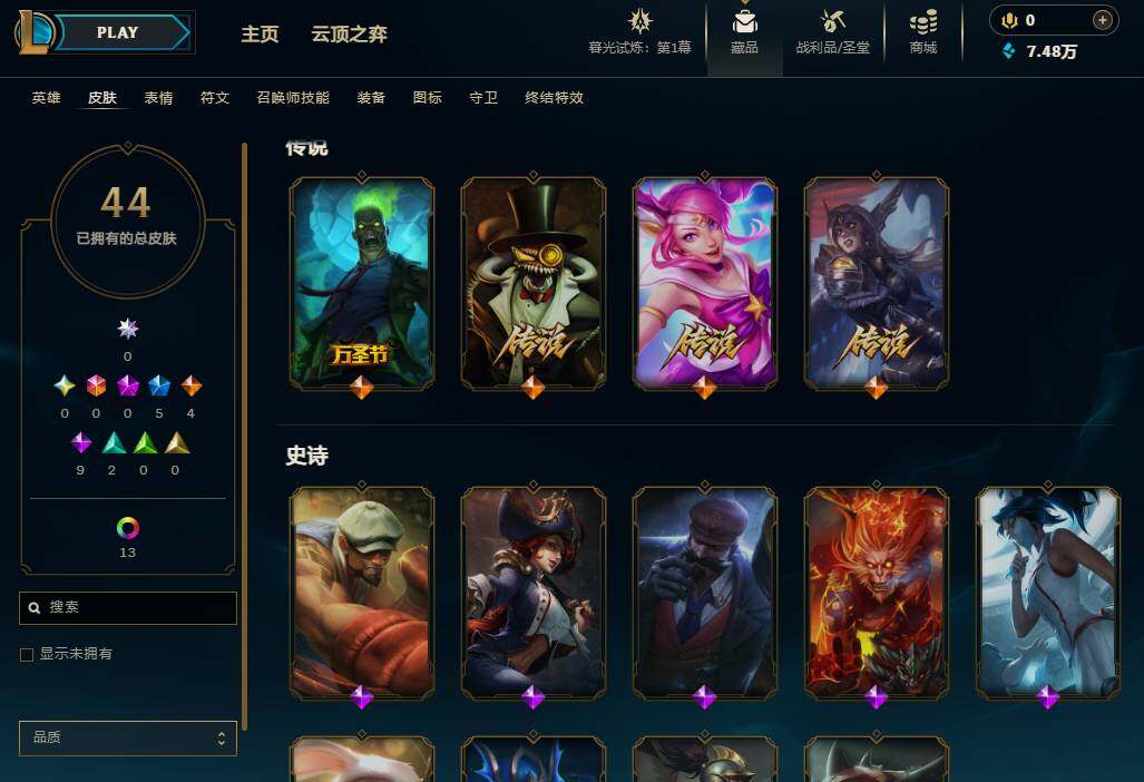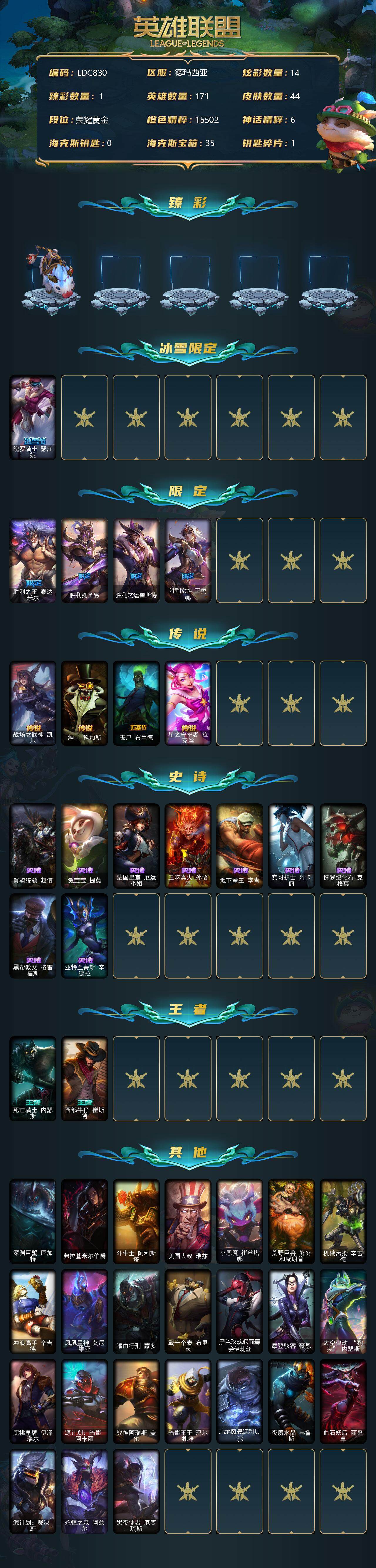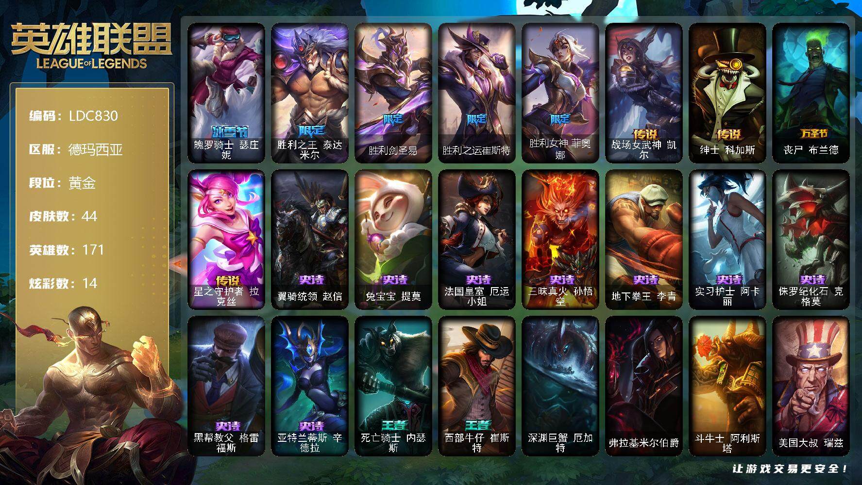 【10979110】【LDC830】171英雄/44皮肤/5限定/1臻彩/14炫彩/4传说/9史诗/黄金/无畏骑士瑟庄妮赤子初心/魄罗骑士瑟庄妮/胜利之王泰达米尔/胜利剑圣易/胜利之运崔斯特/胜利女神菲奥娜/战场女武神凯尔/绅士科加斯/丧尸布兰德/星之守护者拉克丝/翼装统领赵信/兔宝宝提莫/法国皇室厄运小姐/三昧真火孙悟空/地下拳王李青/实习护士阿卡丽/侏罗纪化石克格莫/黑帮教父格雷福斯/亚特兰