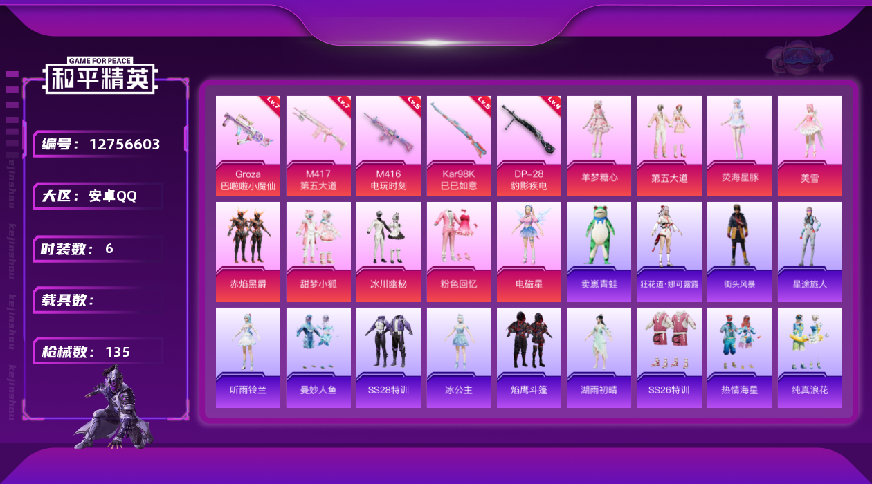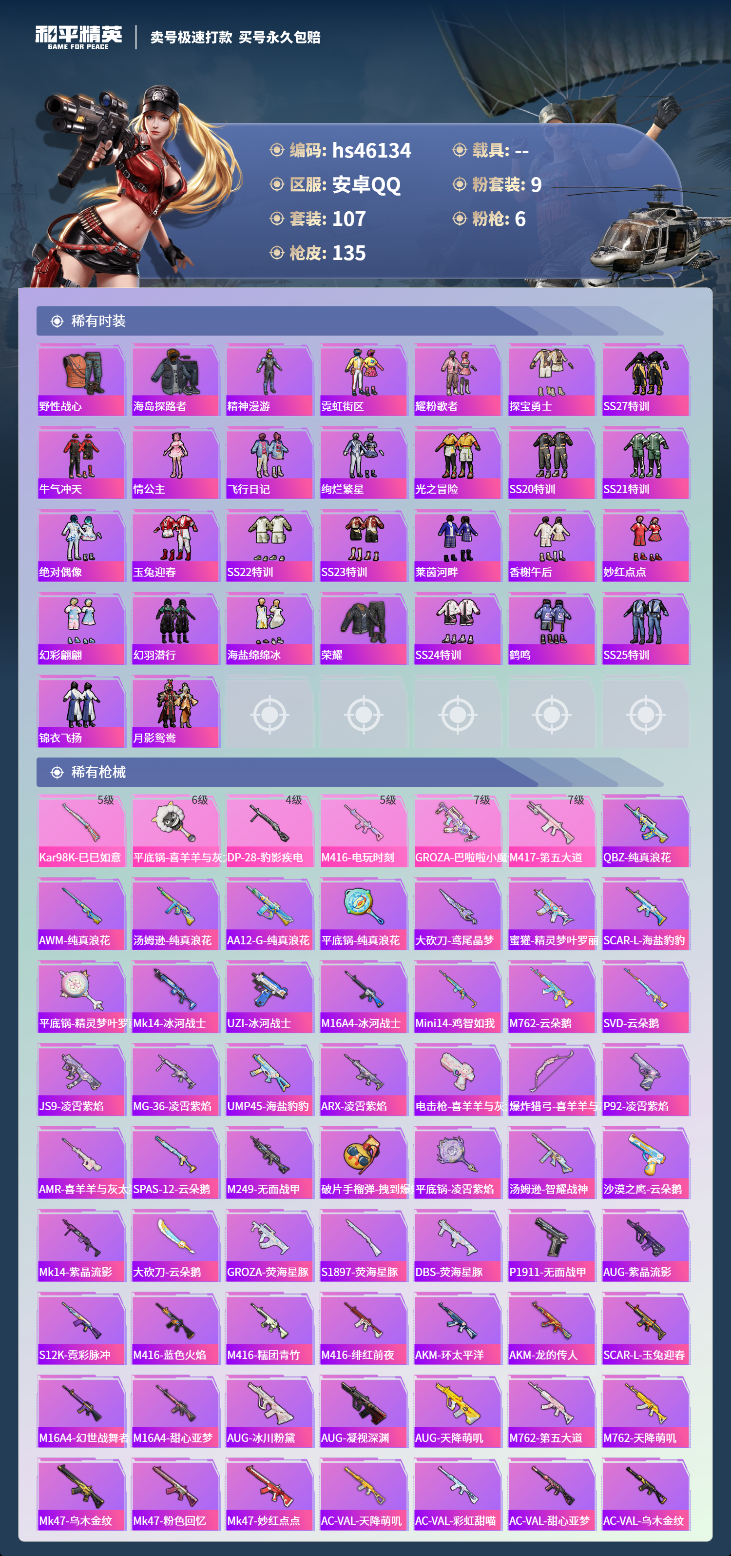 【10980660】【不可二次】【安卓QQ】M416-电玩时刻 粉色回忆 龟仙人 赤焰黑爵 S686-奇异狩猎者 暗夜契约 M24-奇异狩猎者 M417射手步枪 M417-第五大道 GROZA-巴啦啦小魔仙