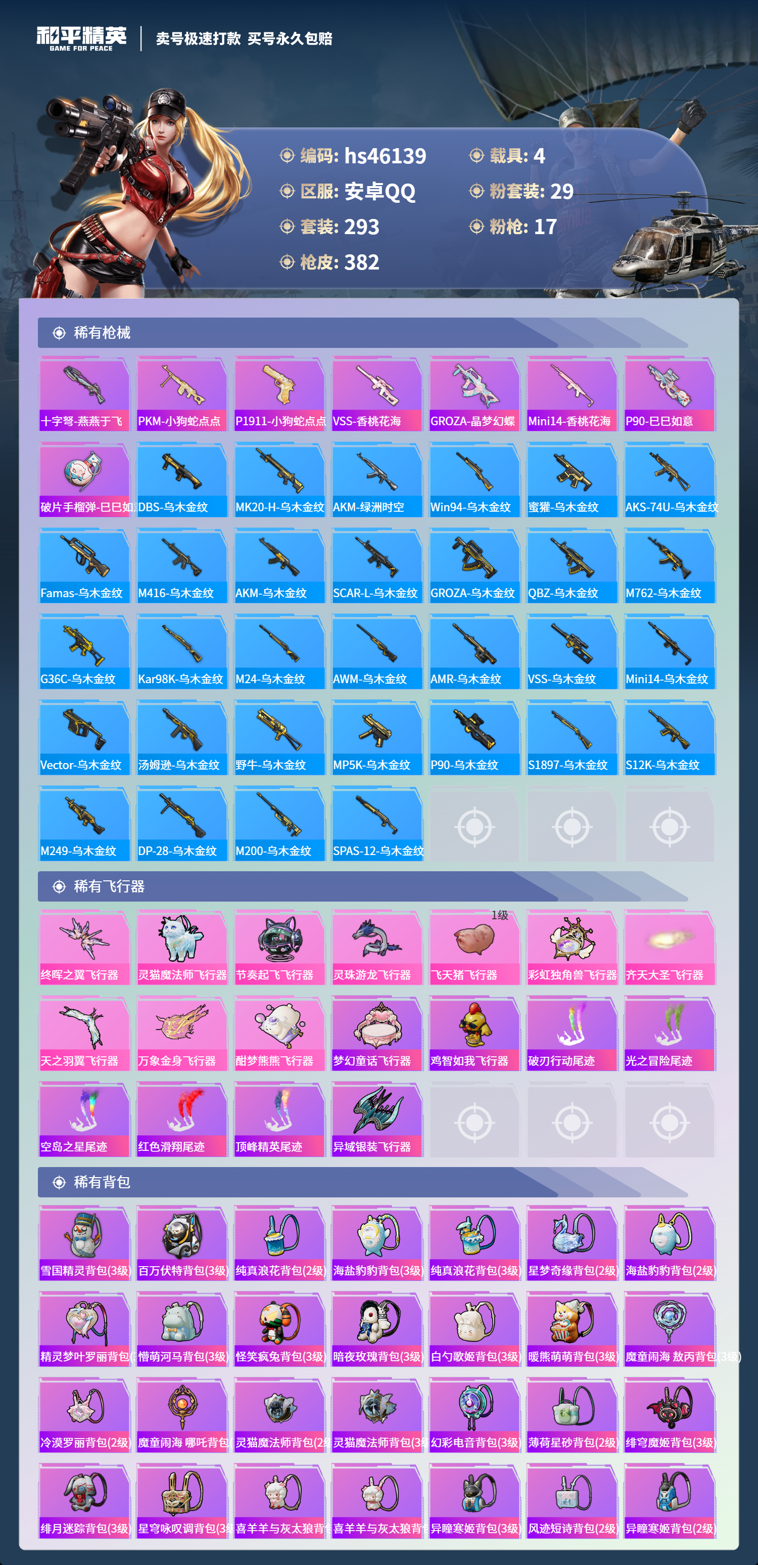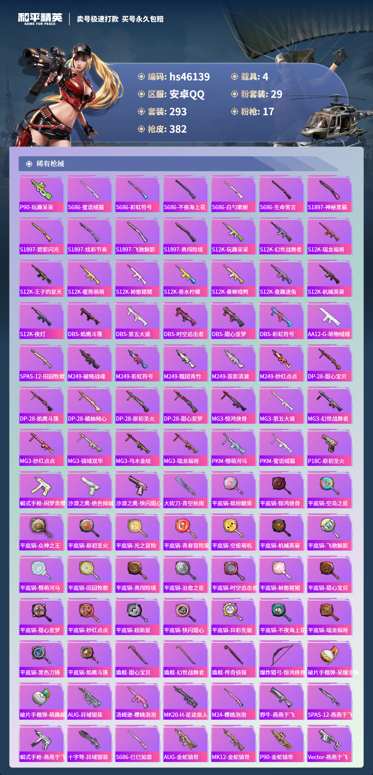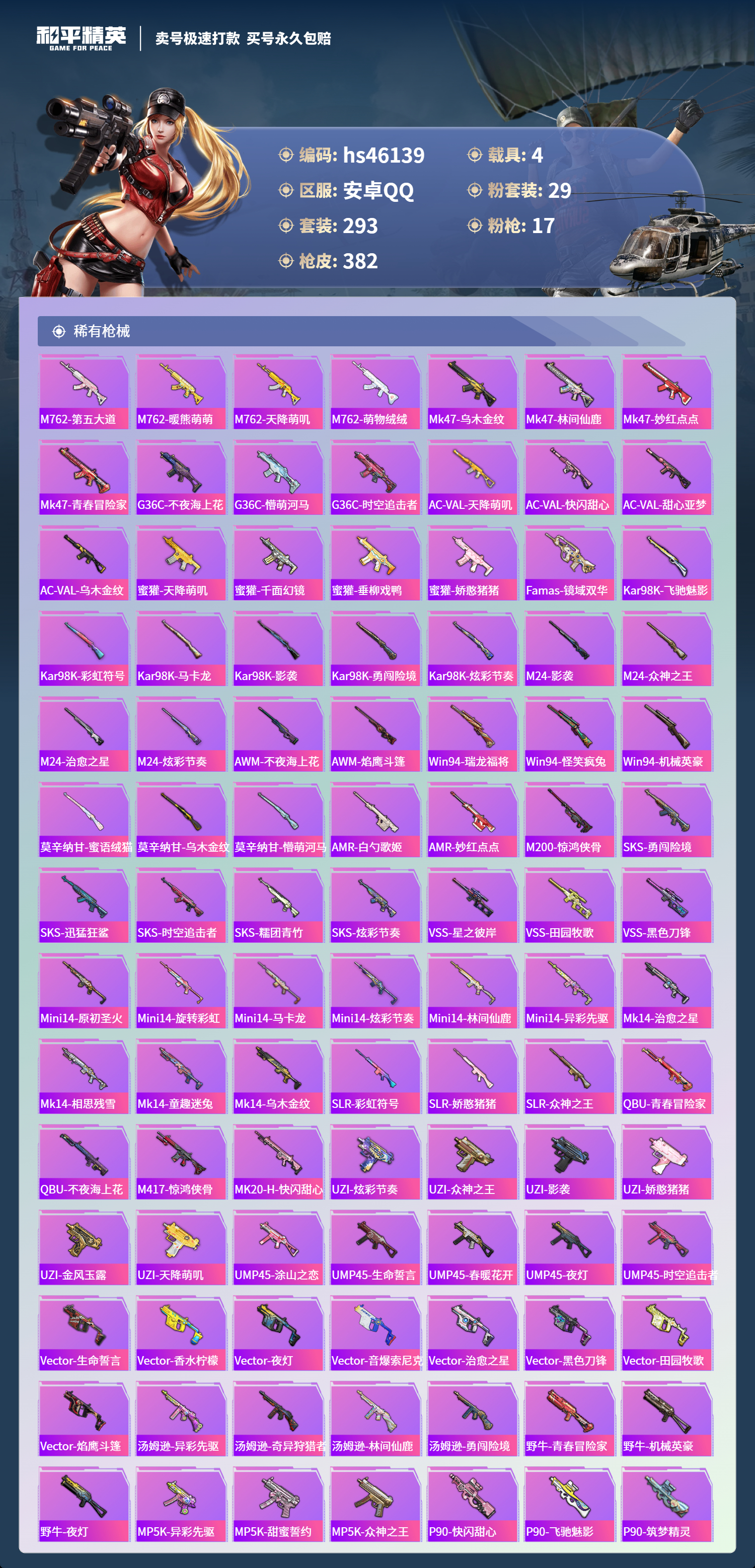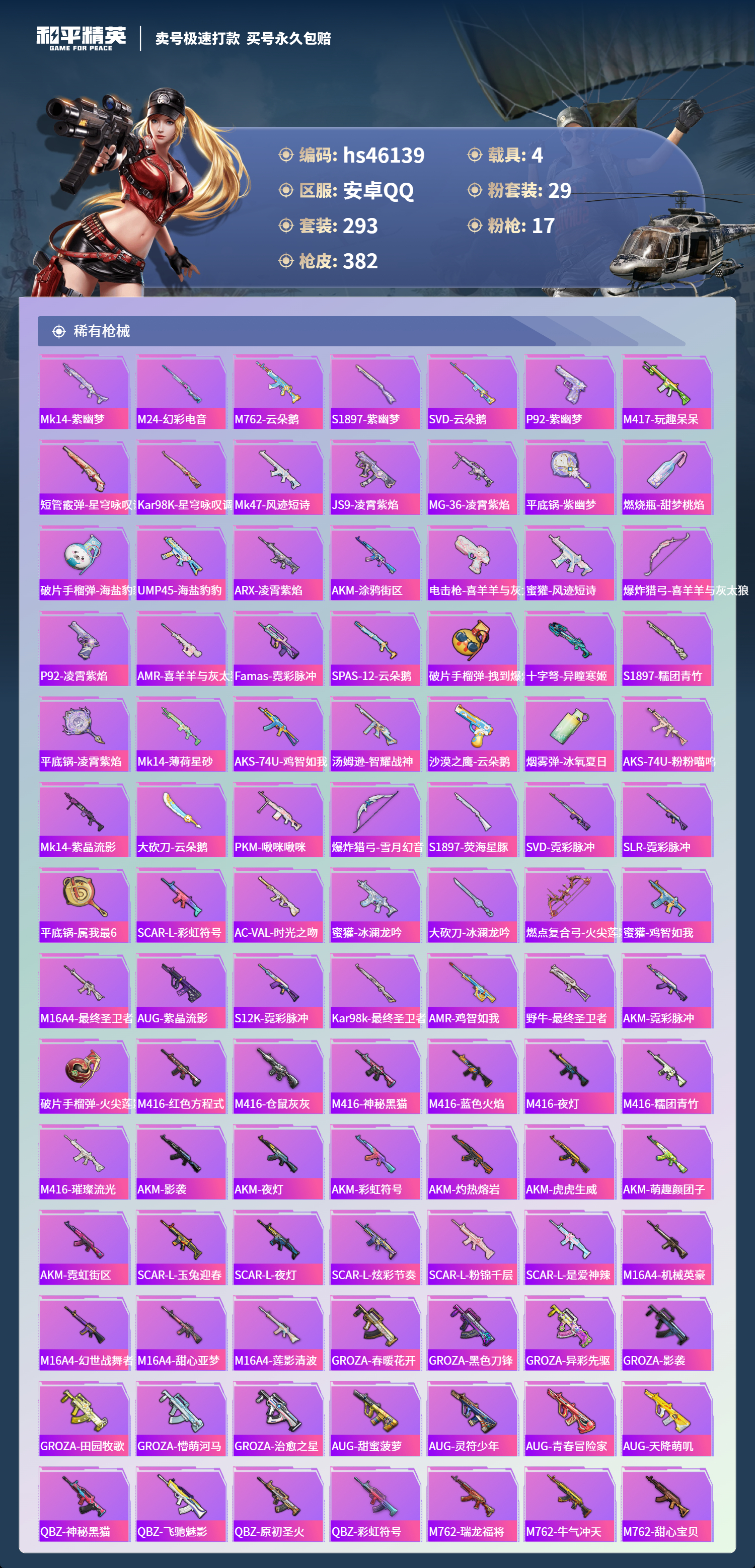 【10980664】【不可二次】【安卓QQ】龟仙人 漫步者 都市猎人 梦起落英 Mini14-林间仙鹿 海盐物语 星空之魅 M416-仓鼠灰灰 MK47-林间仙鹿 M416-心之恋语 缤纷油彩 深海小丑鱼 浪漫波比 馨动时刻 SCAR-童趣迷兔 童趣迷兔 智能音符 纯白誓言 迅捷狂鲨 M762-瑞龙福将 齐天大圣飞行器 潮萌小黄鸭 黑色刀锋 M417射手步枪 SCAR-L-锦绣绵绵 AKM-炫紫