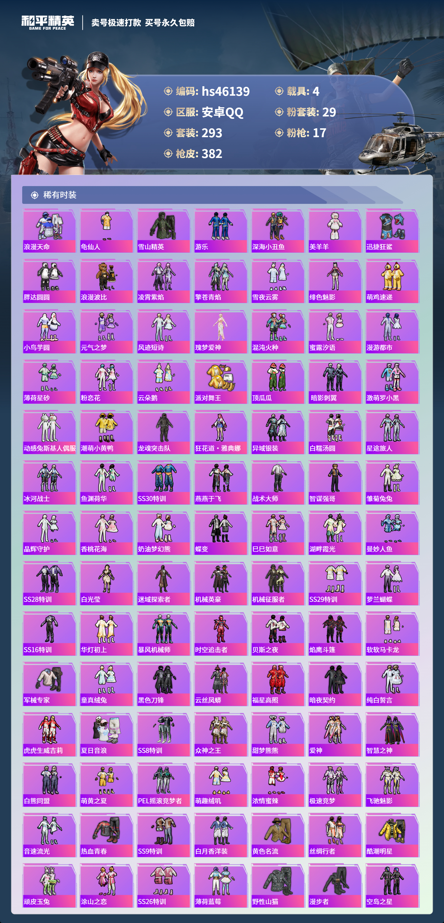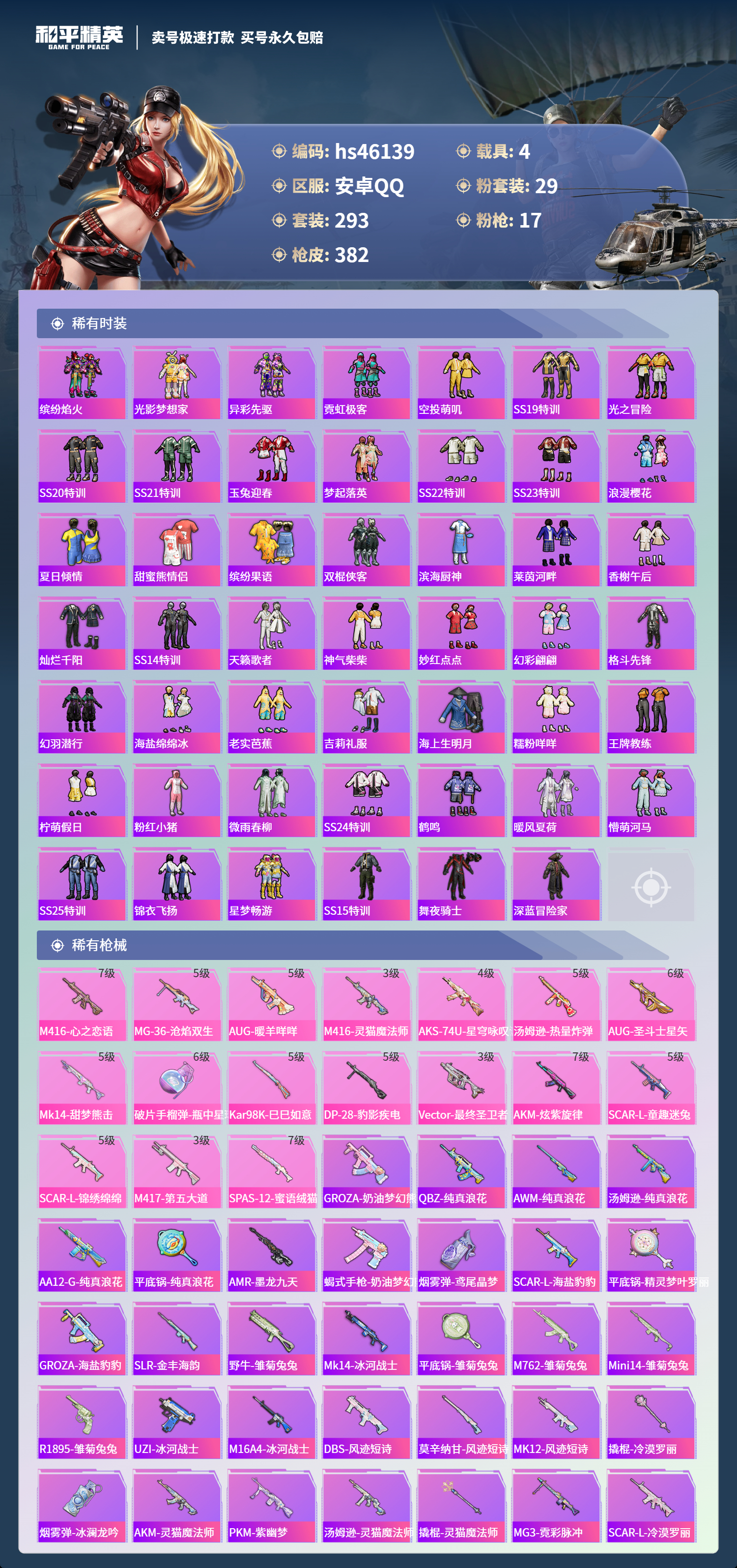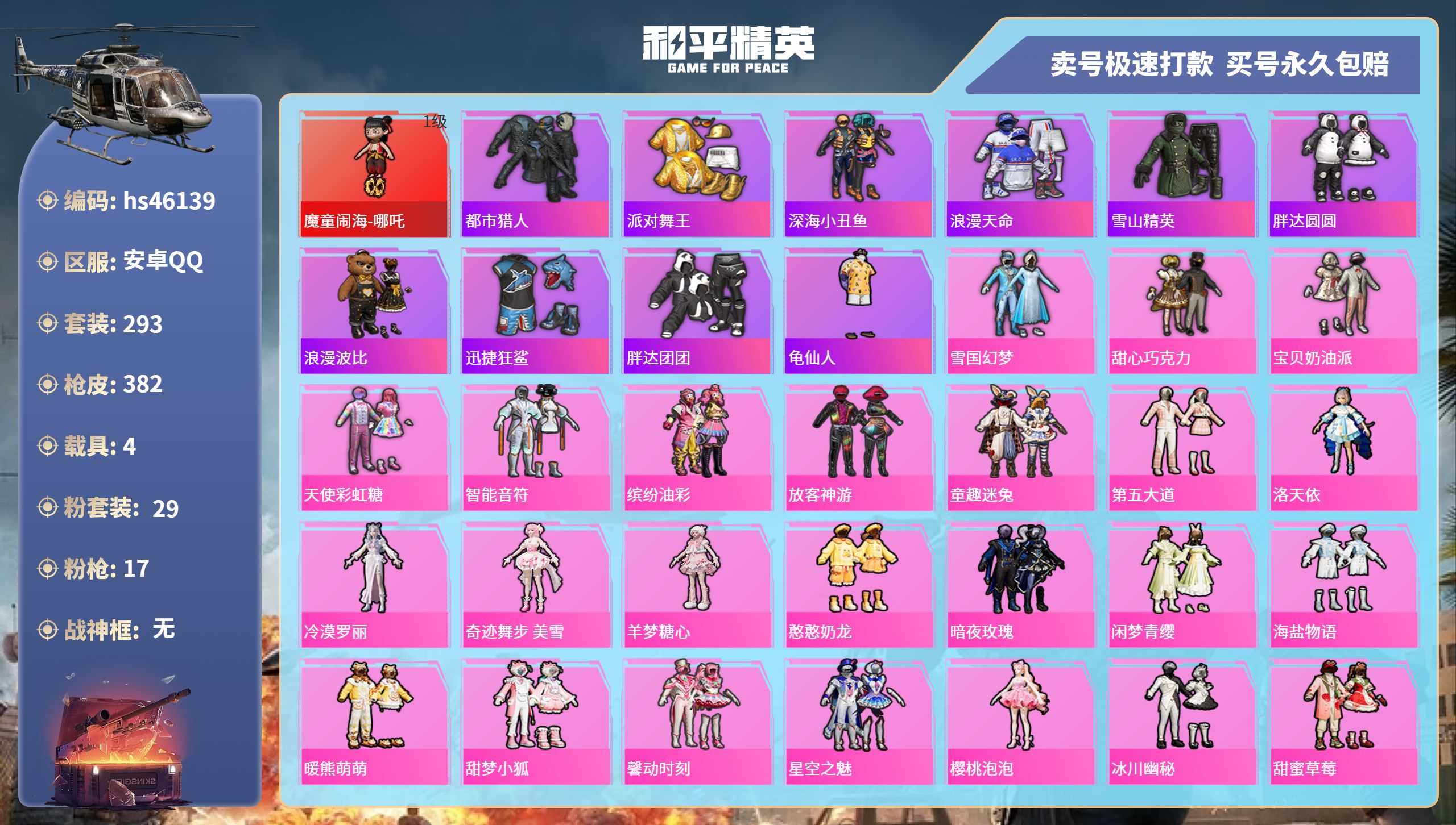 【10980664】【不可二次】【安卓QQ】龟仙人 漫步者 都市猎人 梦起落英 Mini14-林间仙鹿 海盐物语 星空之魅 M416-仓鼠灰灰 MK47-林间仙鹿 M416-心之恋语 缤纷油彩 深海小丑鱼 浪漫波比 馨动时刻 SCAR-童趣迷兔 童趣迷兔 智能音符 纯白誓言 迅捷狂鲨 M762-瑞龙福将 齐天大圣飞行器 潮萌小黄鸭 黑色刀锋 M417射手步枪 SCAR-L-锦绣绵绵 AKM-炫紫