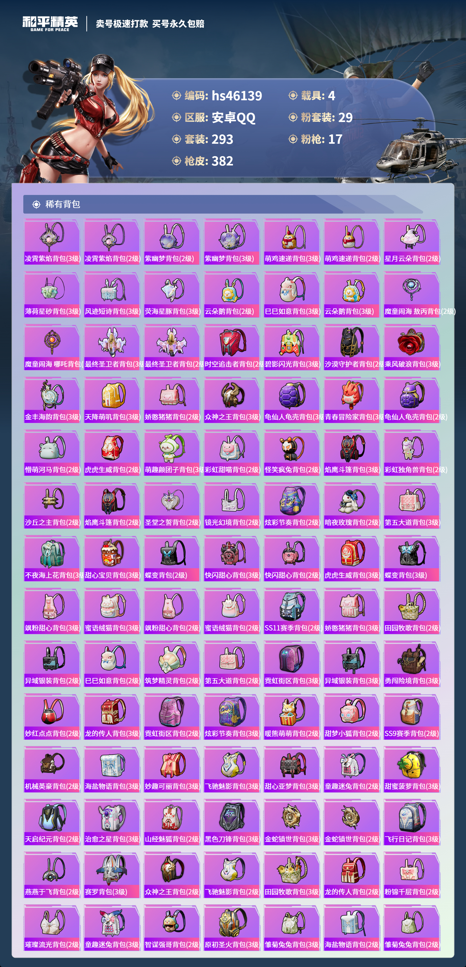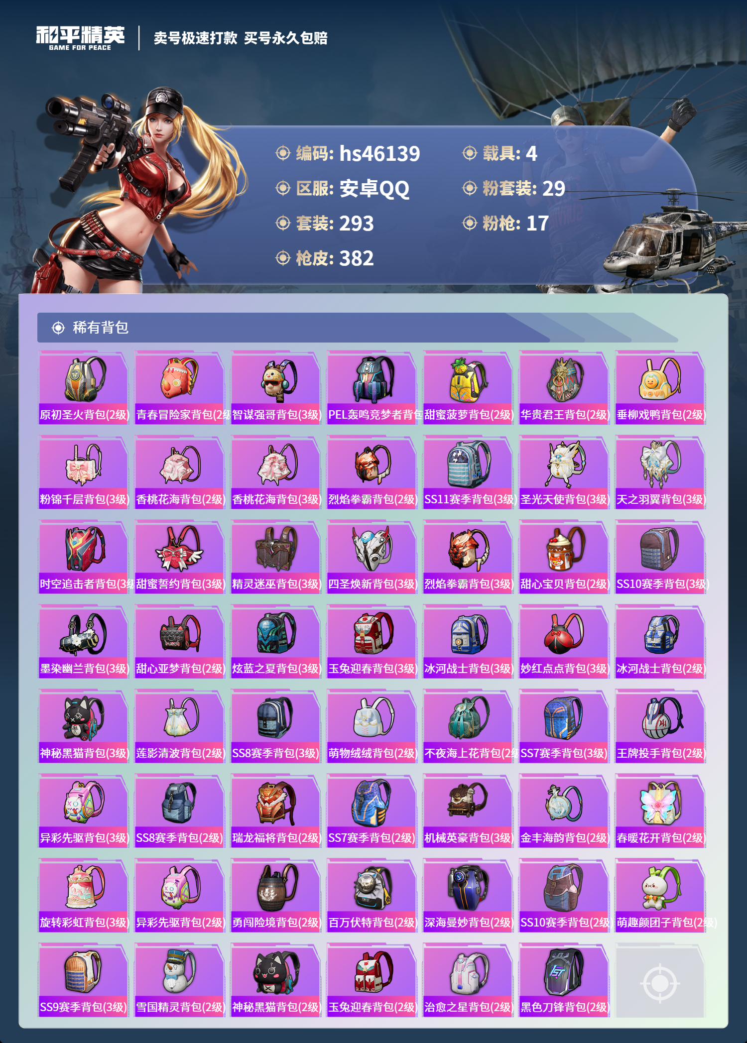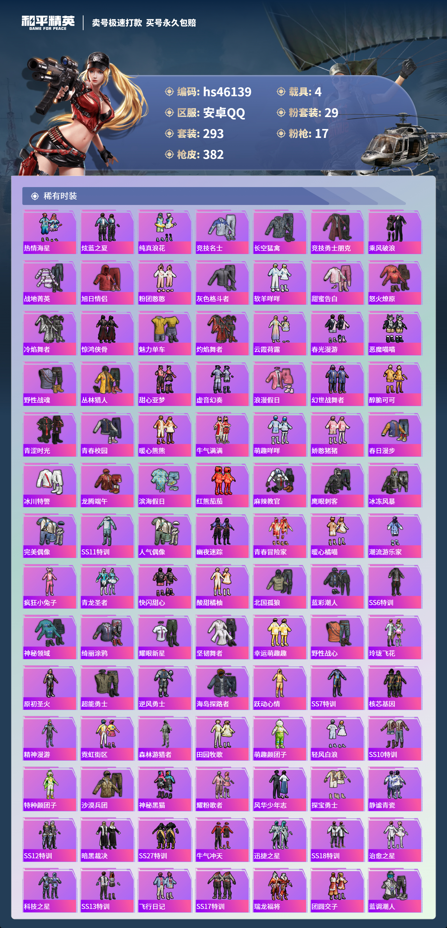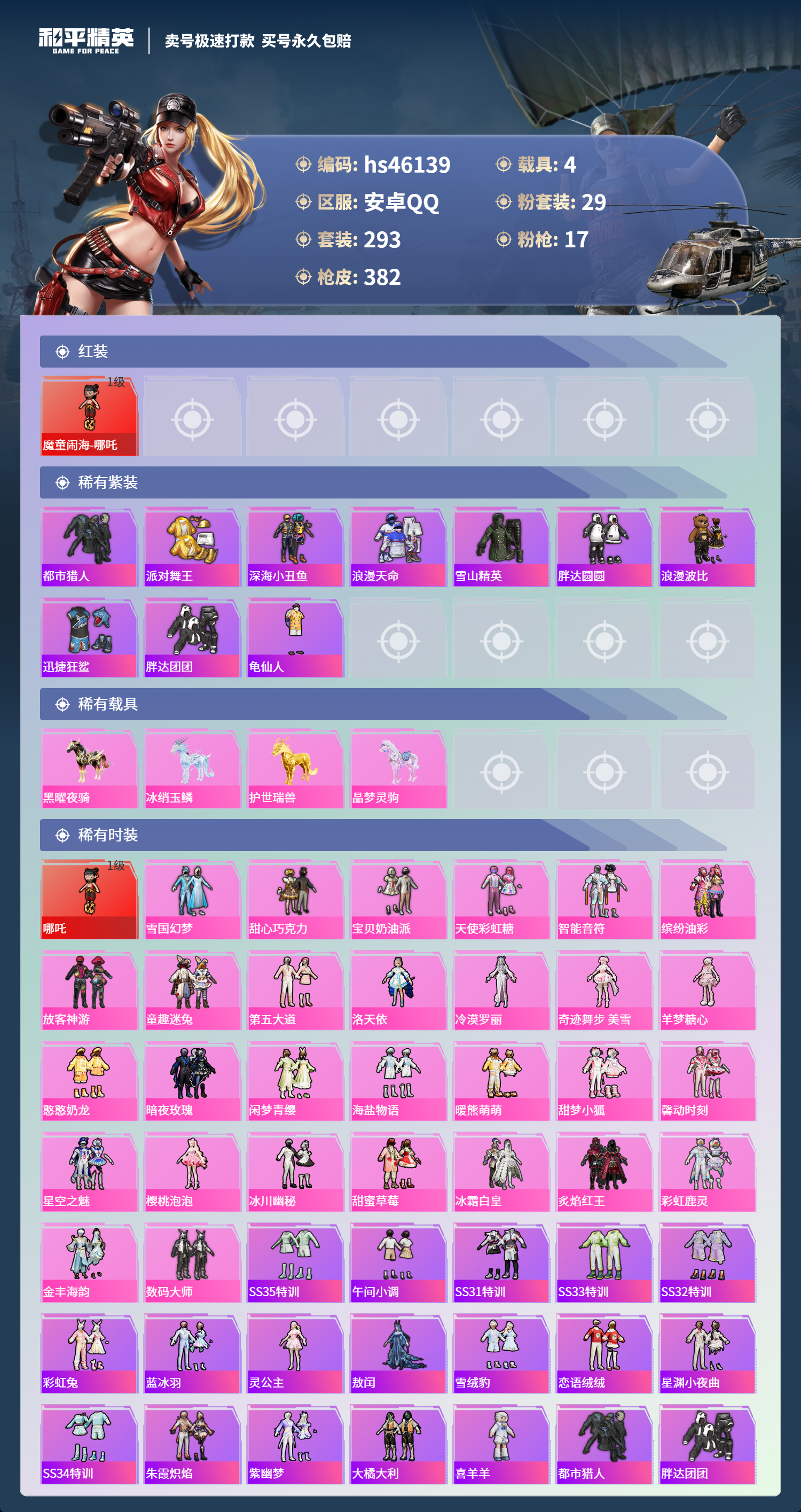 【10980664】【不可二次】【安卓QQ】龟仙人 漫步者 都市猎人 梦起落英 Mini14-林间仙鹿 海盐物语 星空之魅 M416-仓鼠灰灰 MK47-林间仙鹿 M416-心之恋语 缤纷油彩 深海小丑鱼 浪漫波比 馨动时刻 SCAR-童趣迷兔 童趣迷兔 智能音符 纯白誓言 迅捷狂鲨 M762-瑞龙福将 齐天大圣飞行器 潮萌小黄鸭 黑色刀锋 M417射手步枪 SCAR-L-锦绣绵绵 AKM-炫紫
