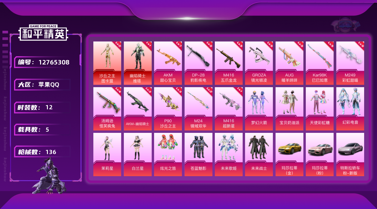 【10982417】【不可二次】【苹果QQ】合金龙骨蓝色 龟仙人 M416-五爪金龙 P90-沙丘之主 苍蓝魅影 沙丘之主-图卡盟 M249-彩虹甜喵 深海小丑鱼 激萌小黄鸭 M416-超新星 浪漫天命 梦幻火箭飞行器 AKM-甜心宝贝 M24-激战未来 M24-镜域双华 暗夜契约 潮萌小黄鸭 特斯拉R沁心粉 龙翔九天飞行器 幽焰骑士-维塔 诡面顽熊 梦幻火箭 鬼马风驰 天使彩虹糖 汤姆逊-怪笑