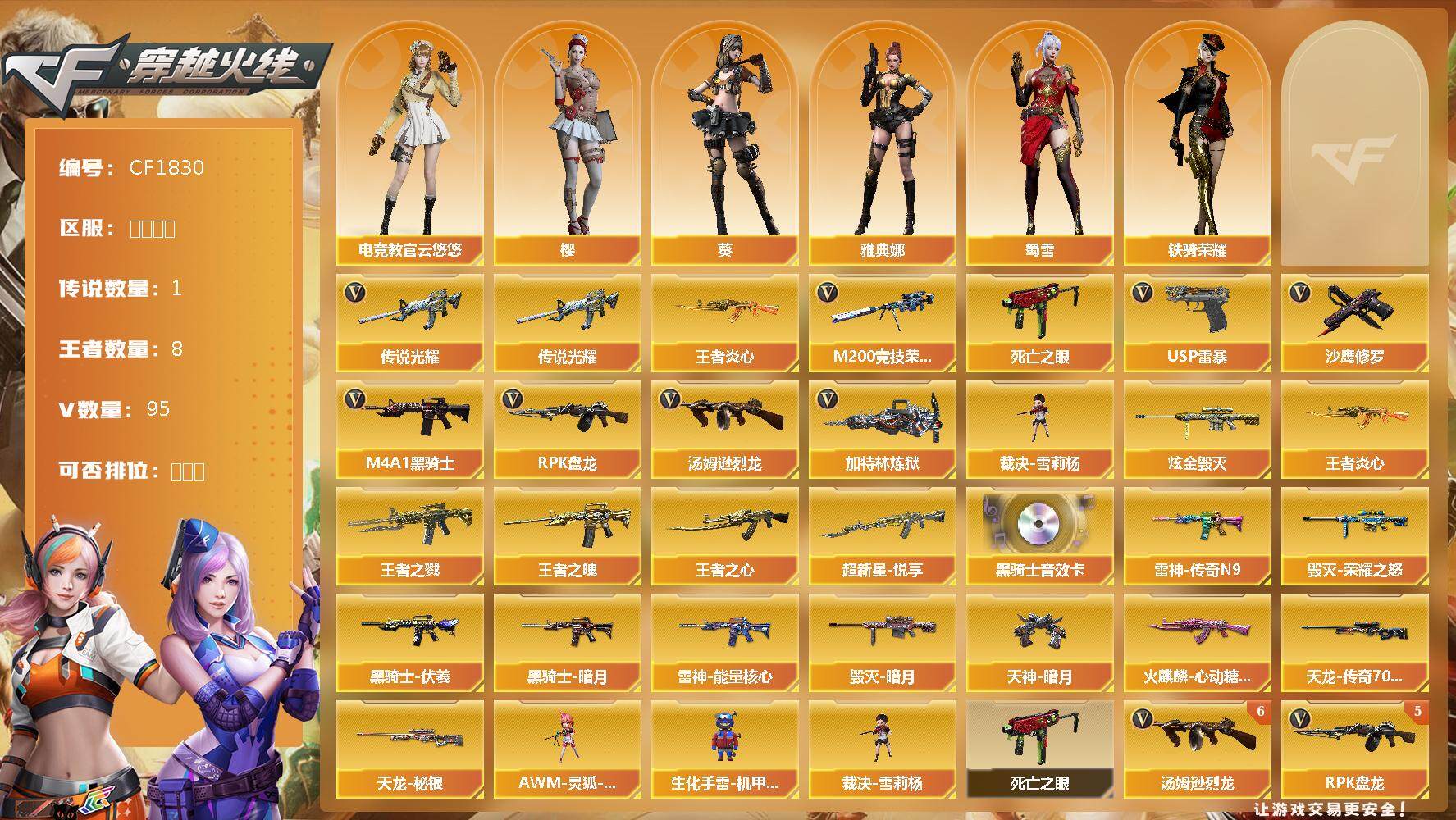 【10985813】【10985813】【CF1830】【商品标题】:安徽一区-95V-8王者-1炫金【6烈龙+死亡之眼】传说光耀】【M200-竞技荣光】【柯