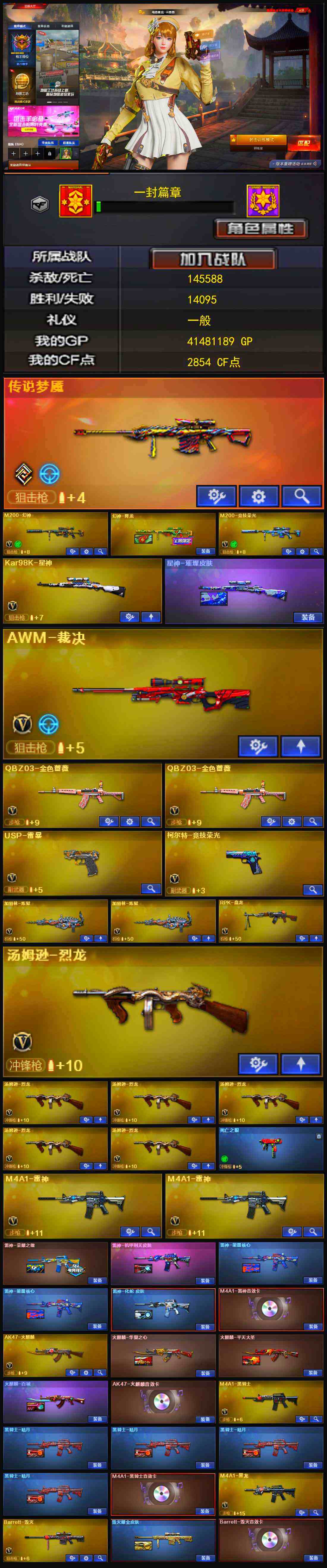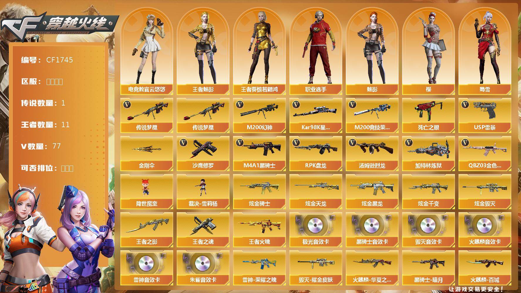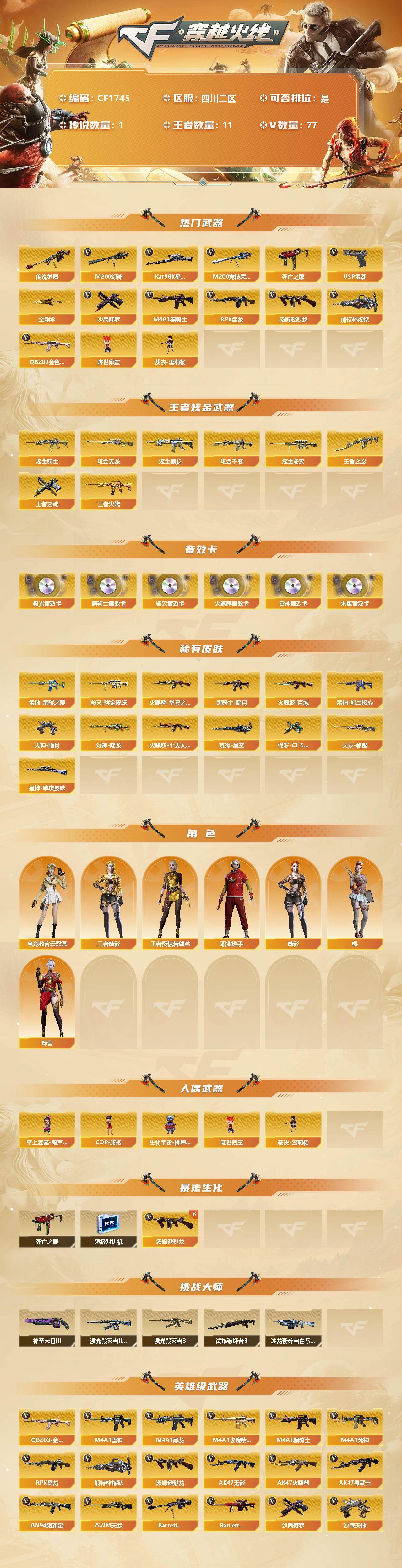 【10985927】【CF1745】【商品标题】:四川二区-77V-11王者-5炫金【传说梦魇】【M200-幻神】【Kar98K-星神】【AWM-裁决】【6烈龙】【死亡之眼】【幻神-降龙】【M200-竞技荣光】【星神-璀璨皮肤】【QBZ03-金色蔷薇】【USP-雷暴】【柯尔特-竞技荣光】【加特林-炼狱】【RPK-盘龙】【电竞教官-云悠悠】【王者-魅影】【王者葵-惊若翩鸿】【樱】【魅影】【M4A1