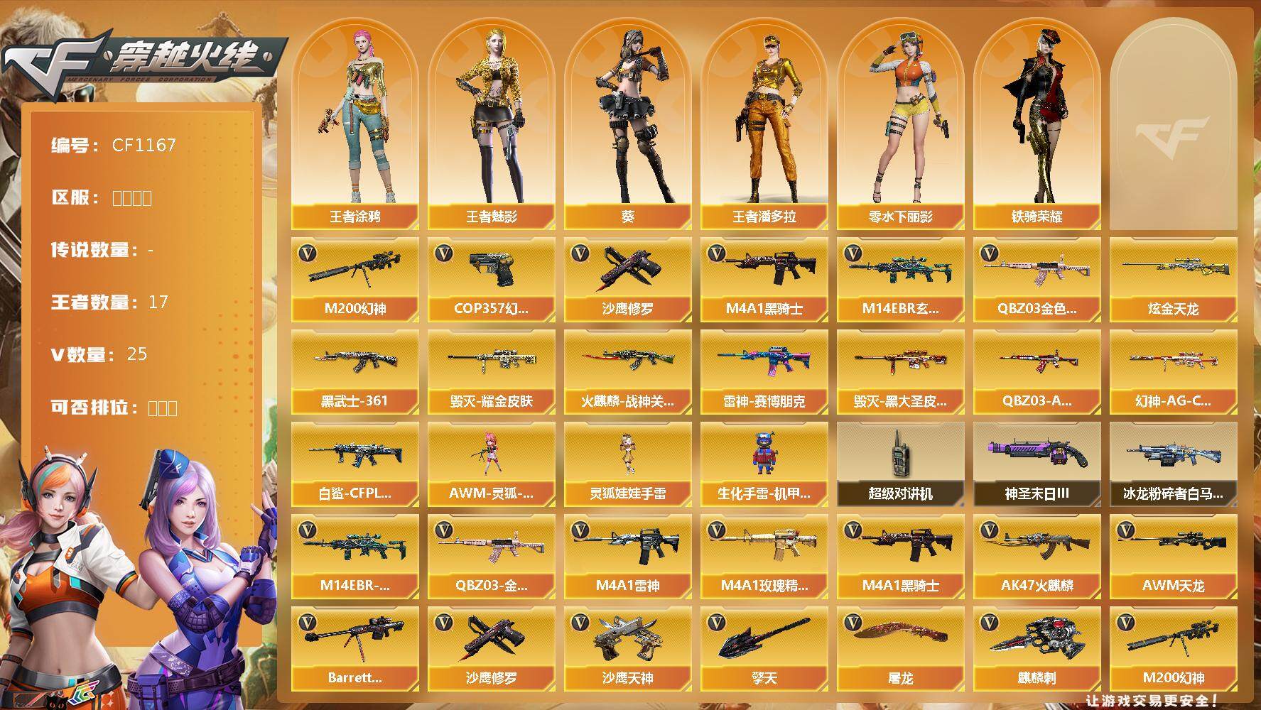 【10986756】【CF1167】【商品标题】:云南一区【精品账号/【M200-幻神】【白虎-白鲨-CFPLS23冠军】【QBZ03-金色蔷薇】【QBZ03-AG-CFPLS19冠军】【王者芳薇-觉醒版】【M14EBR-玄武】【COP 357-幻灵】【葵】【王者-魅影】【王者潘多拉】【王者涂鸦】】【热门武器】:QBZ03-金色蔷薇,M14EBR-玄武,M200-幻神,M4A1-黑骑士*2,CO