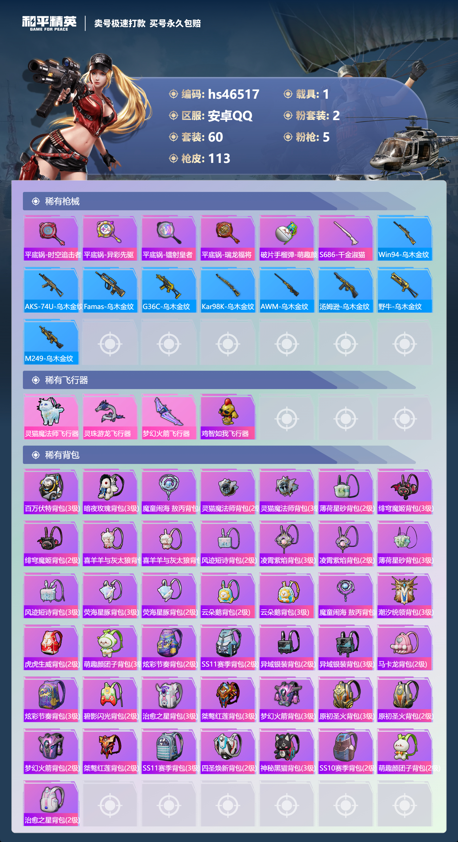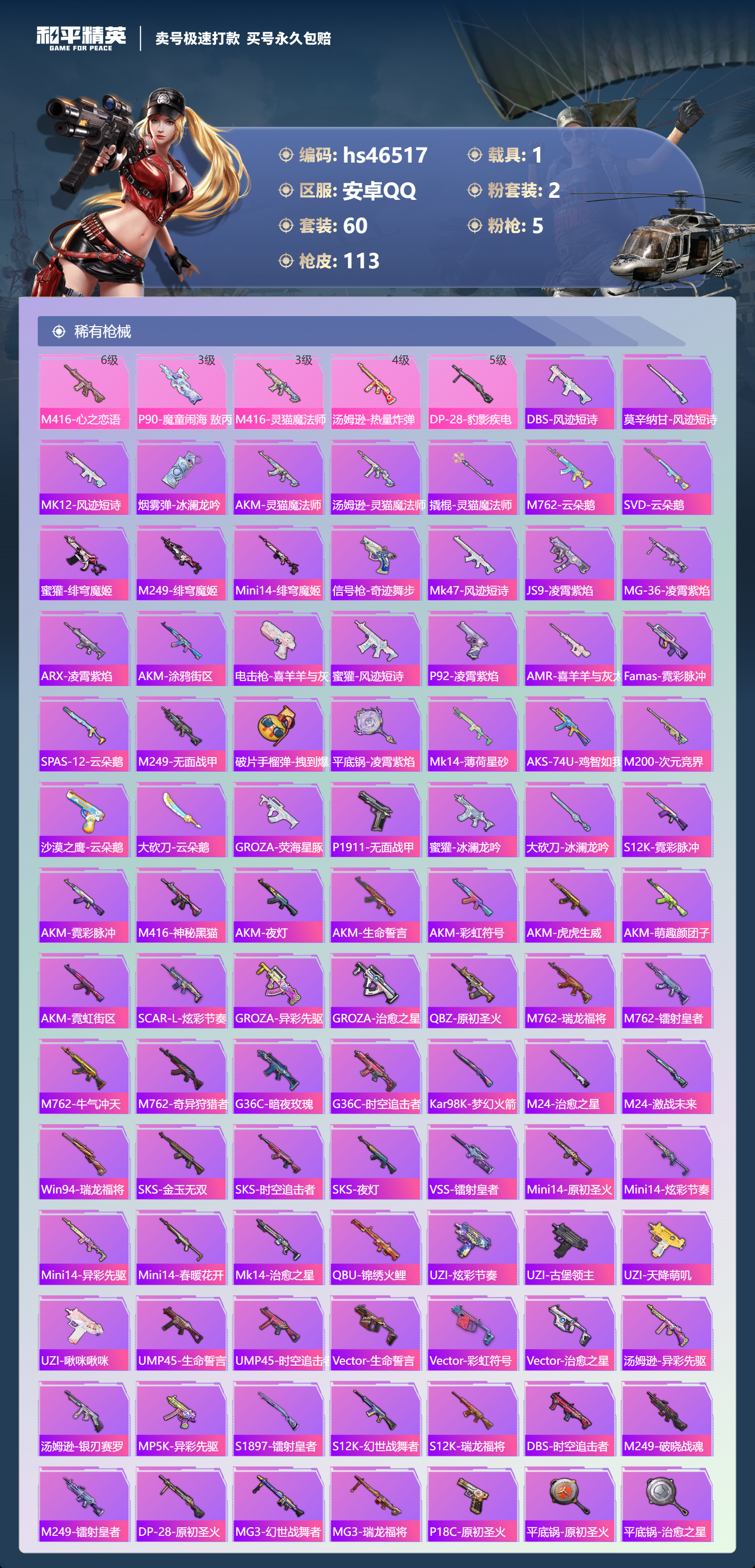 【10987844】【不可二次】【安卓QQ】M24-激战未来 M762-奇异狩猎者 娴静芝兰 M416-心之恋语 M762-瑞龙福将 瑞龙福将 流星咚咚 梦幻火箭飞行器 团圆交子