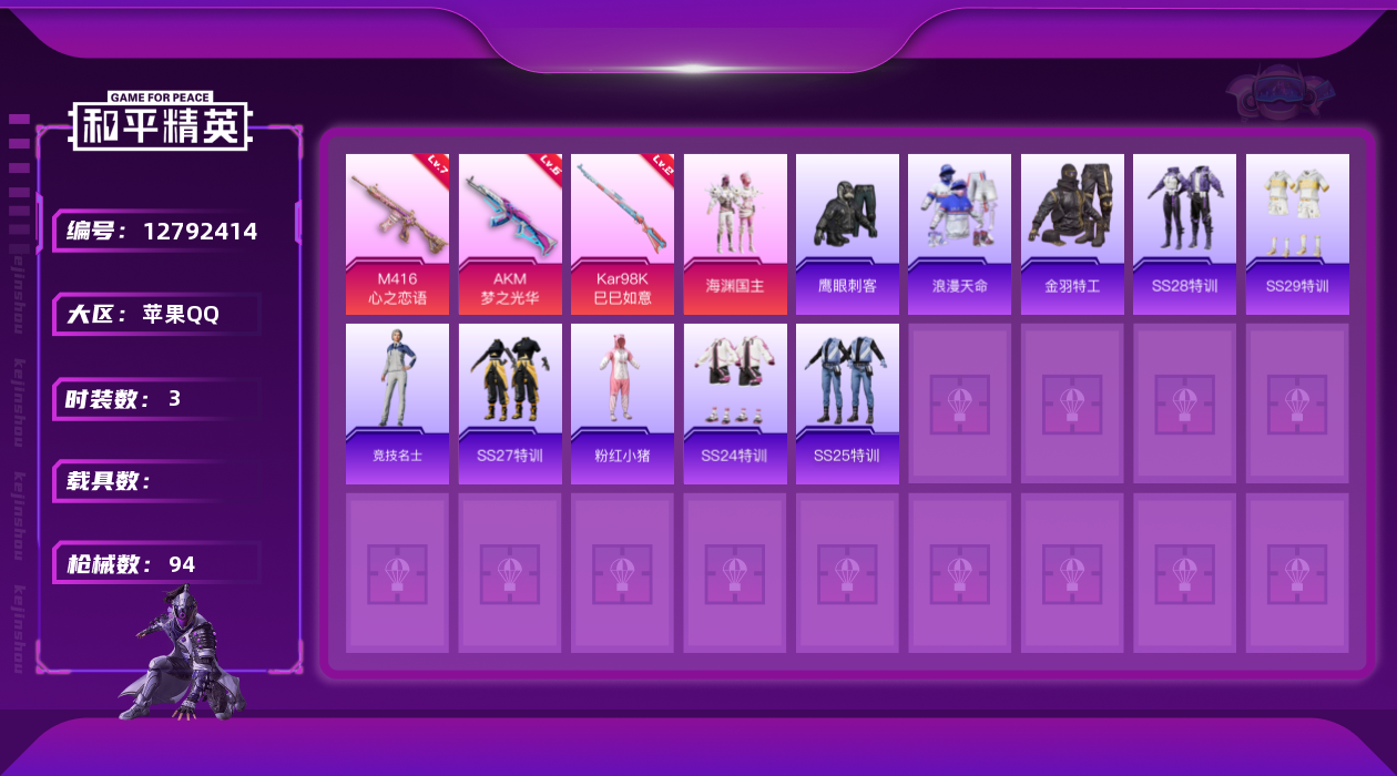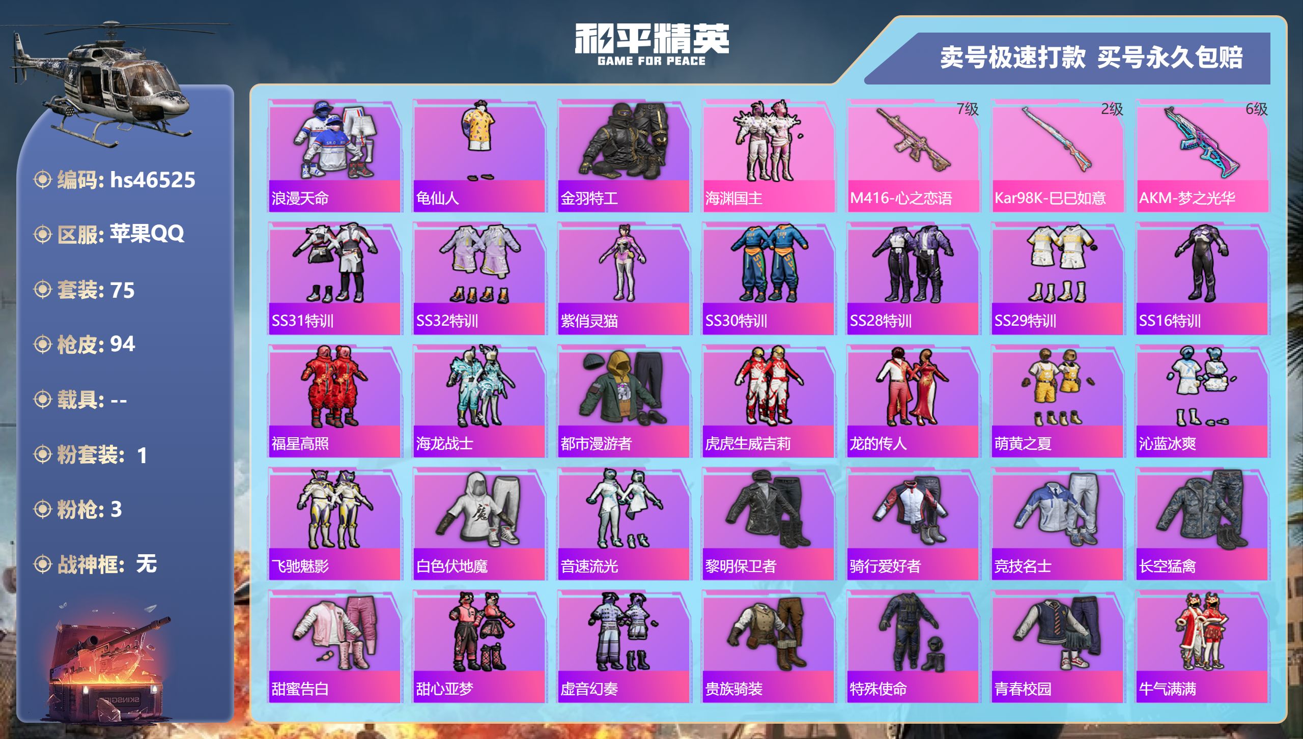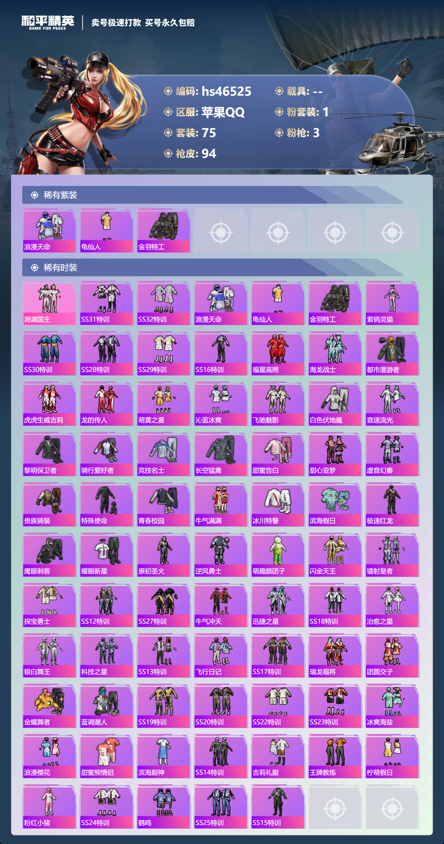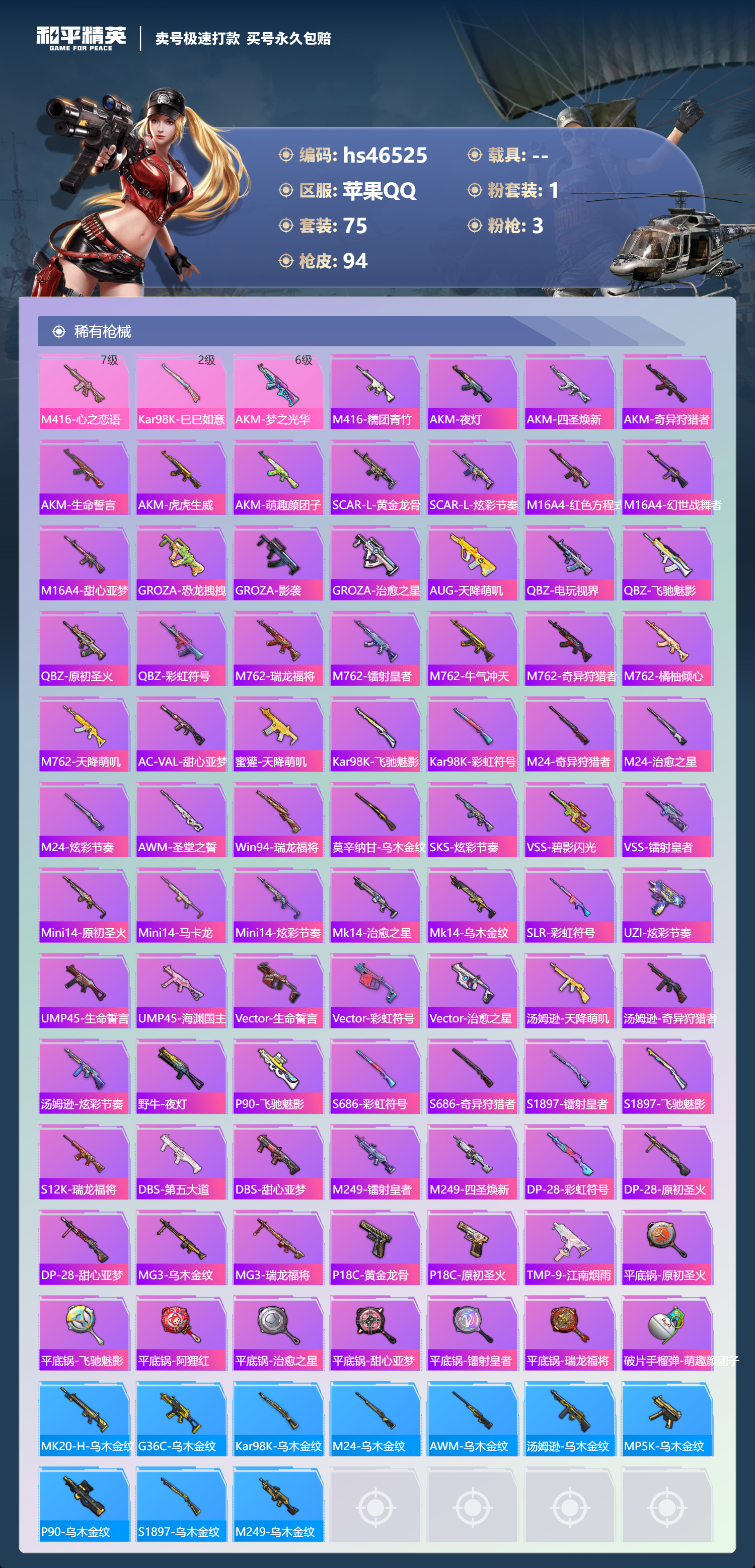 【10987848】【可二次】【苹果QQ】龟仙人 S686-奇异狩猎者 M24-奇异狩猎者 M762-瑞龙福将 极速红龙 金羽特工 M762-奇异狩猎者 AKM-梦之光华 M416-心之恋语 粉红小猪 瑞龙福将 海渊国主 浪漫天命 团圆交子 AKM-奇异狩猎者