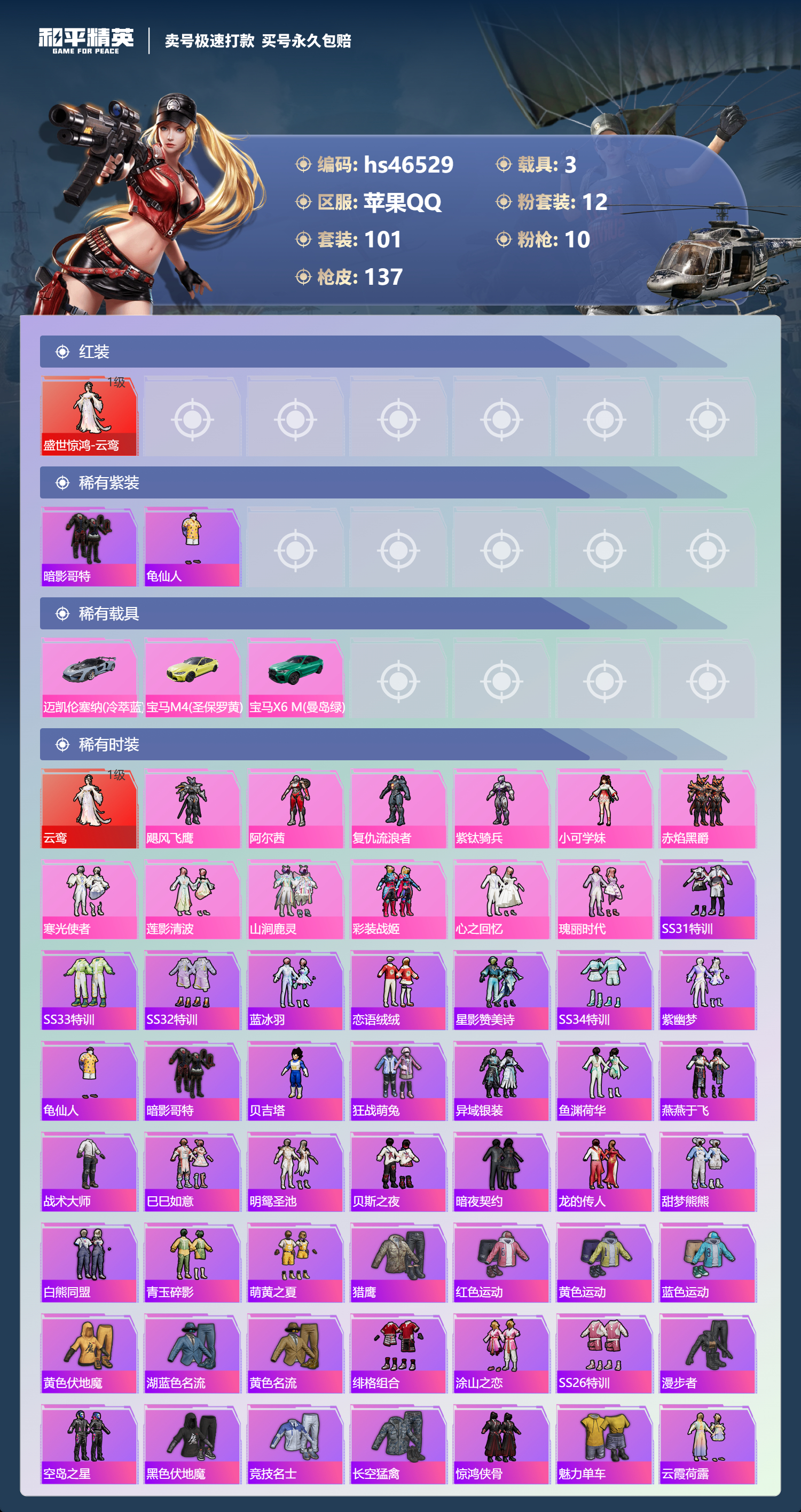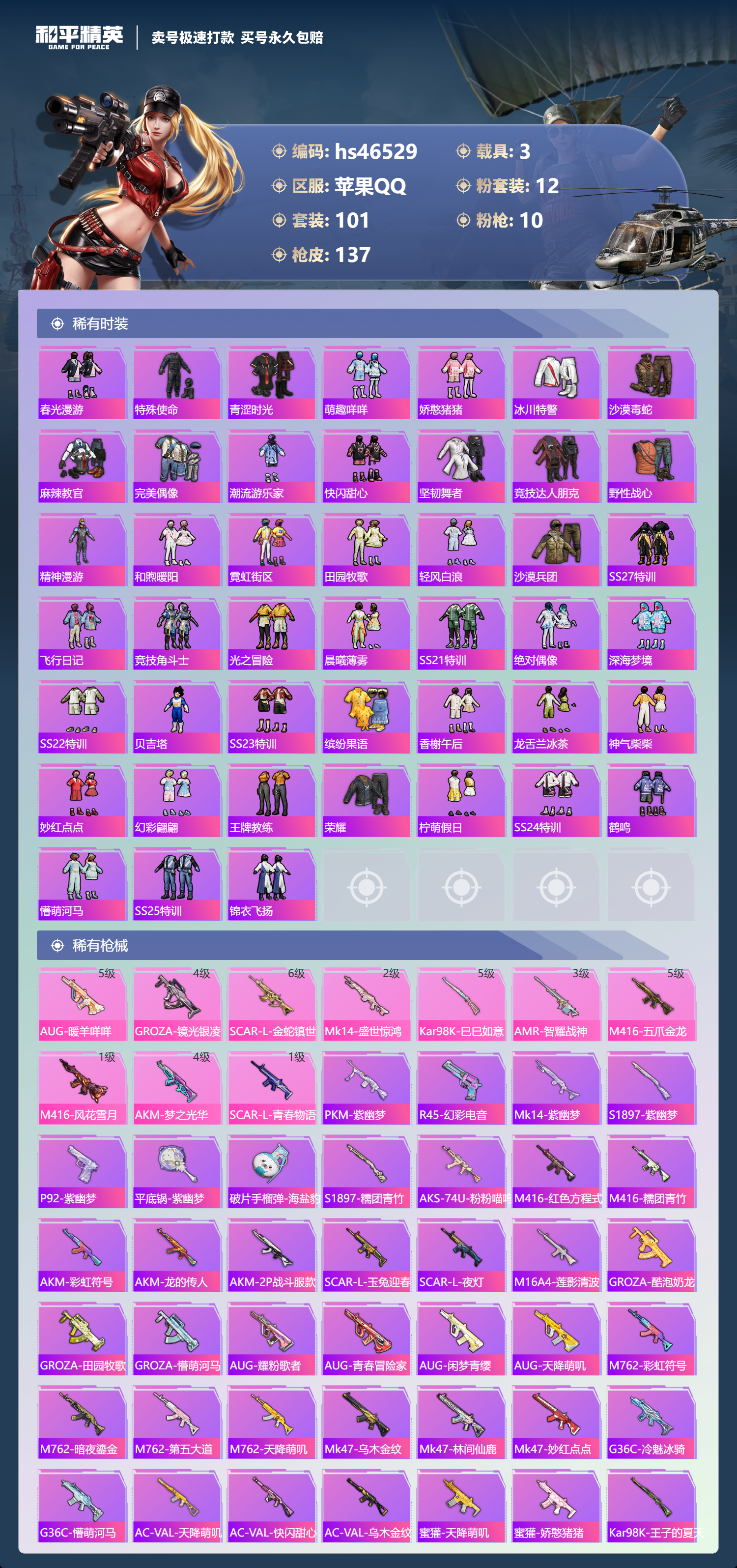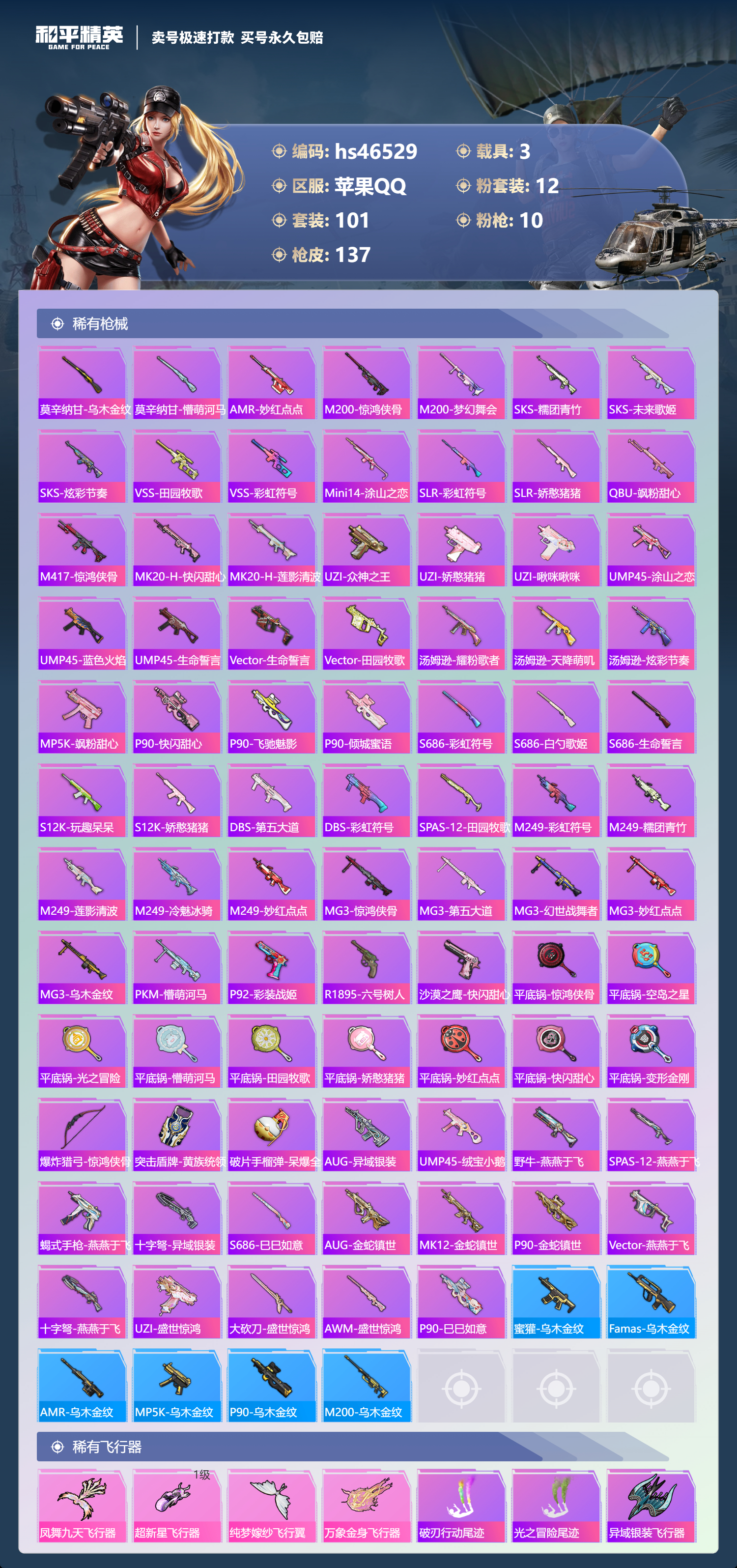 【10987850】【可二次】【苹果QQ】龟仙人 飓风飞鹰 M416-五爪金龙 漫步者 暗夜契约 赤焰黑爵 M416-风花雪月 AKM-梦之光华 MK47-林间仙鹿 山涧鹿灵 彩装战姬 SCAR-L-青春物语 暗影哥特 纯梦嫁纱飞行翼