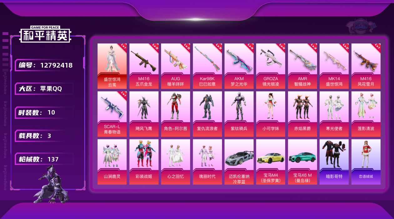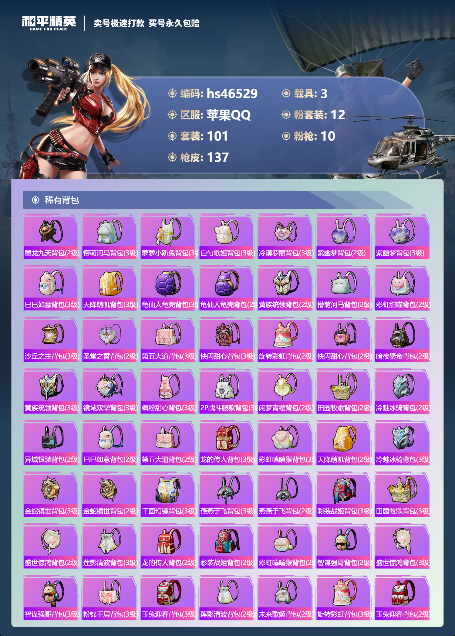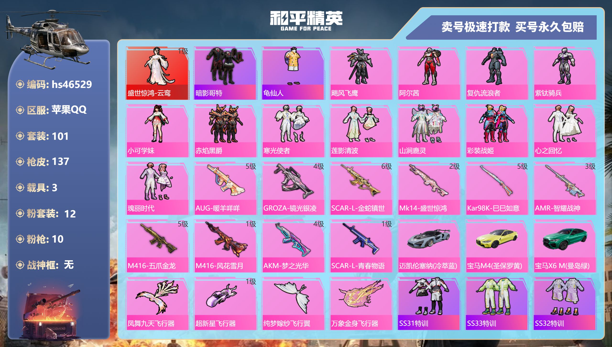 【10987850】【可二次】【苹果QQ】龟仙人 飓风飞鹰 M416-五爪金龙 漫步者 暗夜契约 赤焰黑爵 M416-风花雪月 AKM-梦之光华 MK47-林间仙鹿 山涧鹿灵 彩装战姬 SCAR-L-青春物语 暗影哥特 纯梦嫁纱飞行翼