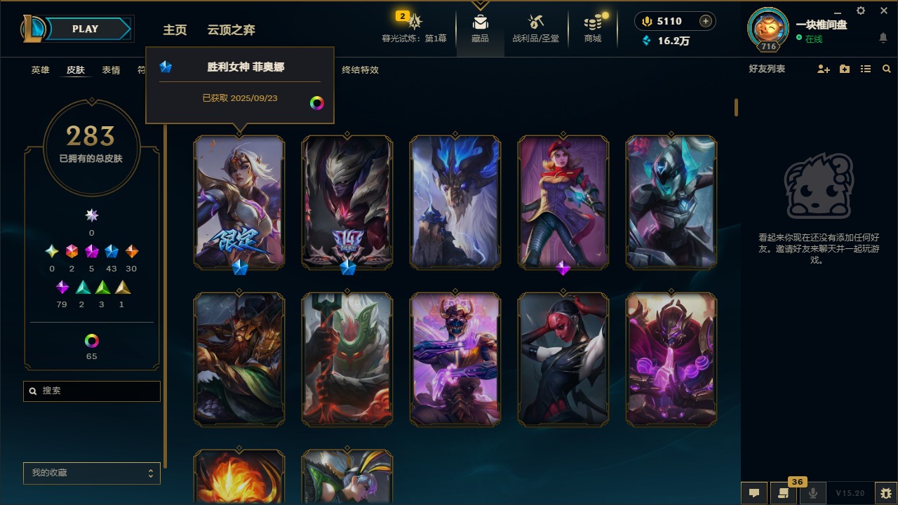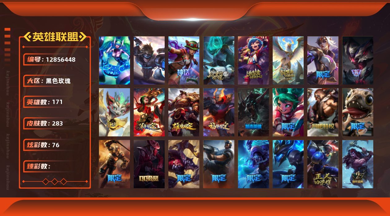 【11001773】2终极 5神话 43限定 30传说 79史诗 283皮肤 76炫彩 171英雄 可二次 可修改实名 【赛季限定皮】:胜利女神-菲奥娜,胜利巨口 克格莫,胜利之王 泰达米尔,胜利枪神 格雷福斯,胜利女神 奥莉安娜,胜利之剑 亚托克斯,胜利枪神 卢锡安,胜利机器人 布里茨【冠军限定系列】:S1FNC 迦娜,S2 暗杀星 蒙多,S5 SKT T1 瑞兹,S5 SKT T1 滑板鞋,