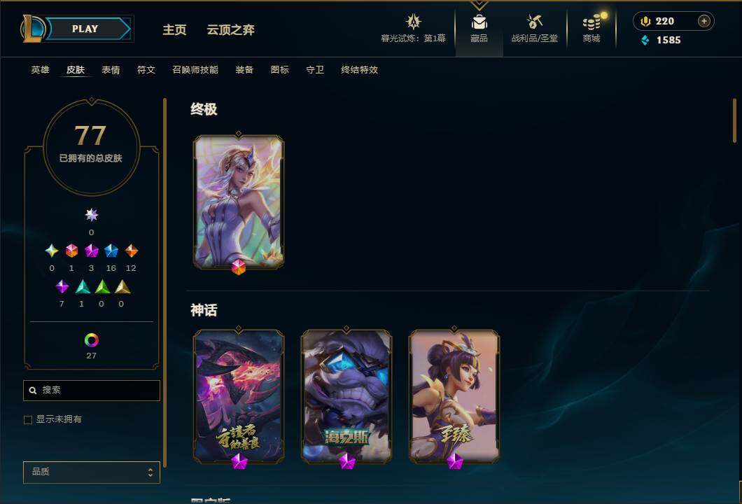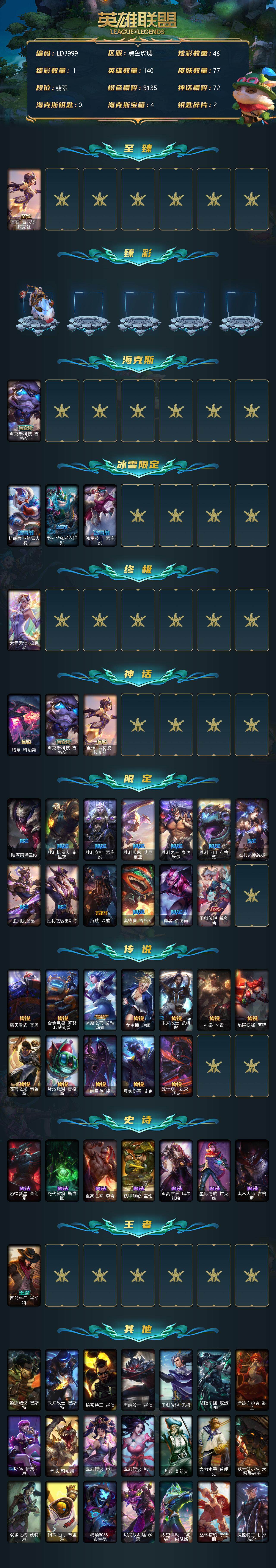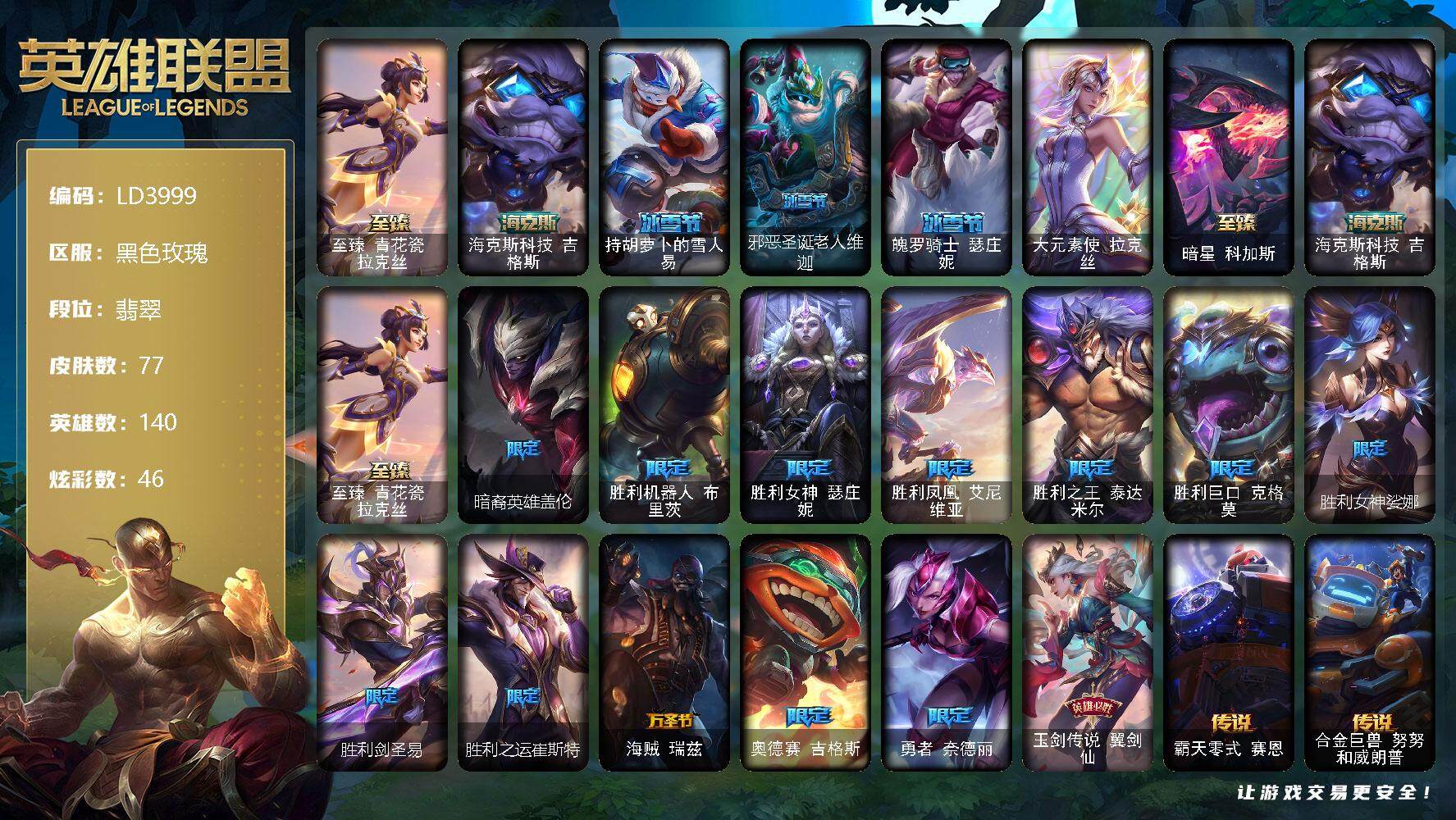 【11003033】【LD3999】140英雄/77皮肤/1终极/3神话/16限定/1臻彩/46炫彩/12传说/7史诗/流光翡翠账号等级:168/至臻青花瓷拉克丝/无畏骑士瑟庄妮赤子初心/海克斯科技吉格斯/持胡萝卜的雪人易/邪恶圣诞老人维迦/魄罗骑士瑟庄妮/大元素使拉克丝/暗星科加斯/暗裔英雄盖伦/胜利机器人布里茨/胜利女神瑟庄妮/胜利凤凰艾尼维亚/胜利之王泰达米尔/胜利巨口克格莫/胜利女神娑娜