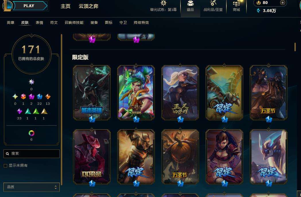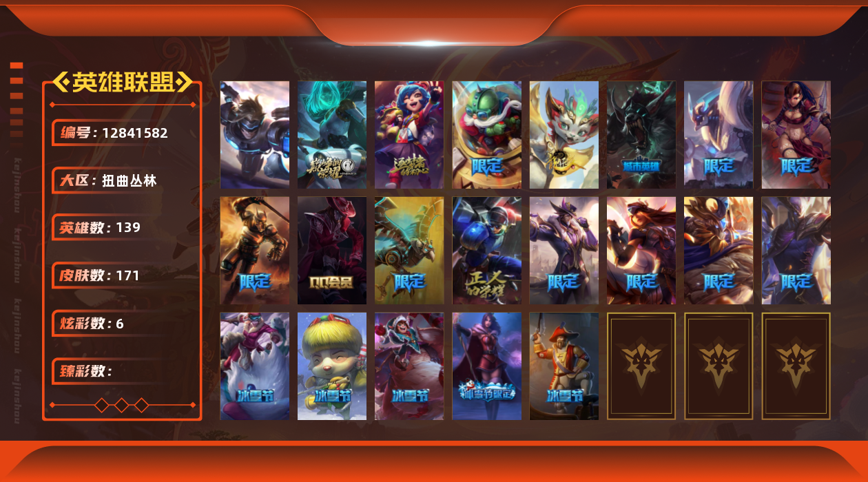 【11014596】[12841582]扭曲丛林英雄139/皮肤171/神话2/炫彩6未来战士/胜利之运 崔斯特/胜利女神 希维尔/胜利之树 茂凯/胜利之剑 亚托克斯/魄罗骑士 瑟庄妮/圣诞开心鬼 提莫/圣诞狂欢 努努和威朗普/幸福女神 乐芙兰/英勇玩具兵 普朗克/海贼 瑞兹/南瓜头 费德提克/黎明使者 永恩/至尊魔女 莫甘娜/星之守护者 阿狸/女警狙击 凯特琳/钢铁军团 盖伦/第三类接触 黑默