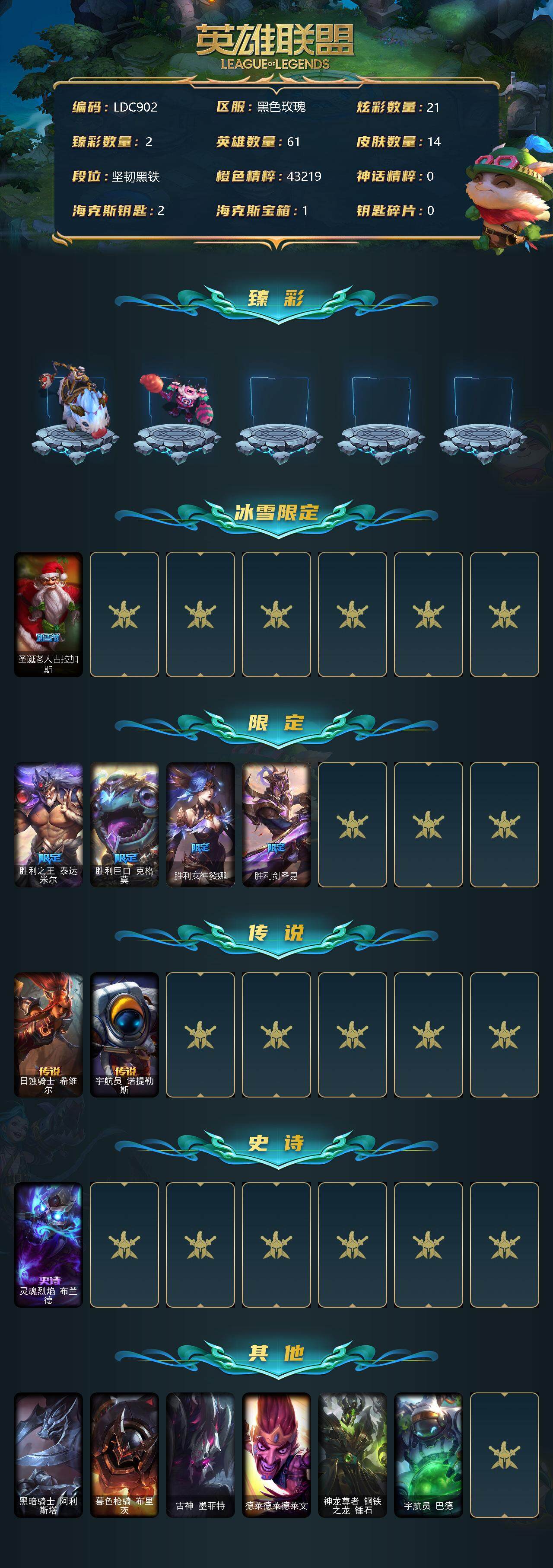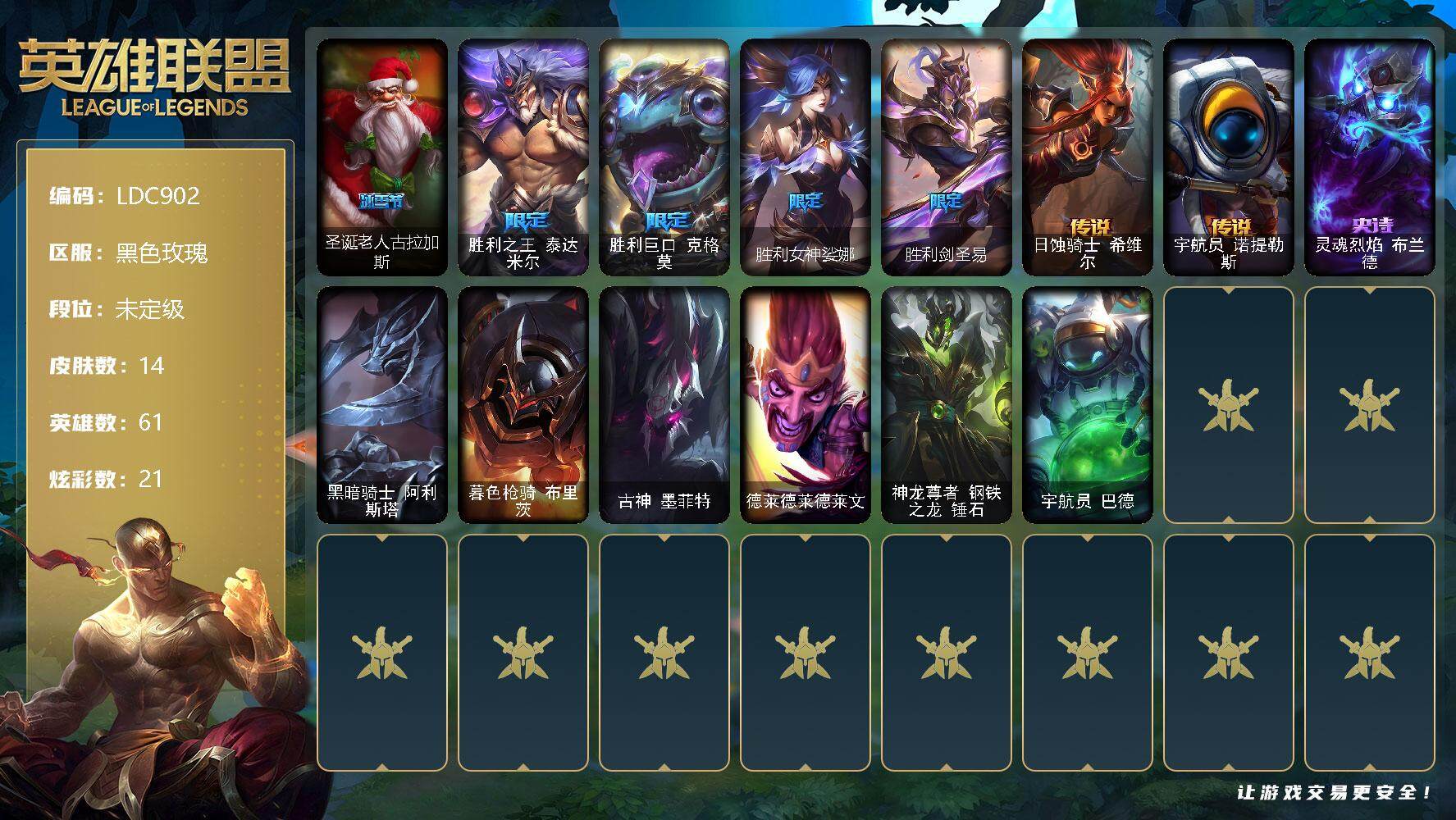 【11014699】【LDC902】61英雄/14皮肤/5限定/2臻彩/21炫彩/2传说/1史诗/未定级/无畏骑士瑟庄妮赤子初心/可爱可爱粉红红布里茨/圣诞老人古拉加斯/胜利之王泰达米尔/胜利巨口克格莫/胜利女神娑娜/胜利剑圣易/日蚀骑士希维尔/宇航员诺提勒斯/灵魂烈焰布兰德/黑暗骑士阿利斯塔/暮色枪骑布里茨/古神墨菲特/德莱德莱德莱文/神龙尊者钢铁之龙锤石/宇航员巴德