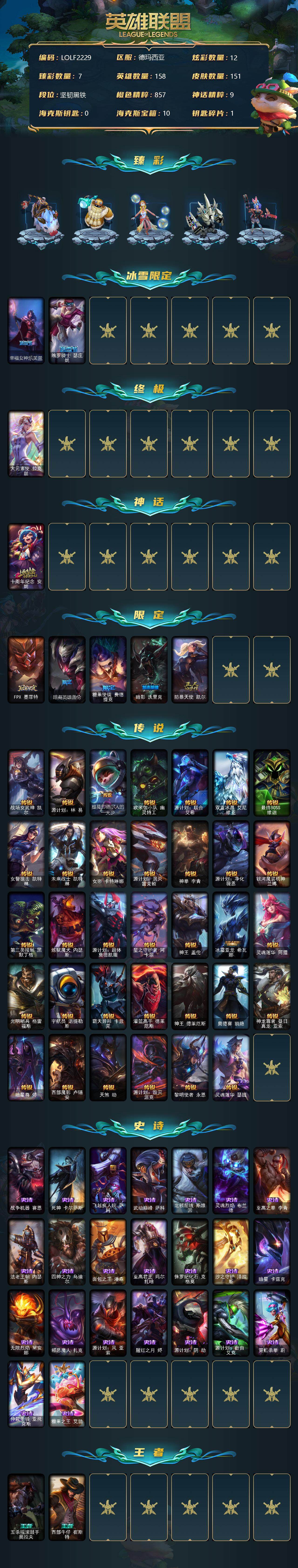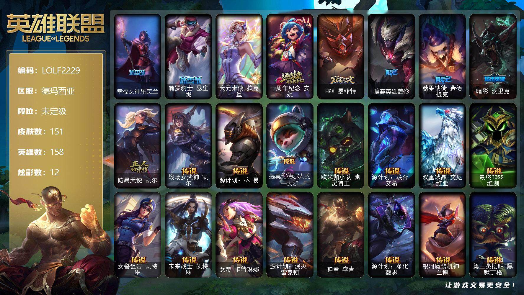 【11015396】【LOLF2229】158英雄/151皮肤/1终极/1神话/7限定/7臻彩/12炫彩/34传说/23史诗/未定级/无畏骑士瑟庄妮赤子初心/冰雪游神巴德炫金/泳池派对辛德拉荔枝枝连击/霸天巨兽雪崩墨菲特/幻灵战斗队长厄运小姐勇气赞歌/魔女阿卡丽虚荣/黑夜使者嘉文四世白夜/幸福女神乐芙兰/魄罗骑士瑟庄妮/大元素使拉克丝/十周年纪念安妮/FPX墨菲特/暗裔英雄盖伦/糖果使徒费德提克
