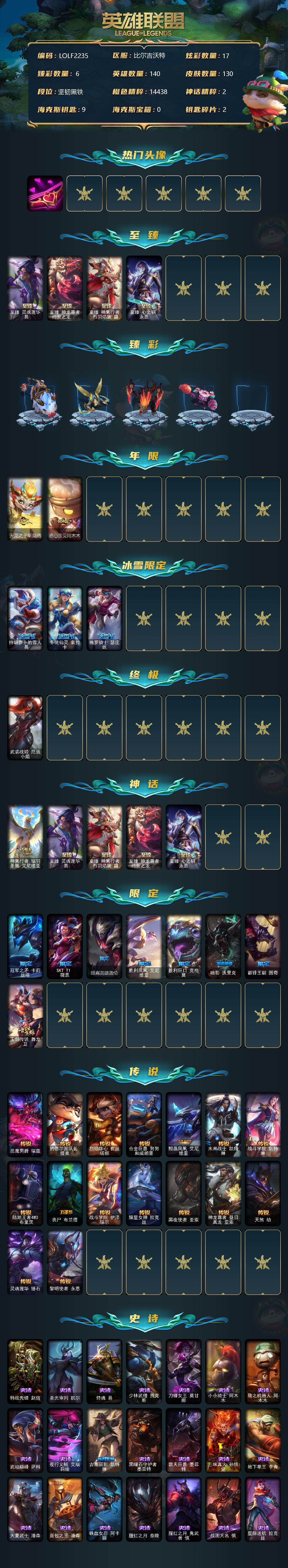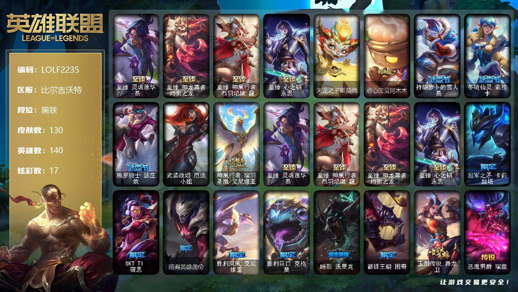 【11015400】【LOLF2235】140英雄/130皮肤/1终极/5神话/13限定/6臻彩/17炫彩/16传说/28史诗/黑铁/爱情之歌/至臻灵魂莲华易/至臻神龙尊者均衡之龙沃利贝尔/至臻神凰行者烈羽焰凰霞/至臻心之钢永恩/无畏骑士瑟庄妮赤子初心/冠军掠夺者卡兹克凯旋圣装/山海绘卷科加斯朱红/可爱可爱粉红红布里茨/星之守护者阿卡丽未来之光/魔女阿卡丽虚荣/天龙之子斯莫德/点心宝贝阿木木/持