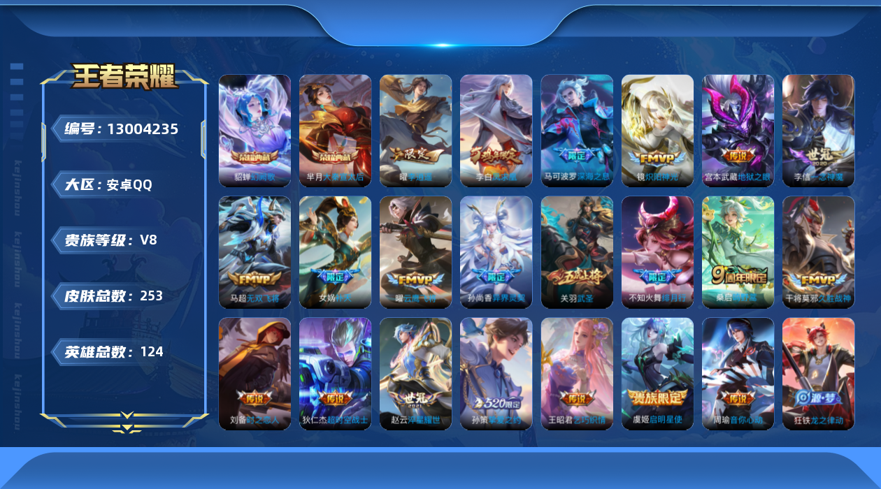 【11031448】炙心【可二次】[【安卓QQ】]安卓Q-V8-最强王者段位-124英雄-253皮肤-2典藏-0珍品无双-0无双-0珍品传说-21传说-76史诗【荣耀典藏】:芈月大秦宣太后,貂蝉幻阙歌【传说皮肤】:桑启鸣野蒿,不知火舞绯月行,马可波罗深海之息,马超无双飞将,孙策挚爱之约,女娲补天,孙尚香异界灵契,赵云淬星耀世,王昭君乞巧织情,曜李逍遥 ,周瑜音你心动,镜炽阳神光,虞姬启明星使,关