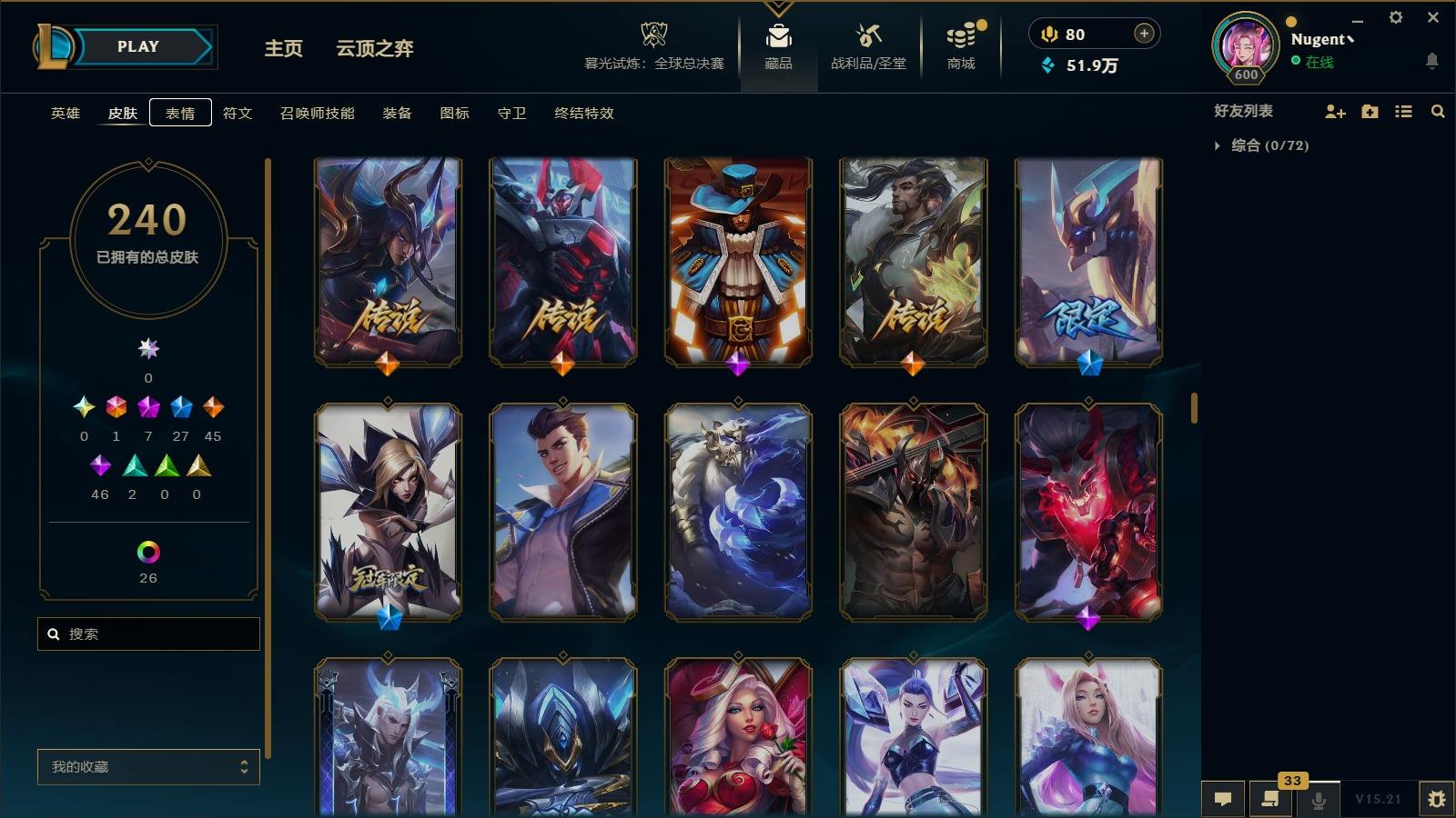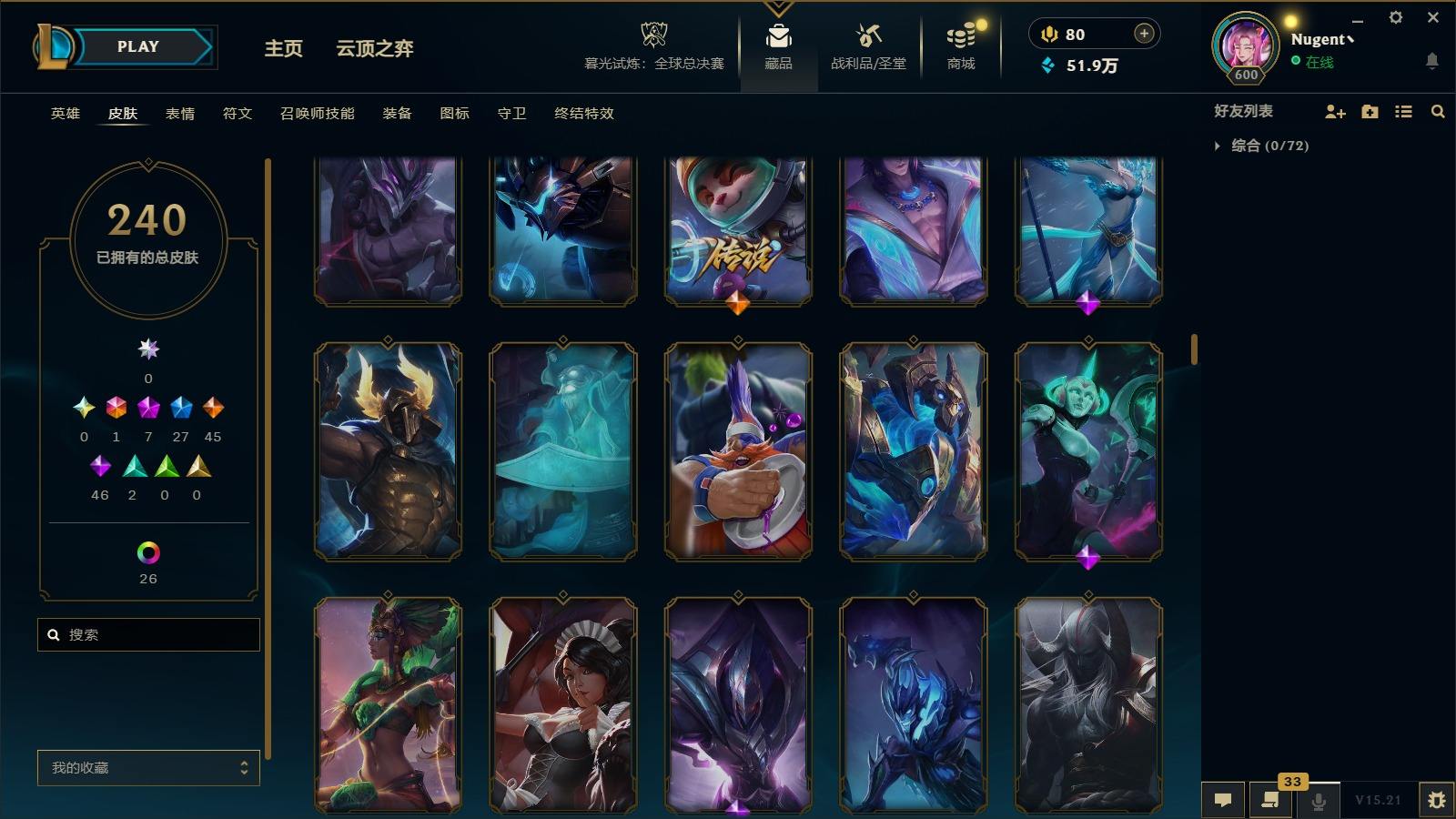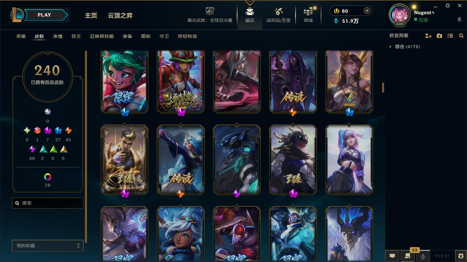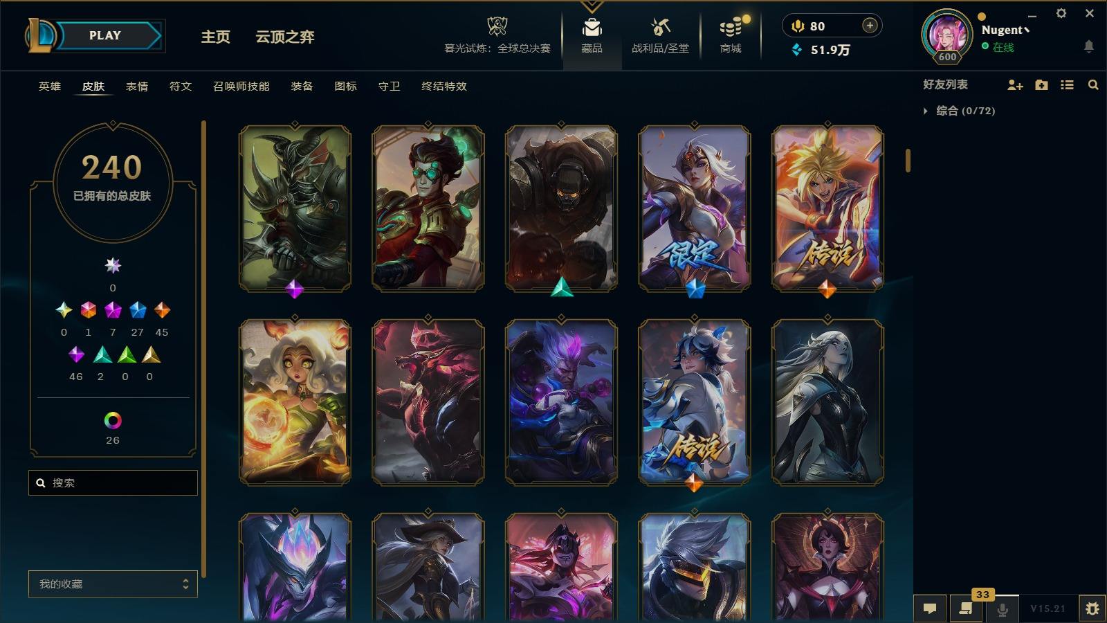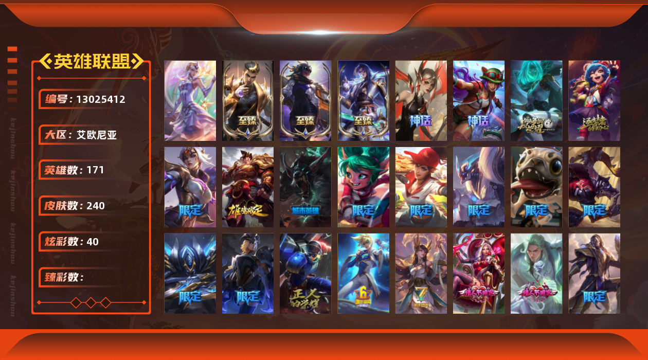 【11036146】[13025412]1终极 7神话 27限定 45传说 46史诗 240皮肤 40炫彩 171英雄 可二次 可修改实名 【至臻】:至臻 心之钢 永恩,至臻 T1 杰斯,至臻 真实伤害 赛娜,殿堂传奇 乐芙兰【情人节限定】:觅心女王 艾希,水晶玫瑰 斯维因【赛季限定皮】:胜利女神-菲奥娜,胜利之王 泰达米尔,胜利枪神 卢锡安,胜利女神 瑟庄妮【冠军限定系列】:S3 SKT T1