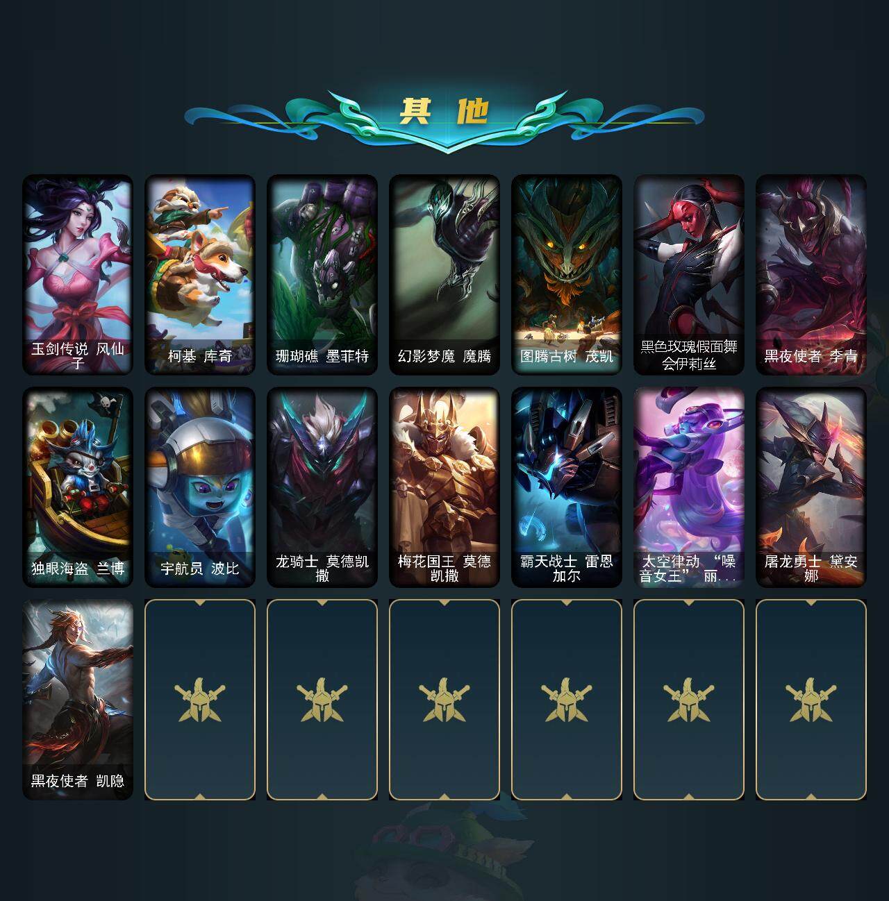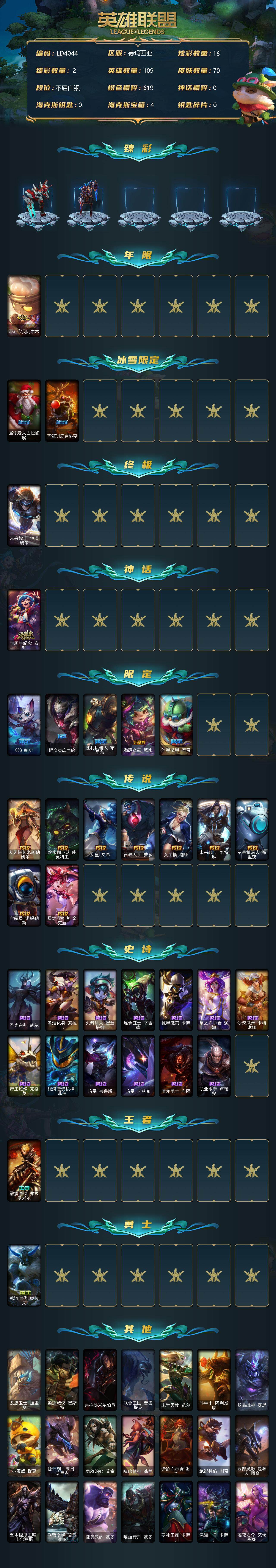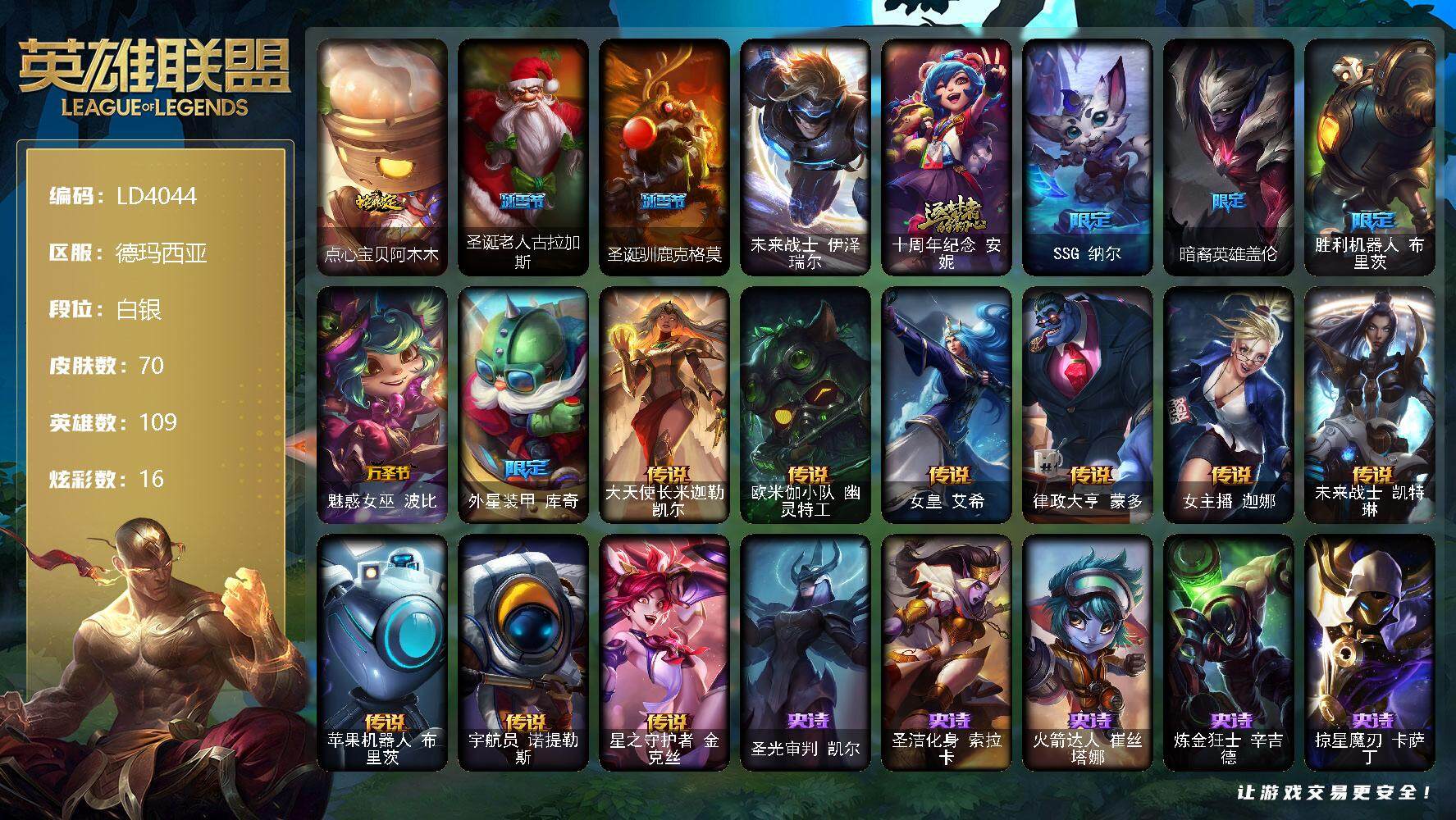 【11040621】【LD4044】109英雄/70皮肤/1终极/1神话/8限定/2臻彩/16炫彩/9传说/13史诗/白银/霸天战士雷恩加尔星啸天火/玉剑传说无劫胭脂/点心宝贝阿木木/圣诞老人古拉加斯/圣诞驯鹿克格莫/未来战士伊泽瑞尔/十周年纪念安妮/SSG纳尔/暗裔英雄盖伦/胜利机器人布里茨/魅惑女巫波比/外星装甲库奇/大天使长米迦勒凯尔/欧米伽小队幽灵特工/女皇艾希/律政大亨蒙多/女主播迦娜