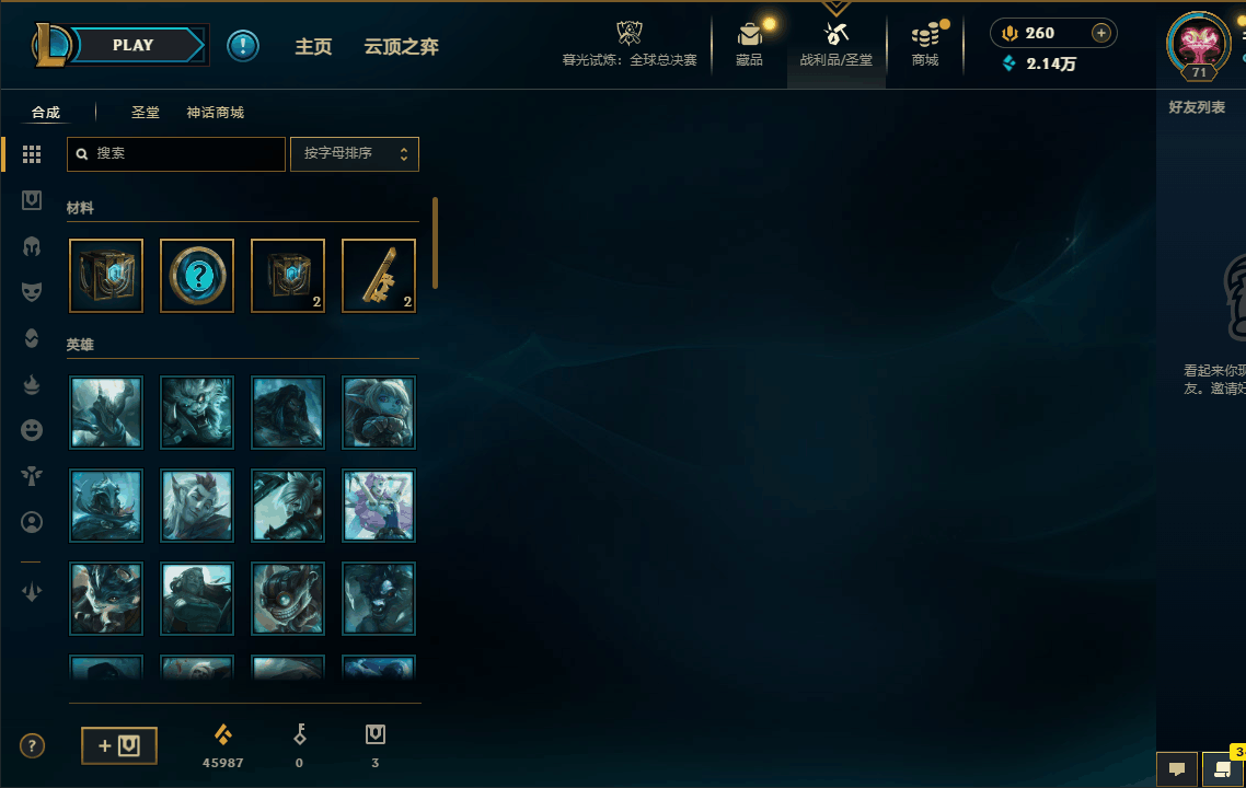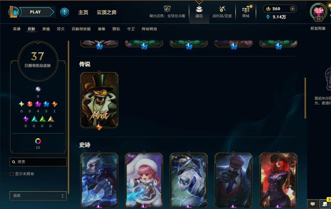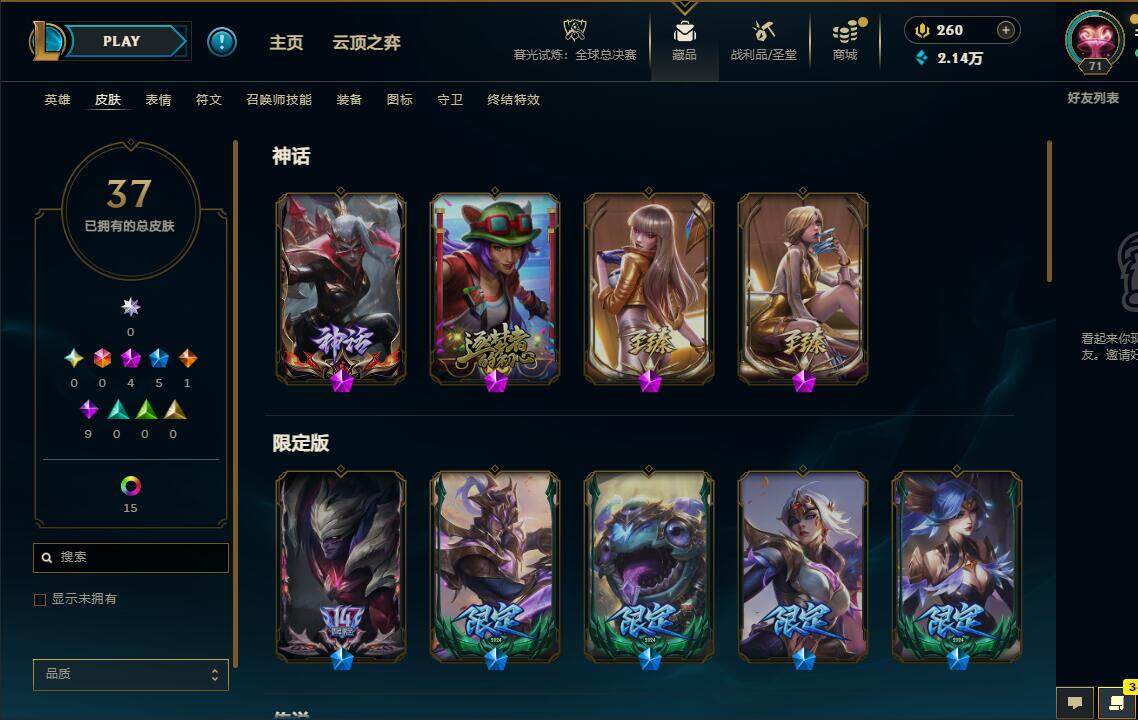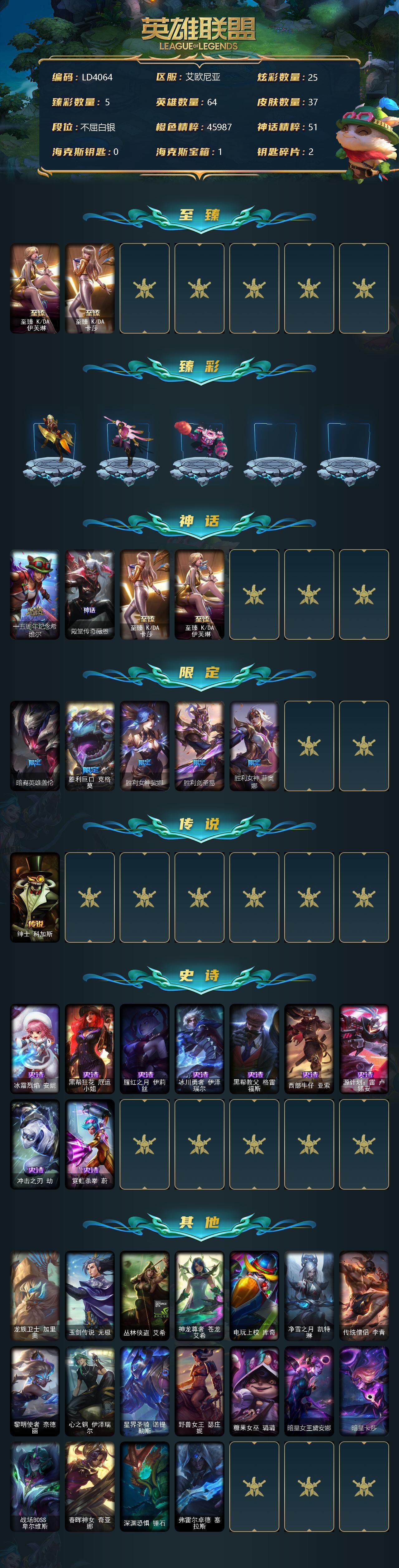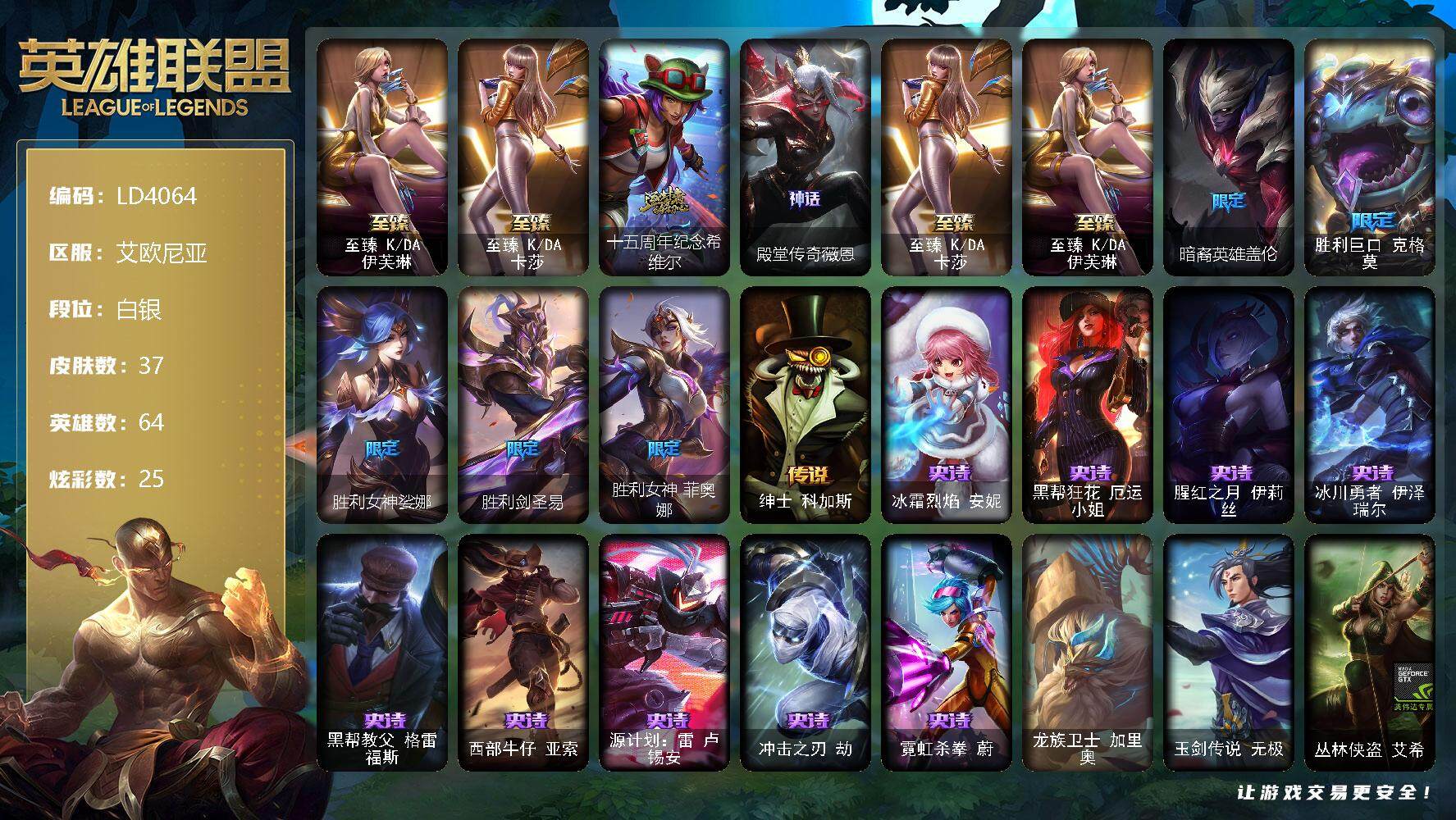 【11042752】【LD4064】64英雄/37皮肤/4神话/5限定/5臻彩/25炫彩/1传说/9史诗/白银账号等级:71/至臻K/DA伊芙琳/至臻K/DA卡莎/征服者韦鲁斯炫金/玉剑传说无影竞星/灵魂莲华亚索霜见之时/可爱可爱粉红红布里茨/十五周年纪念希维尔/殿堂传奇薇恩/暗裔英雄盖伦/胜利巨口克格莫/胜利女神娑娜/胜利剑圣易/胜利女神菲奥娜/绅士科加斯/冰霜烈焰安妮/黑帮狂花厄运小姐/腥红