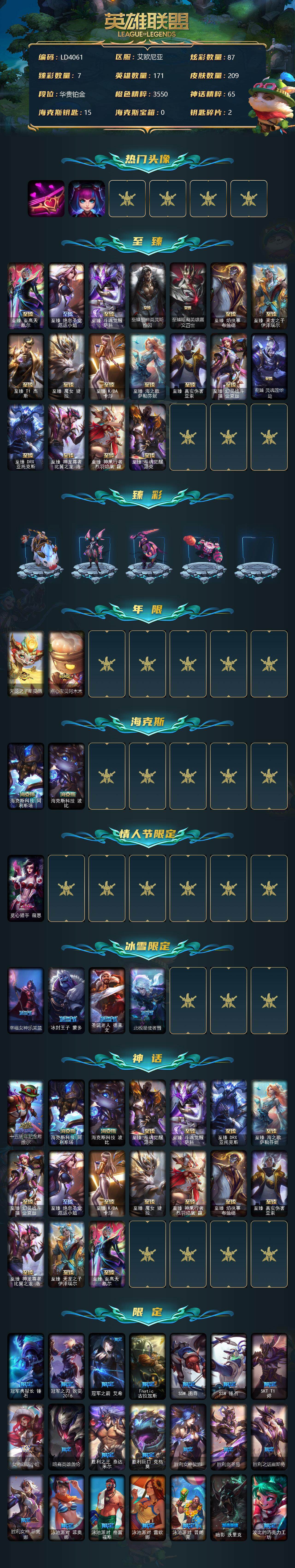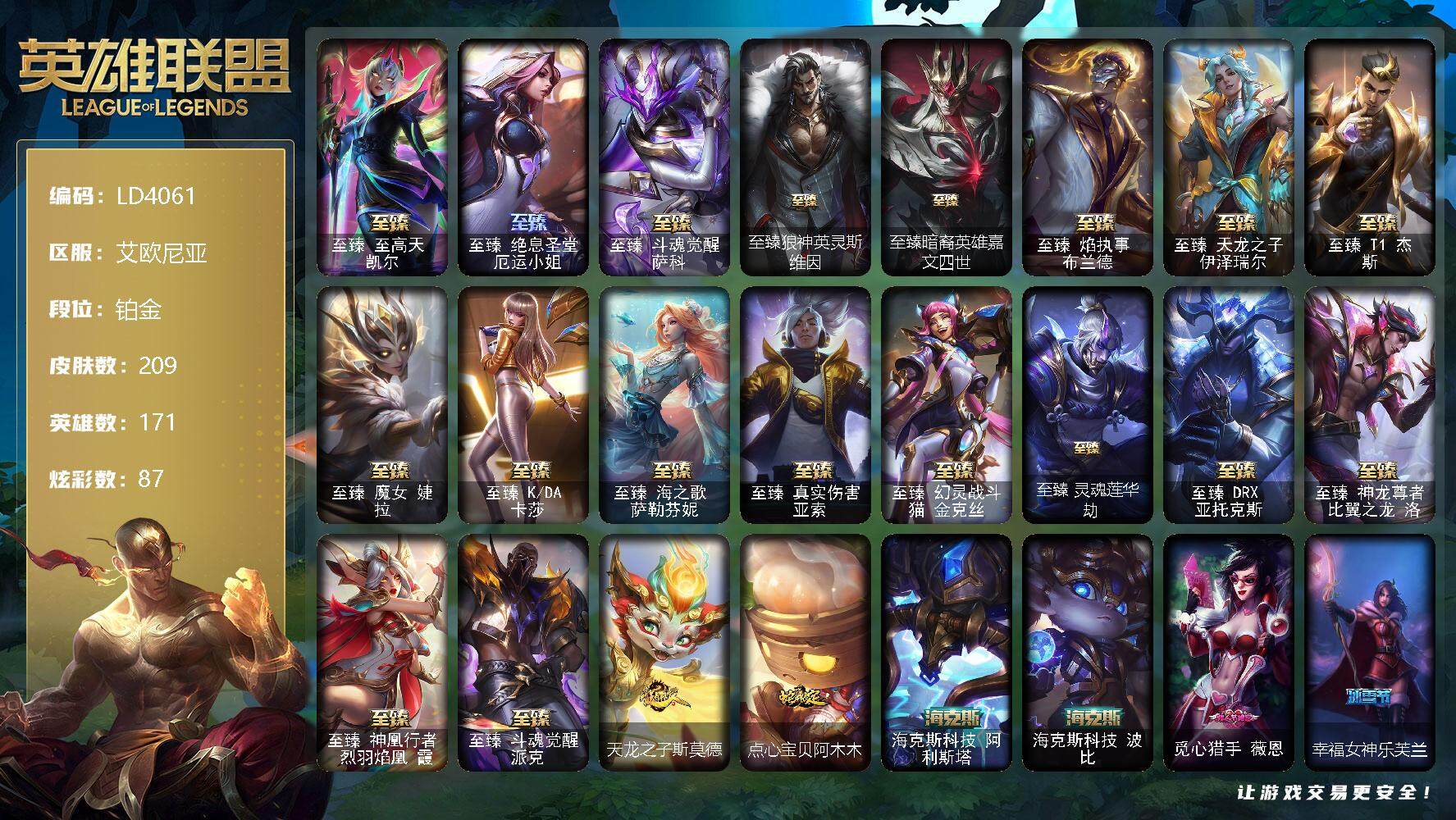 【11042987】【LD4061】171英雄/209皮肤/21神话/30限定/7臻彩/87炫彩/26传说/27史诗/铂金账号等级:394/爱情之歌/银河魔装机神安妮/至臻至高天凯尔/至臻绝息圣堂厄运小姐/至臻斗魂觉醒萨科/至臻狼神英灵斯维因/至臻暗裔英雄嘉文四世/至臻焰执事布兰德/至臻天龙之子伊泽瑞尔/至臻T1杰斯/至臻魔女婕拉/至臻K/DA卡莎/至臻海之歌萨勒芬妮/至臻真实伤害亚索/至臻幻灵