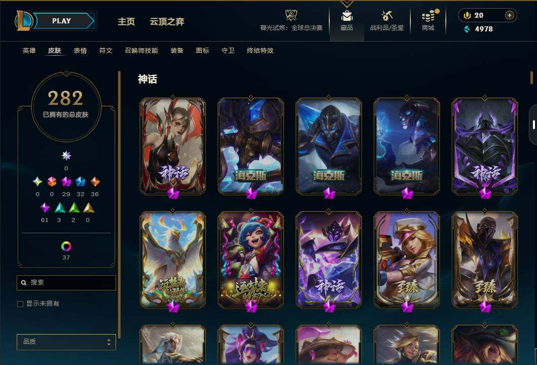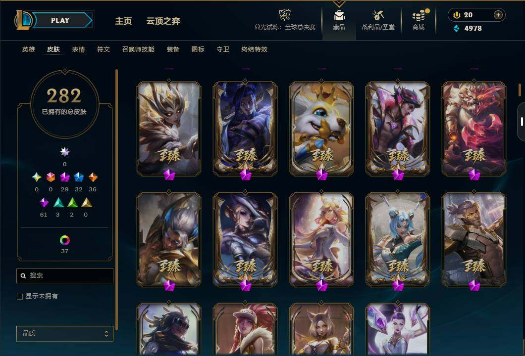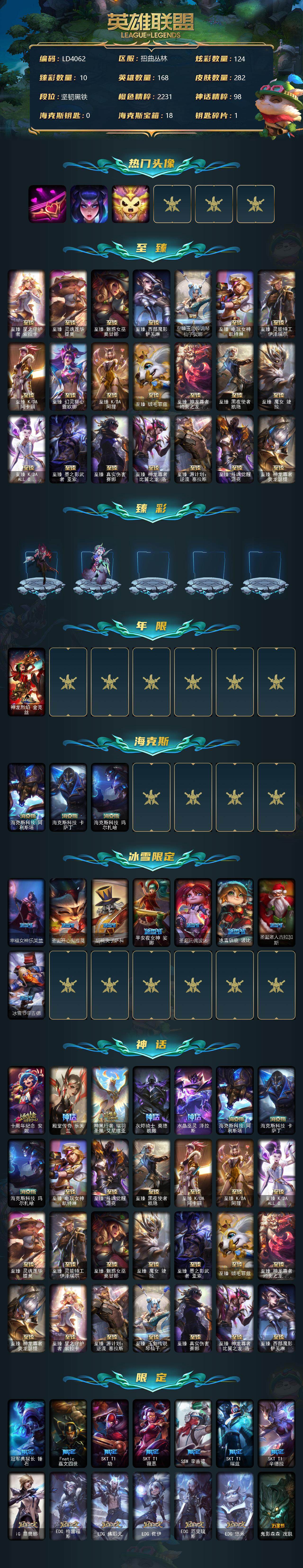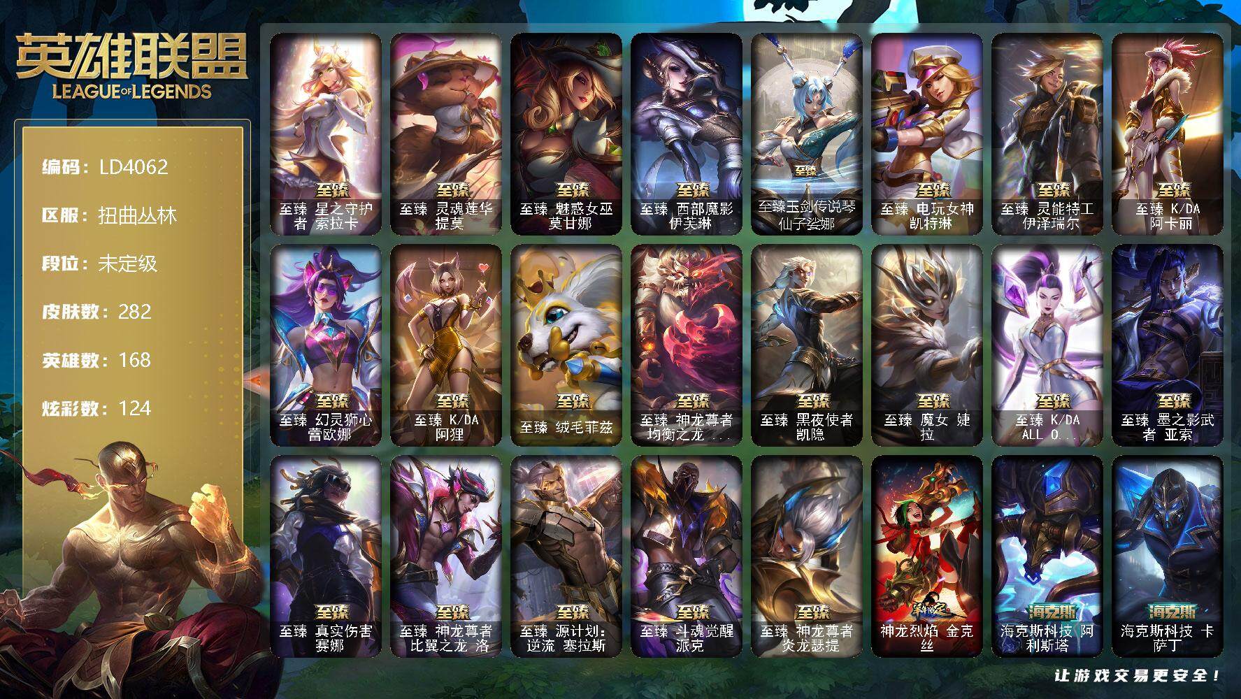 【11042988】【LD4062】168英雄/282皮肤/29神话/32限定/10臻彩/124炫彩/36传说/61史诗/未定级账号等级:332/爱情之歌/玉剑传说苍鸾/星守索拉卡/至臻星之守护者索拉卡/至臻灵魂莲华提莫/至臻魅惑女巫莫甘娜/至臻西部魔影伊芙琳/至臻玉剑传说琴仙子/至臻电玩女神凯特琳/至臻灵能特工伊泽瑞尔/至臻K/DA阿卡丽/至臻幻灵狮心蕾欧娜/至臻K/DA阿狸/至臻绒毛菲兹/至