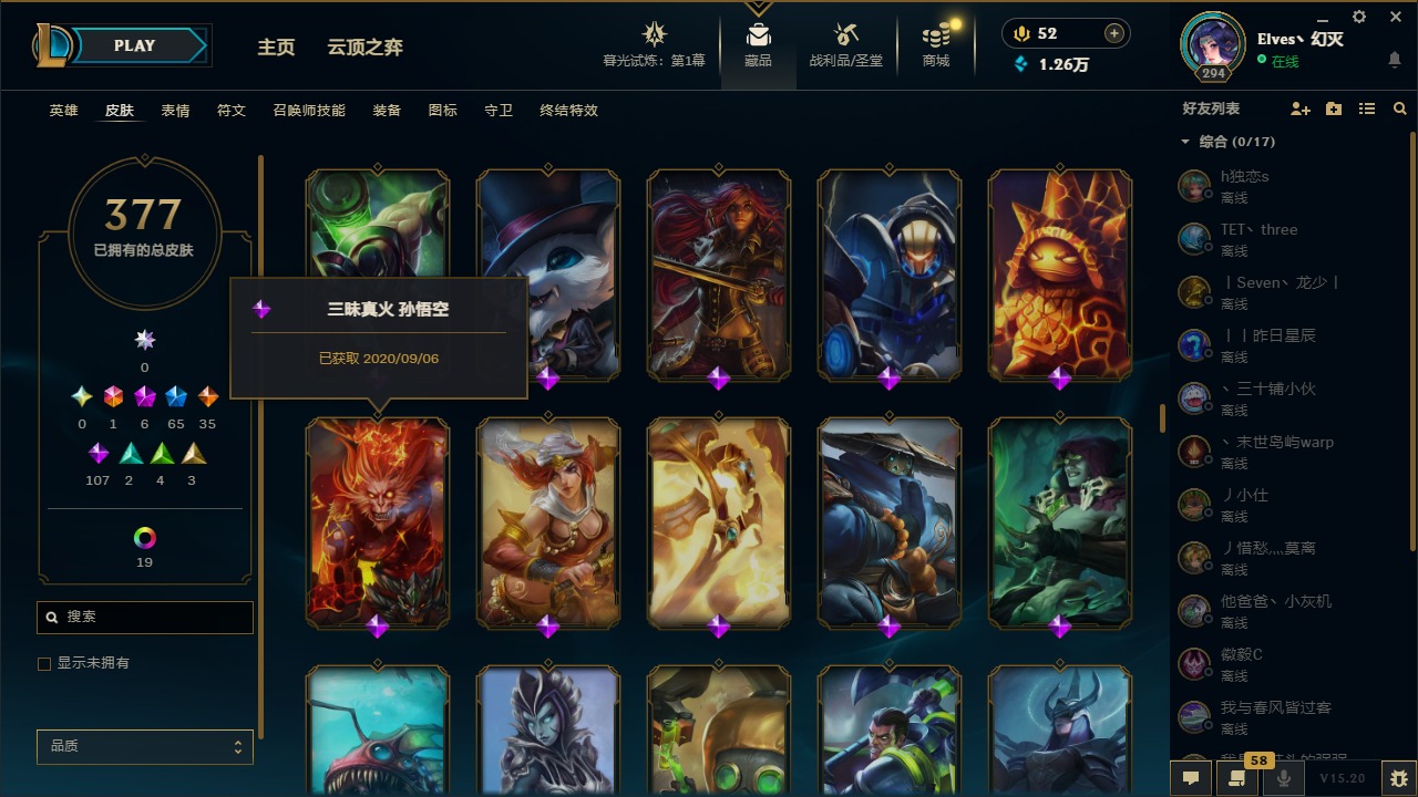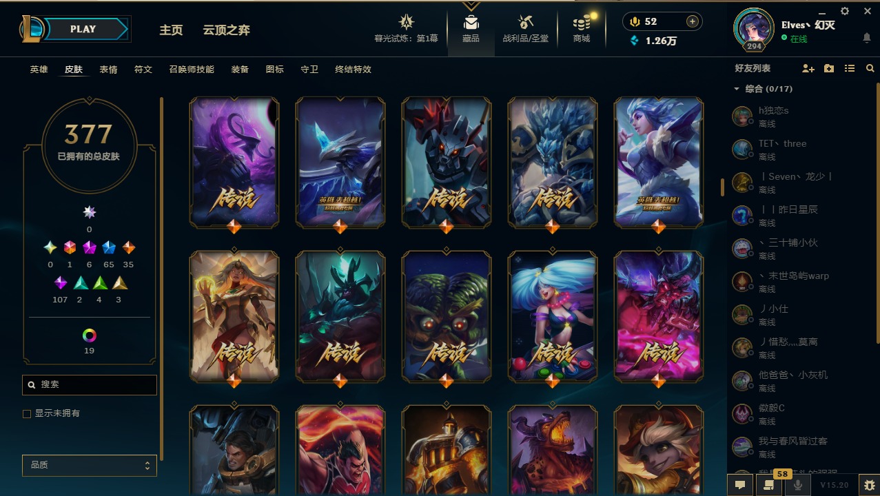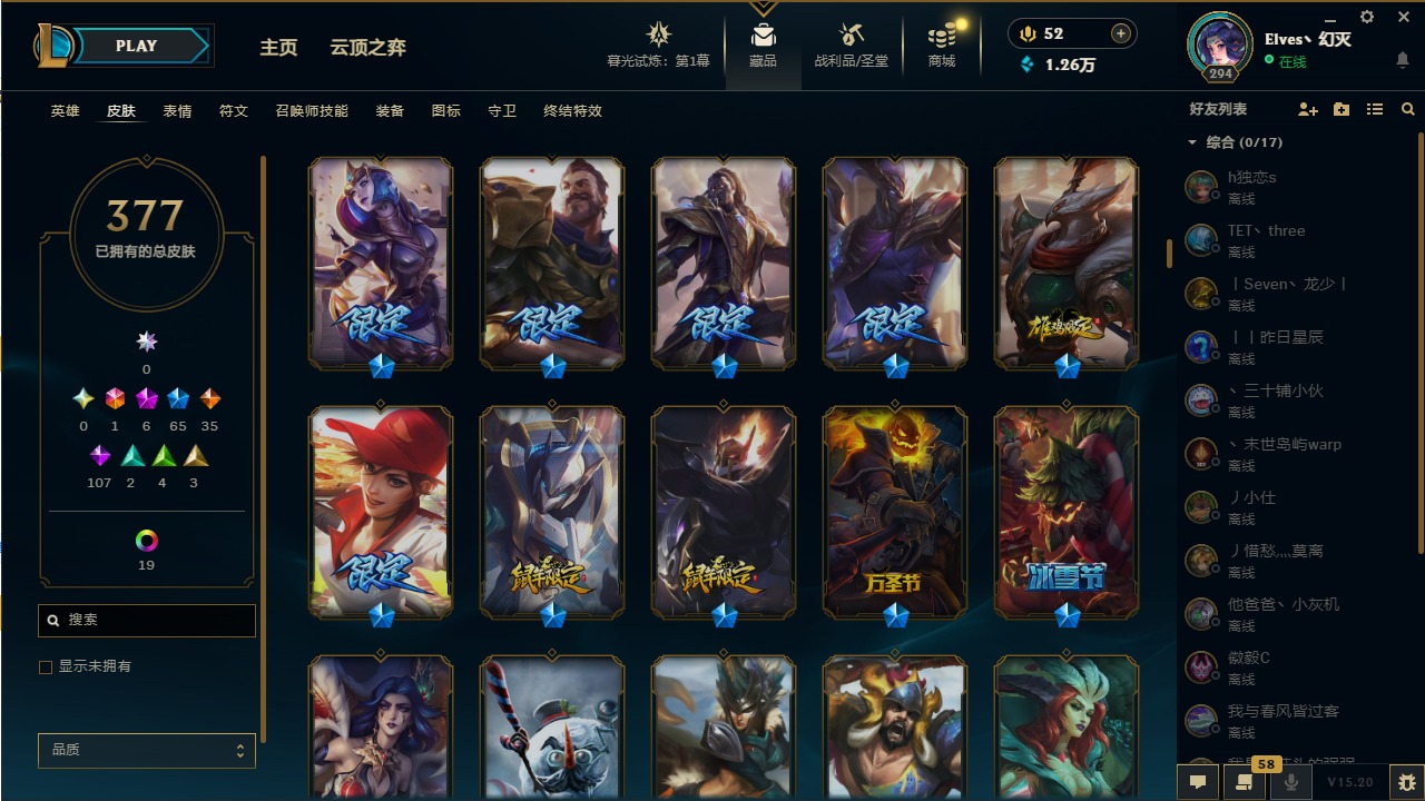 【11043571】1终极 6神话 65限定 35传说 107史诗 377皮肤 28炫彩 158英雄 可二次 可修改实名 【至臻】:至臻 王国机神玄武 盖伦,至臻 灵能特工 伊泽瑞尔【海克斯】:海克斯 玛尔扎哈【赛季限定皮】:胜利枪神 格雷福斯,胜利女神 奥莉安娜,胜利之剑 亚托克斯,胜利枪神 卢锡安,胜利机器人 布里茨【冠军限定系列】:S1FNC 酒桶,S1FNC 迦娜,S2 暗杀星 努努,S