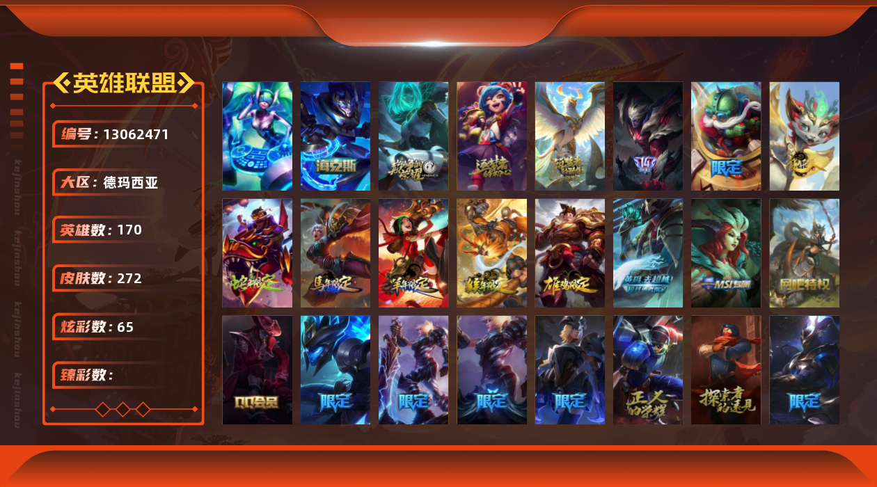 【11043635】[13062471]1终极 4神话 53限定 30传说 67史诗 272皮肤 65炫彩 170英雄 可二次 可修改实名 【海克斯】:海克斯 嘉文四世【限定】:玉剑传说 舞龙卫,元老议会 玛尔扎哈,穿星魔锋 赵信【赛季限定皮】:胜利女神 伊莉丝,胜利女神 莫甘娜,胜利女神 希维尔,胜利之树 茂凯,胜利枪神 格雷福斯,胜利女神 奥莉安娜,胜利之剑 亚托克斯,胜利枪神 卢锡安【冠军