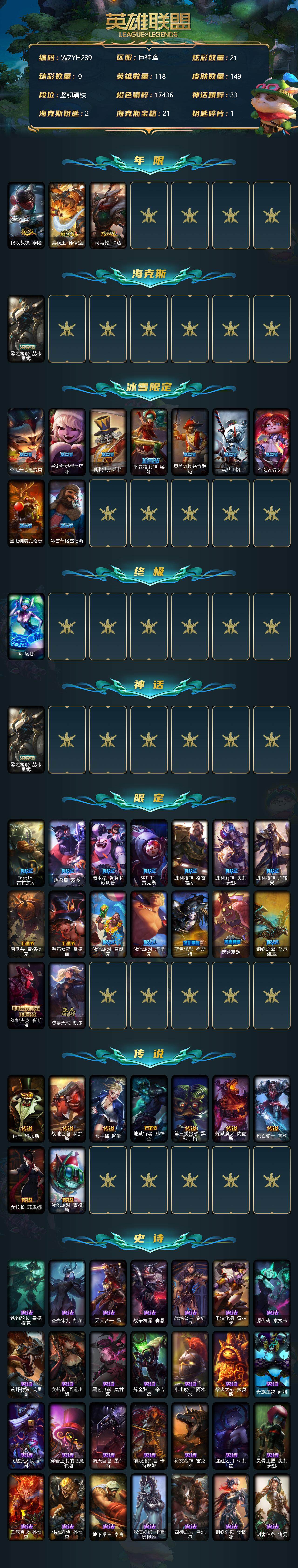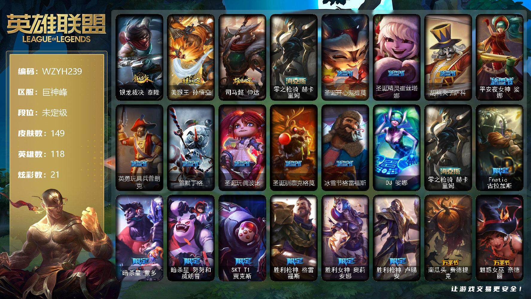【11054856】【WZYH239】118英雄/149皮肤/1终极/1神话/28限定/21炫彩/9传说/40史诗/未定级/银龙裁决泰隆/美猴王孙悟空/司马懿仲达/零之枪骑赫卡里姆/圣诞开心鬼提莫/圣诞精灵崔丝塔娜/胡桃夹子萨科/平安夜女神娑娜/英勇玩具兵普朗克/雪默丁格/圣诞玩偶波比/圣诞驯鹿克格莫/冰雪节格雷福斯/DJ娑娜/Fnatic古拉加斯/暗杀星蒙多/暗杀星努努和威朗普/SKTT1贾克