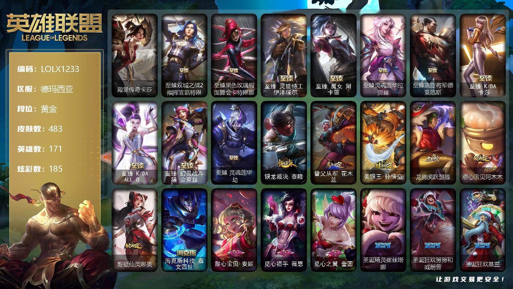 【11056963】【LOLX1233】171英雄/483皮肤/16神话/55限定/12臻彩/185炫彩/48传说/106史诗/黄金/殿堂传奇卡莎/至臻双城之战2指挥官凯特琳/至臻黑色玫瑰假面舞会卡特琳娜/至臻灵能特工伊泽瑞尔/至臻魔女阿卡丽/至臻灵魂莲华拉克丝/至臻凯旋将军德莱厄斯/至臻K/DA卡莎/至臻K/DAALLOUT卡莎/至臻幻灵战斗猫金克丝/至臻灵魂莲华劫/天龙之子卡莎飞龙乘云/无畏