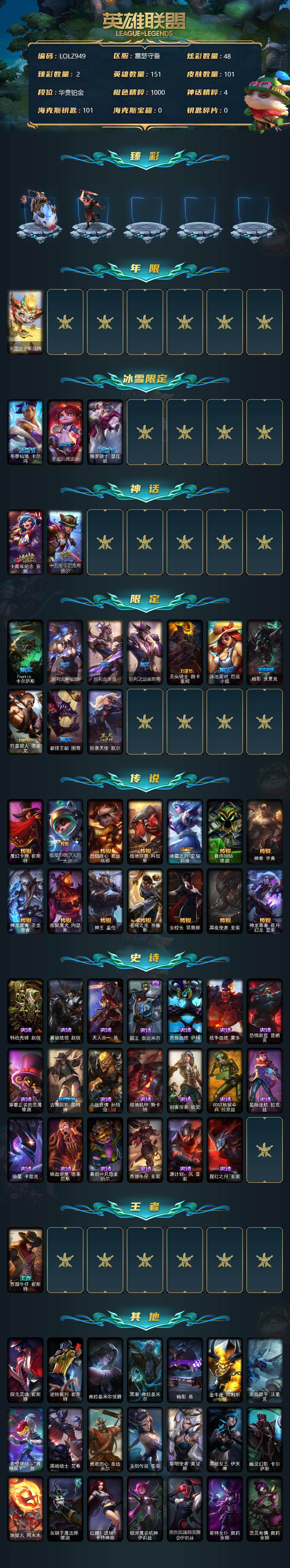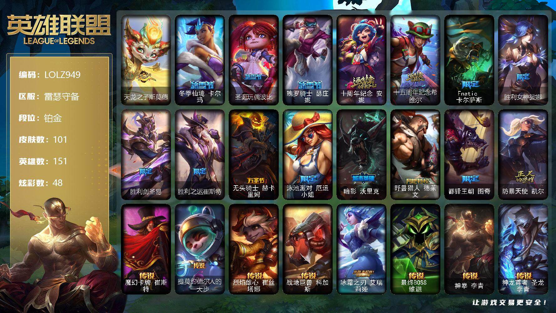 【11060691】【LOLZ949】151英雄/101皮肤/2神话/14限定/2臻彩/48炫彩/14传说/20史诗/铂金/无畏骑士瑟庄妮赤子初心/灰烬守护者慎余烬觉醒/天龙之子斯莫德/冬季仙境卡尔玛/圣诞玩偶波比/魄罗骑士瑟庄妮/十周年纪念安妮/十五周年纪念希维尔/Fnatic卡尔萨斯/胜利女神娑娜/胜利剑圣易/胜利之运崔斯特/无头骑士赫卡里姆/泳池派对厄运小姐/暗影妖狐阿狸/野兽猎人德莱文/