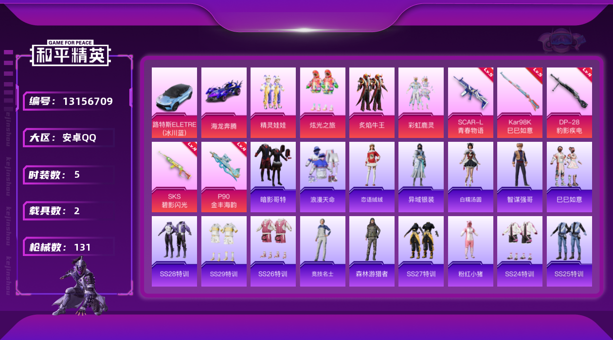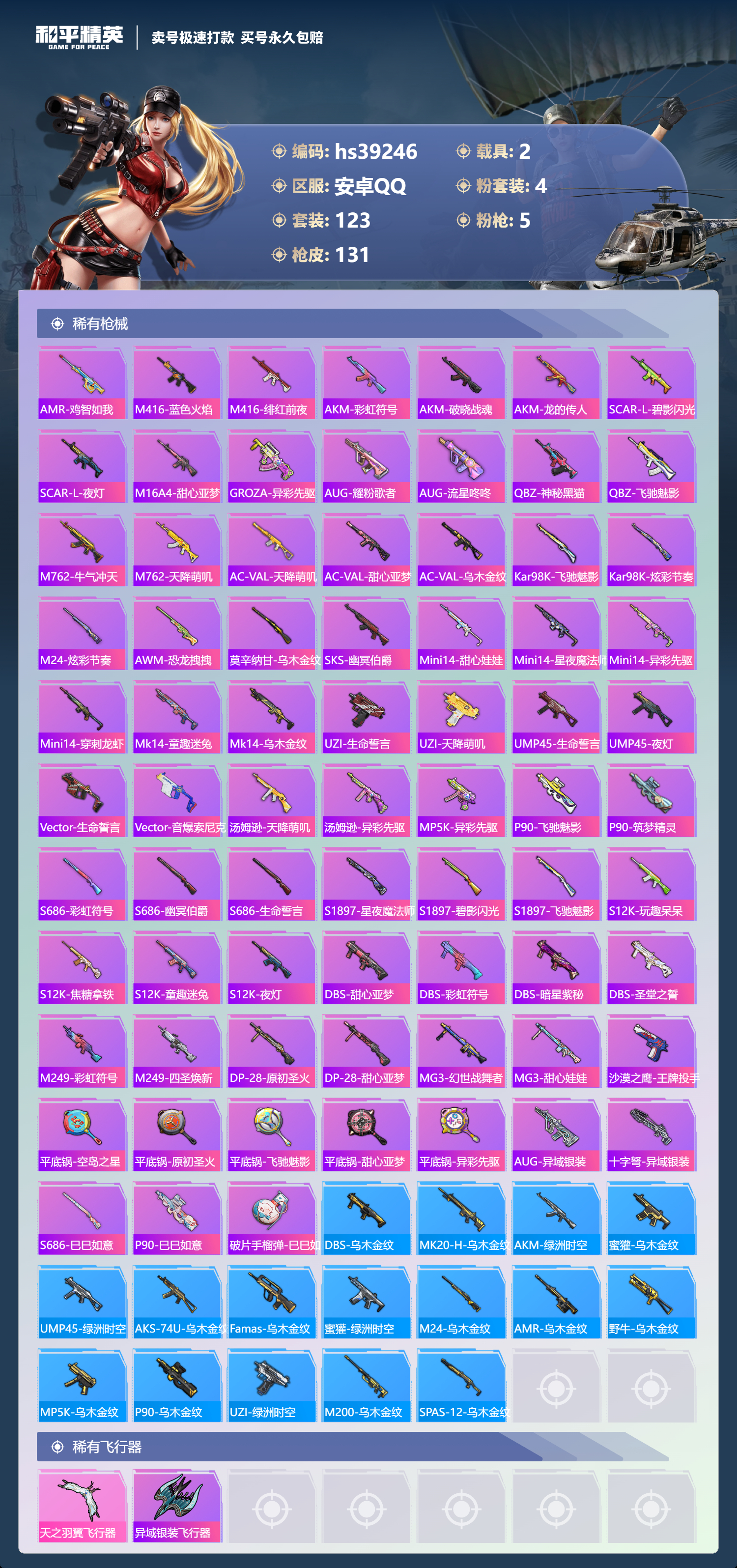 【11064432】【可二次】【安卓QQ】龟仙人 P90-金丰海韵 海龙奔腾 狂沙舞者 极速红龙 彩虹鹿灵 豚鼠丹丹 精灵娃娃 恶魔人蛛 童话森林 粉红小猪 天之羽翼飞行器 SKS-碧影闪光 浪漫天命 SCAR-L-青春物语 暗影哥特 幽冥伯爵 路特斯EL蓝色