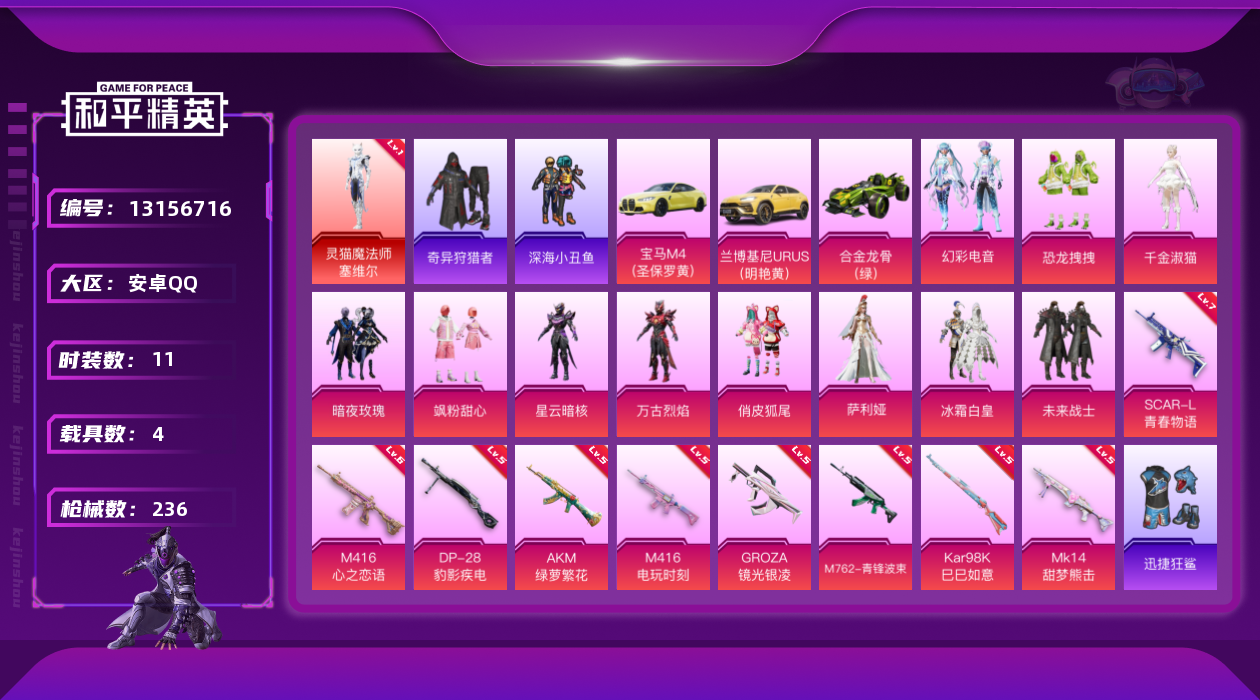 【11064435】【不可二次】【安卓QQ】龟仙人 AKM-绿萝繁花 恐龙拽拽 S686-奇异狩猎者 M762-青锋波束 漫步者 韶华初心 豚鼠丹丹 M416-电玩时刻 软嫩糖心蛋 M416-心之恋语 深海小丑鱼 影双刃 瑞龙福将 浪漫天命 激萌罗小黑 团圆交子 合金龙骨绿色 迅捷狂鲨 奇异狩猎者 M762-瑞龙福将 狂沙舞者 兰博SUV黄色 变形金刚飞行器 暗夜玫瑰 未来战士 风华少年志 神秘