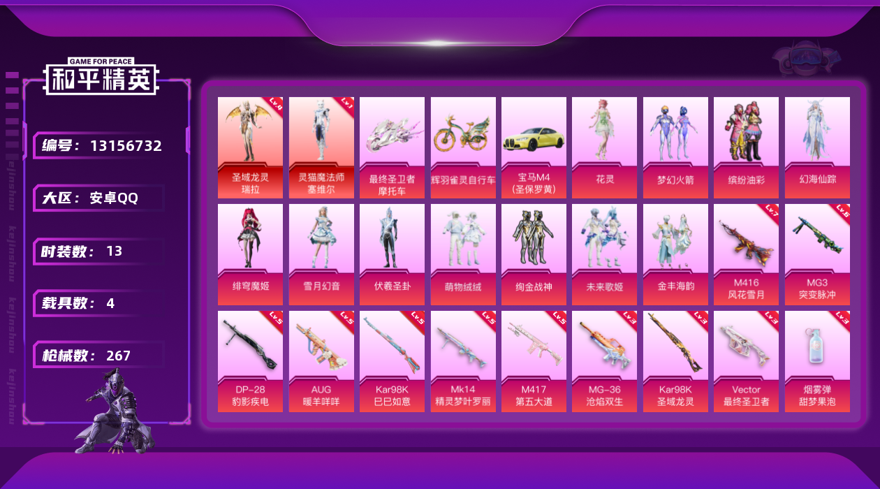 【11064437】【不可二次】【安卓QQ】龟仙人 MK14-精灵梦叶罗丽 绚金战神 MG3-突变脉冲 漫步者 M24-奇异狩猎者 M762-瑞龙福将 M417射手步枪 M416-风花雪月 梦幻火箭 缤纷油彩 粉红小猪 瑞龙福将 醒狮腾龙 M417-第五大道 浪漫天命 雪山精英 团圆交子 AKM-奇异狩猎者