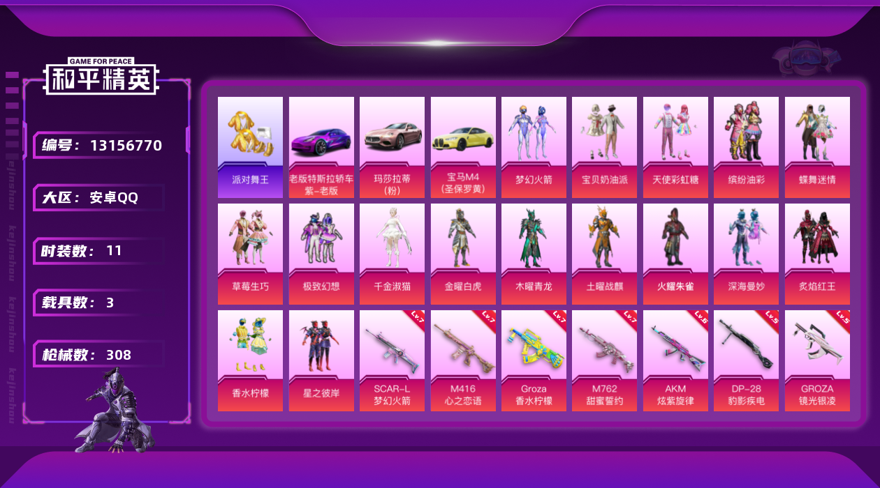 【11064448】【不可二次】【安卓QQ】M762-甜蜜誓约 龟仙人 水银刺客 大橘为重 金曜白虎 M249-古堡领主 木耀青龙 不夜海上花 韶华初心 土耀战麟 M416-心之恋语 缤纷油彩 浪漫波比 影双刃 蝶舞迷情 纯白誓言 SCAR-L-梦幻火箭 潮萌小黄鸭 黑色刀锋 新侠客行 极致幻想 AKM-炫紫旋律 香水柠檬 白月香洋装 PEL轰鸣竞梦者飞行器 金耀白虎 草莓生巧 神秘黑猫 静谧青