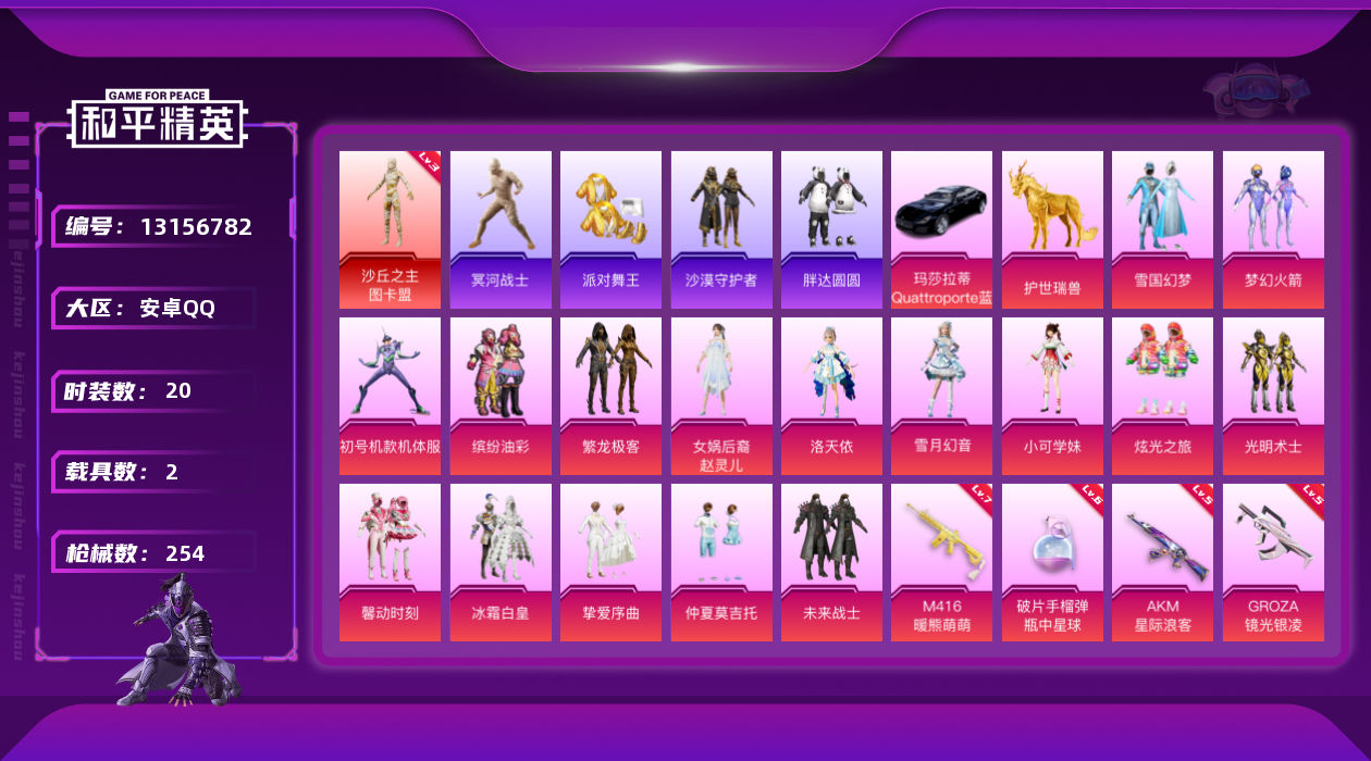 【11064452】【不可二次】【安卓QQ】龟仙人 木乃伊 AKM-星际浪客 M762-青锋波束 雪国梦幻 洛天依 豚鼠丹丹 沙丘之主-图卡盟 UMP45-量子极限 M249-彩虹甜喵 M416-暖熊萌萌 M416-心之恋语 缤纷油彩 馨动时刻 AWM-激战未来 蜜獾-辉耀战甲 沙漠守护者 浪漫天命 梦幻火箭飞行器 镜光幻境飞行翼 激萌罗小黑 胖达圆圆 MG3-洛神天依 龙翔九天飞行器 繁龙极客