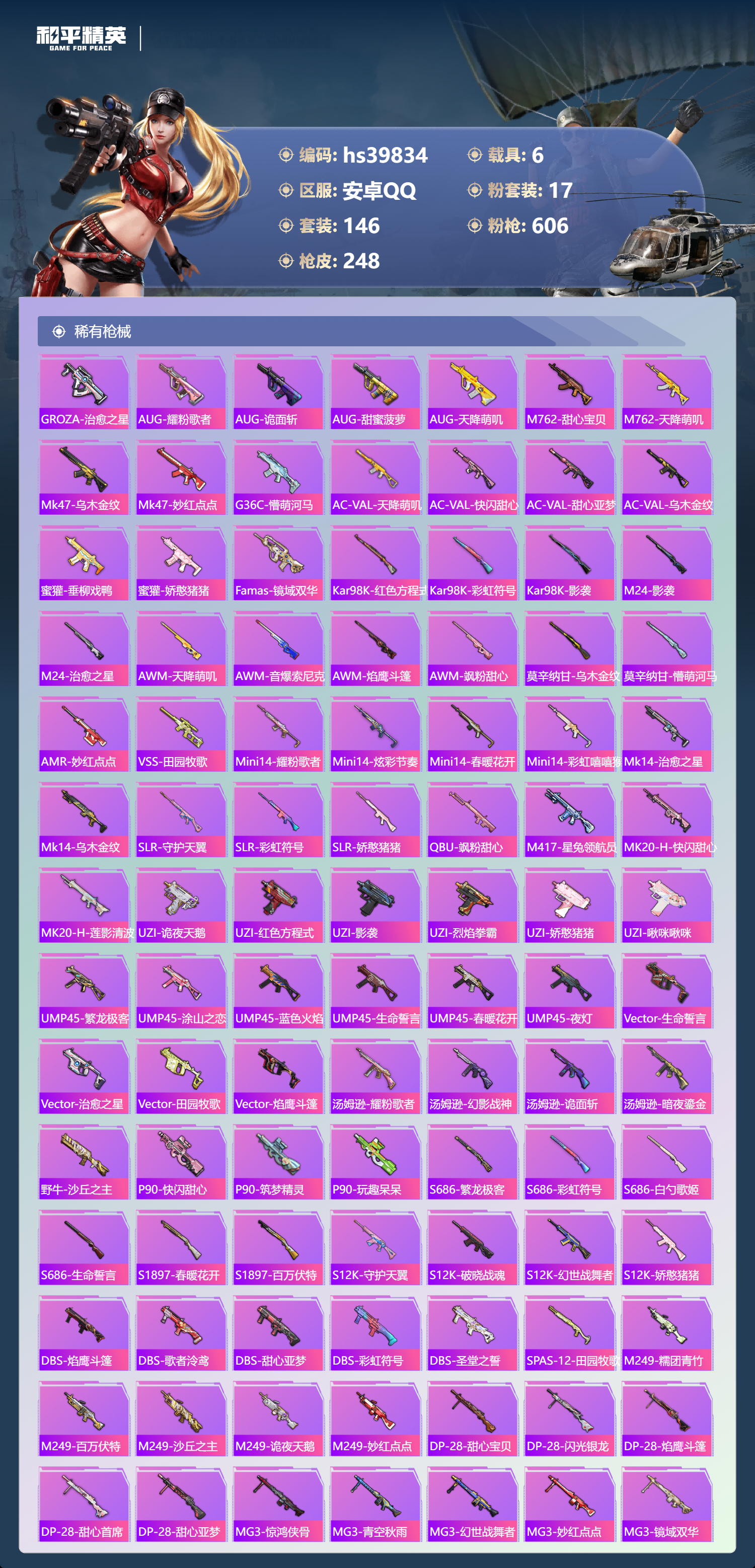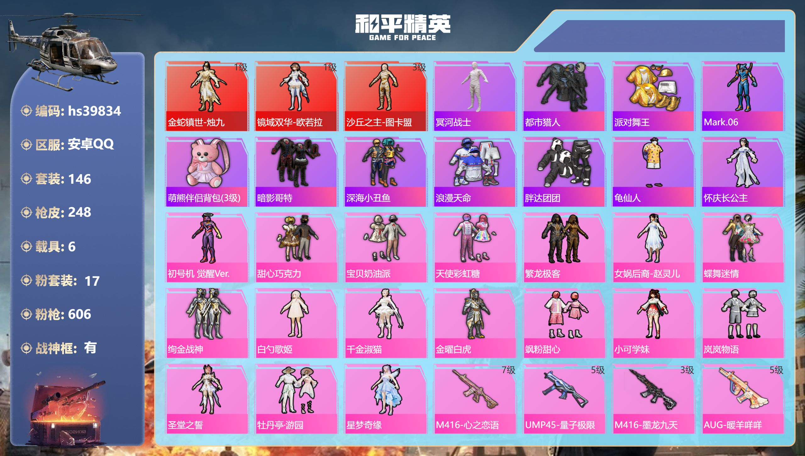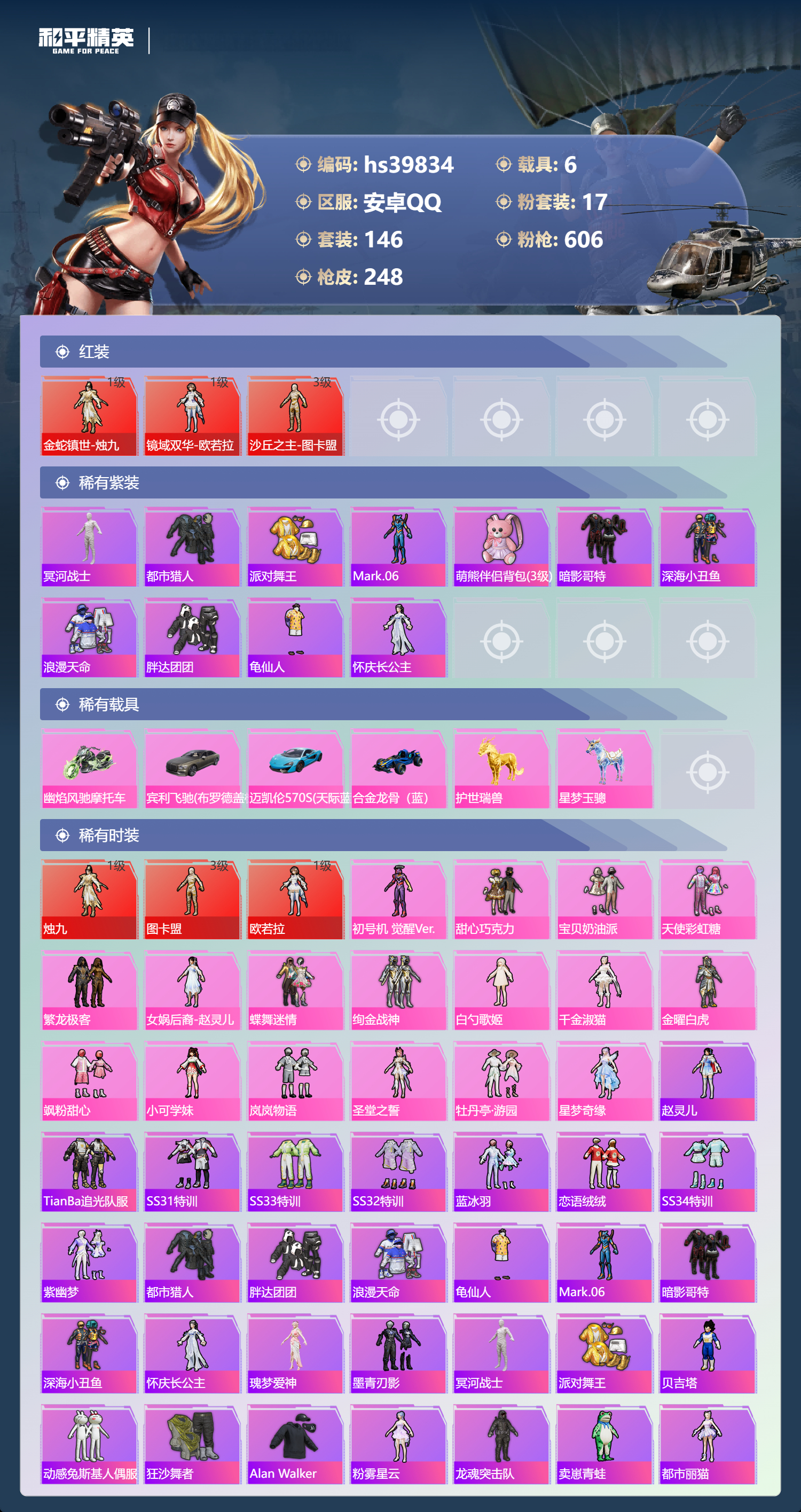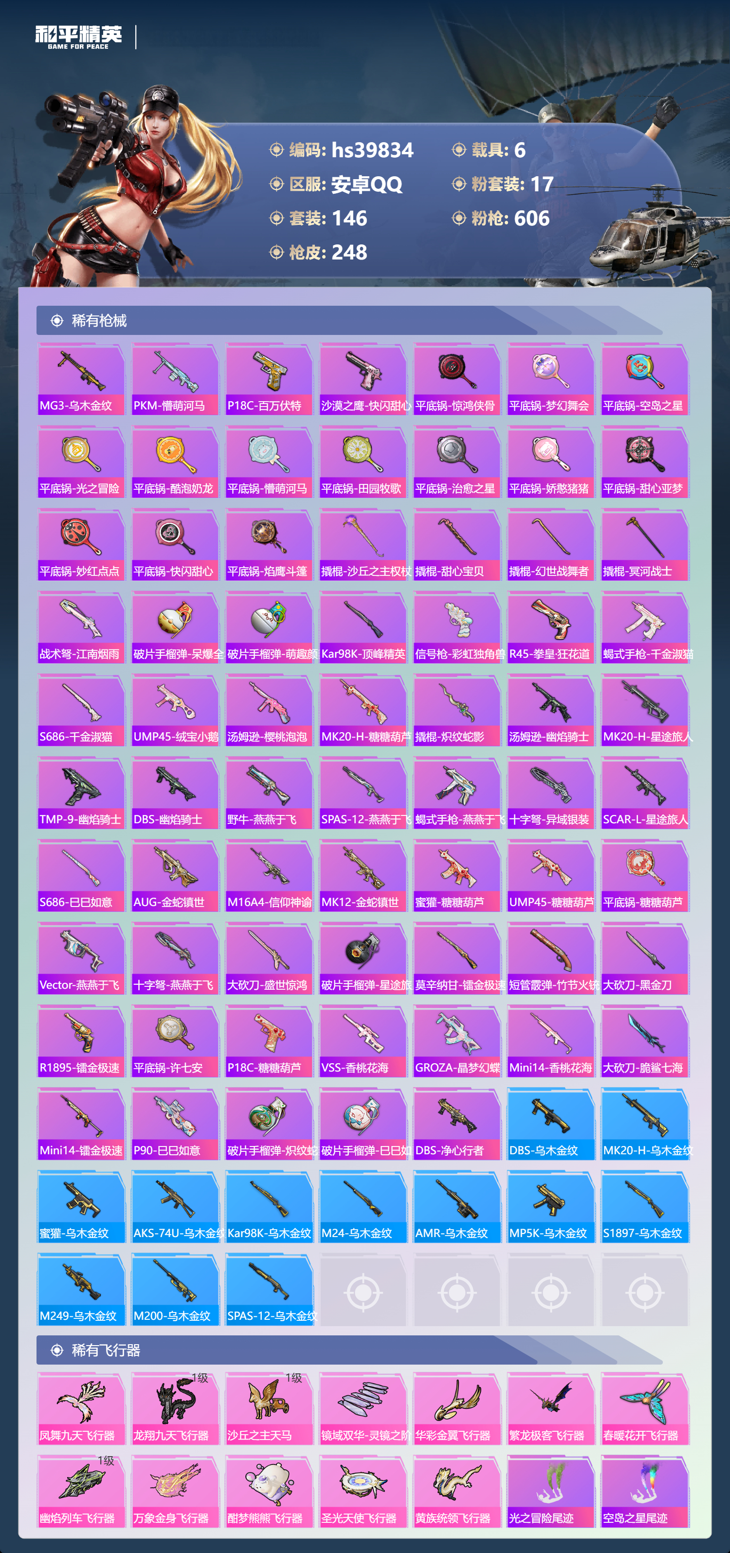 【11064456】【可二次】【安卓QQ】合金龙骨蓝色 龟仙人 木乃伊 金曜白虎 漫步者 P90-沙丘之主 都市猎人 镜域双华-欧若拉 沙丘之主-图卡盟 UMP45-量子极限 M416-心之恋语 深海小丑鱼 影双刃 蝶舞迷情 浪漫天命 胖达团团 M24-镜域双华 星梦玉骢 绚金战神 繁龙极客飞行器 岚岚物语 圣光天使飞行器 甜心巧克力 迈凯伦570S 天际蓝 狂沙舞者 龙翔九天飞行器 黄族统领飞
