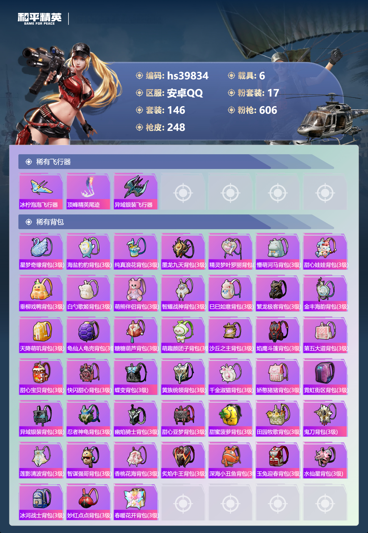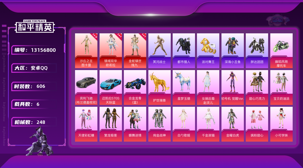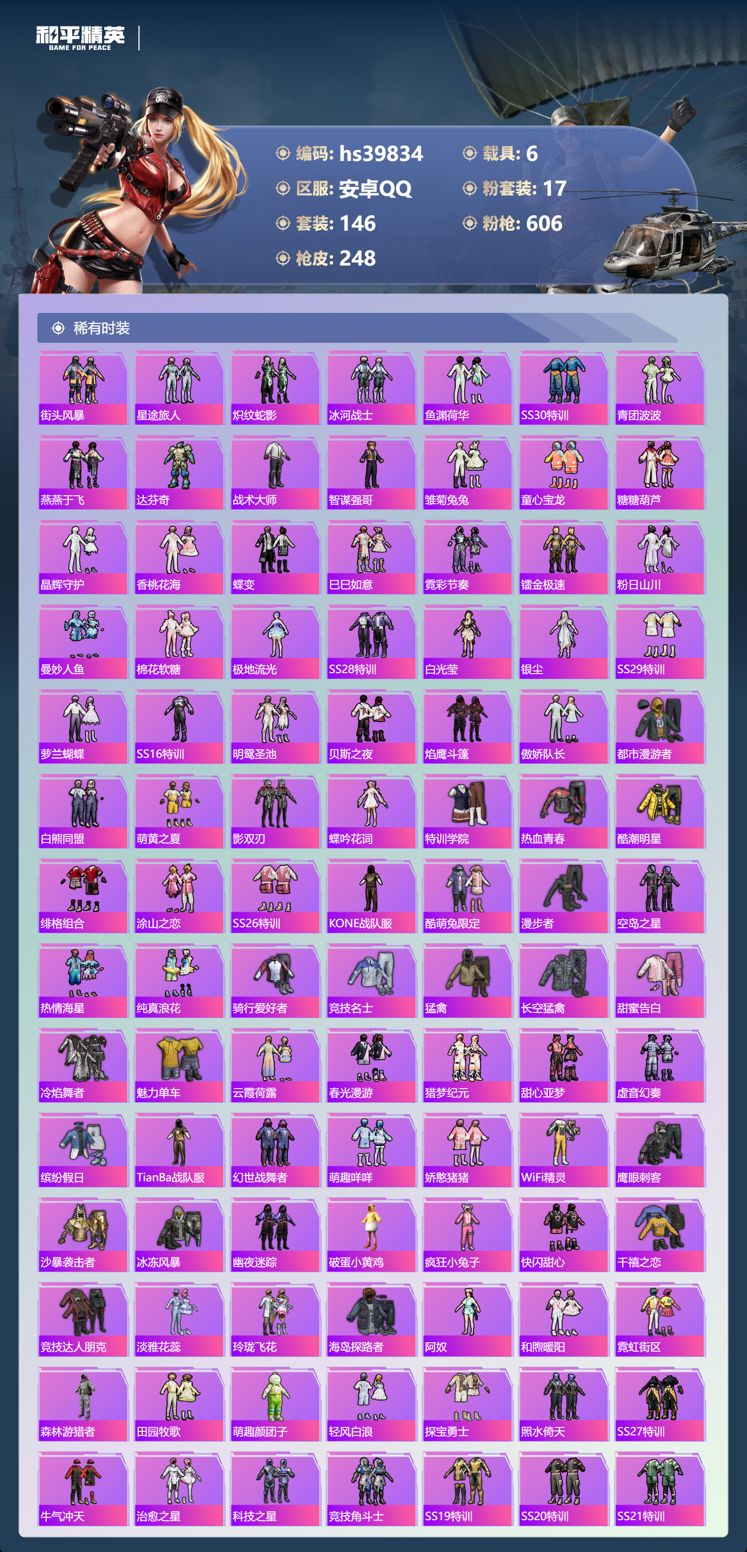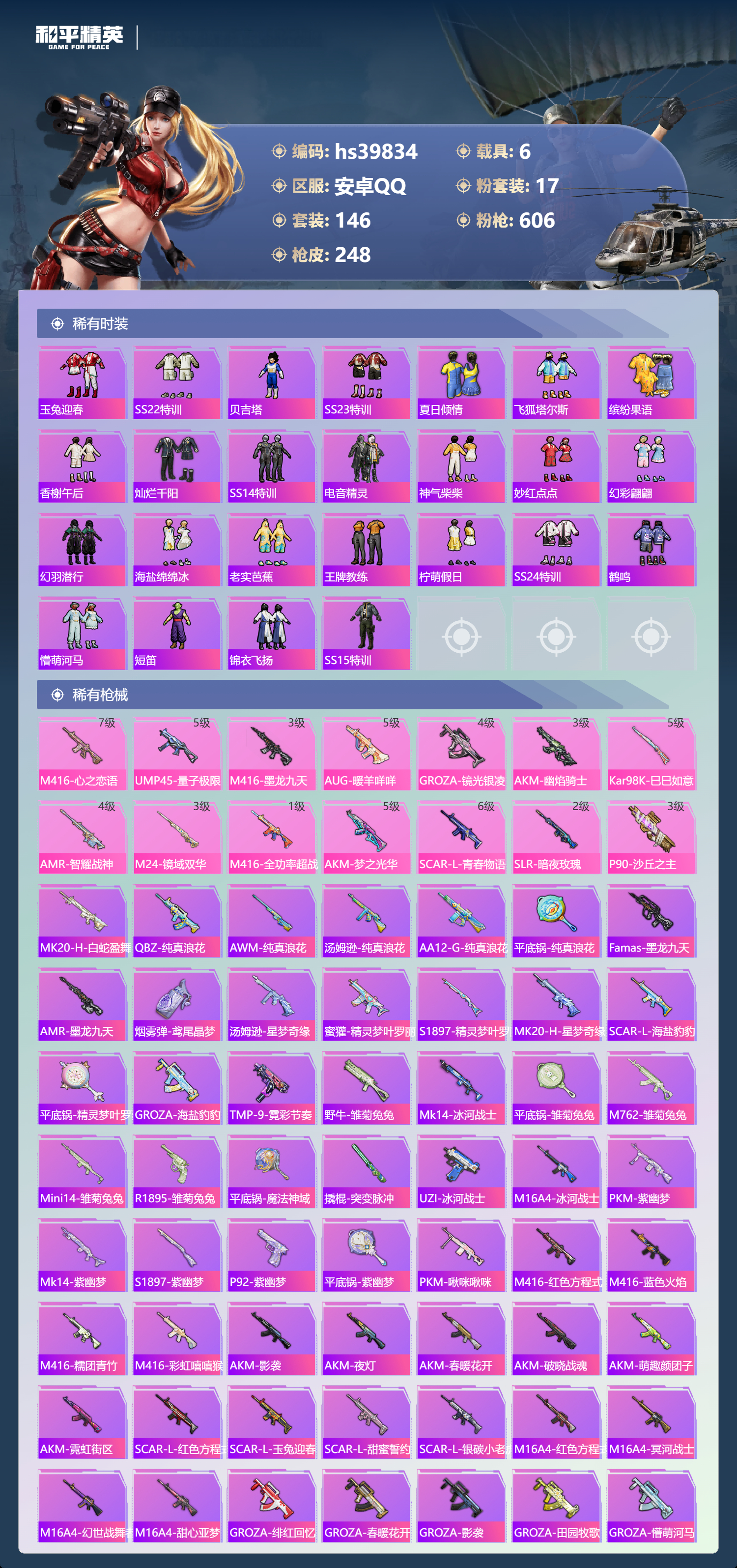 【11064456】【可二次】【安卓QQ】合金龙骨蓝色 龟仙人 木乃伊 金曜白虎 漫步者 P90-沙丘之主 都市猎人 镜域双华-欧若拉 沙丘之主-图卡盟 UMP45-量子极限 M416-心之恋语 深海小丑鱼 影双刃 蝶舞迷情 浪漫天命 胖达团团 M24-镜域双华 星梦玉骢 绚金战神 繁龙极客飞行器 岚岚物语 圣光天使飞行器 甜心巧克力 迈凯伦570S 天际蓝 狂沙舞者 龙翔九天飞行器 黄族统领飞