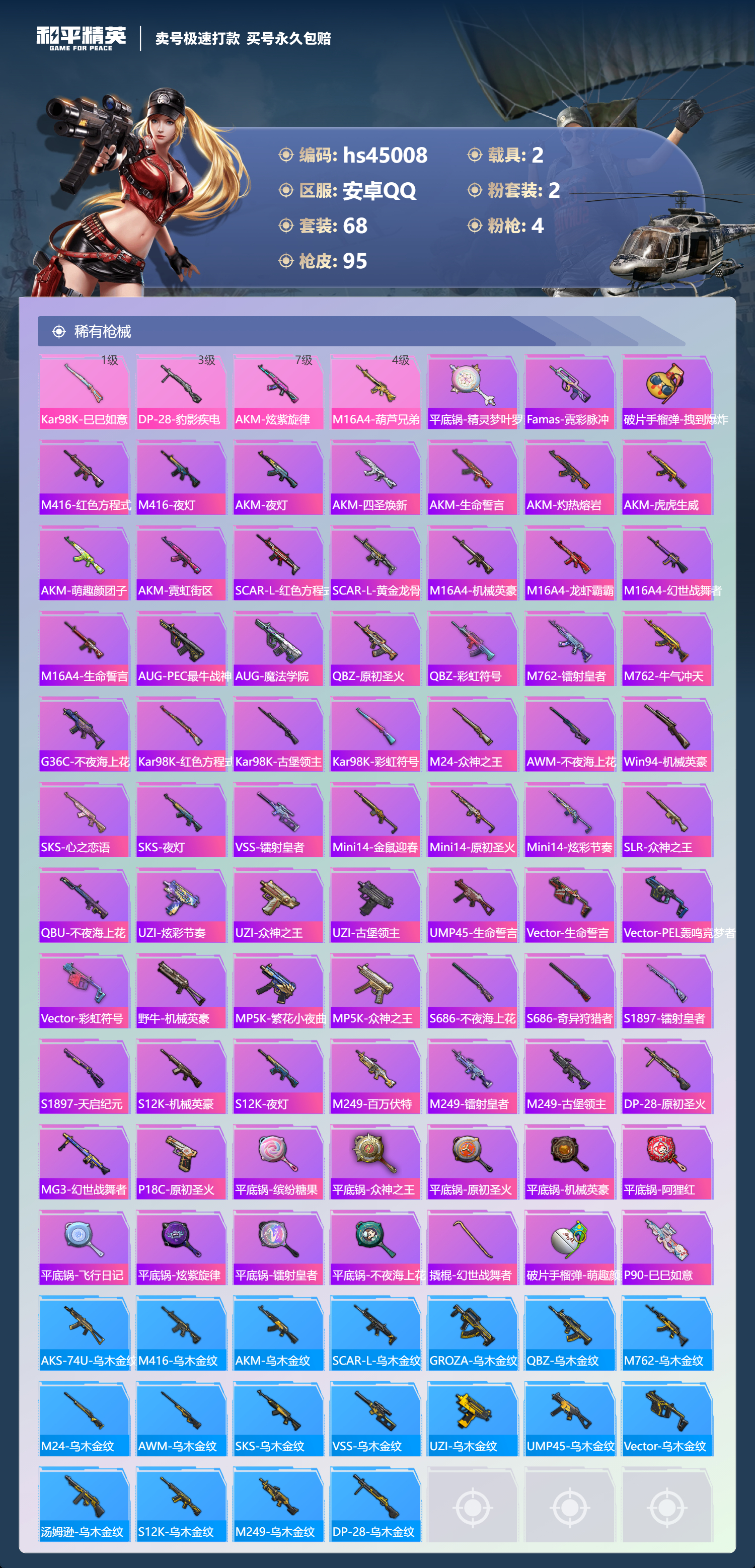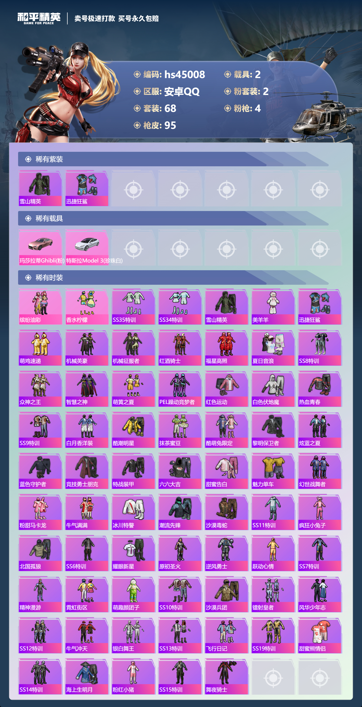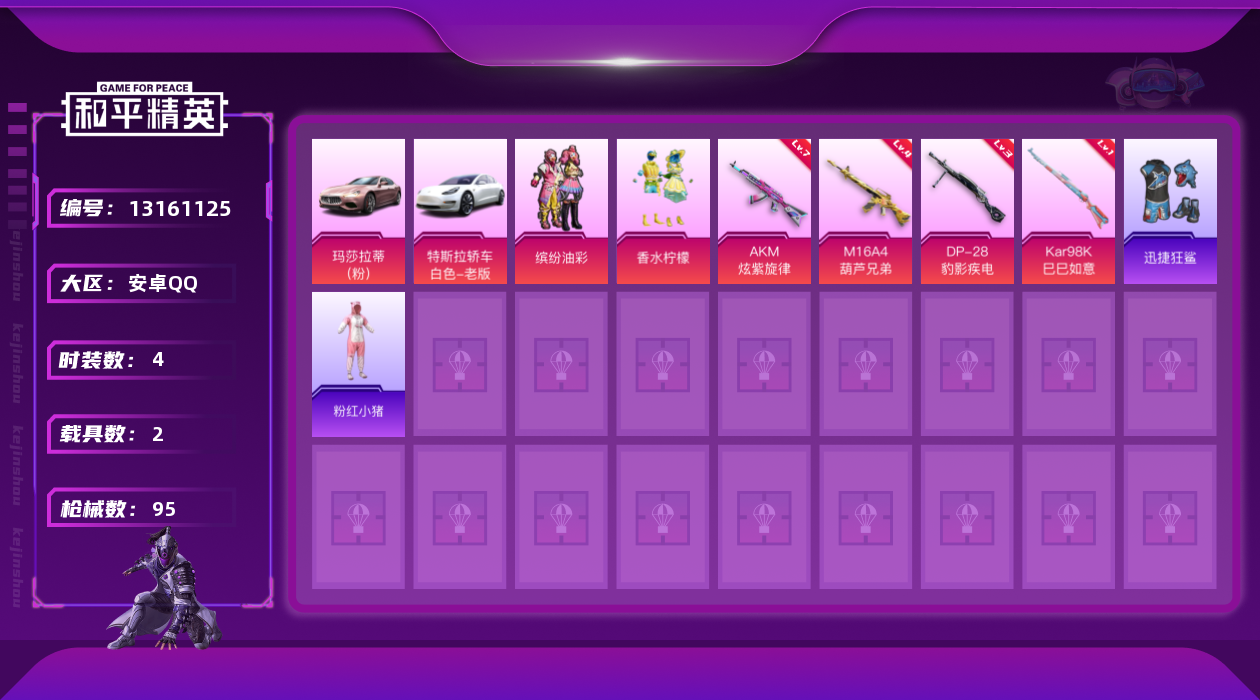 【11065160】【不可二次】【安卓QQ】S686-奇异狩猎者 特斯拉3白色 AUG-PEC最牛战神 粉甜马卡龙 迅捷狂鲨 M249-古堡领主 特斯拉3银色 机械英豪 AKM-炫紫旋律 香水柠檬 白月香洋装 缤纷油彩 AUG-魔法学院 粉红小猪 玛莎拉蒂粉色 抹茶蜜豆 风华少年志 雪山精英 M16A4-葫芦兄弟